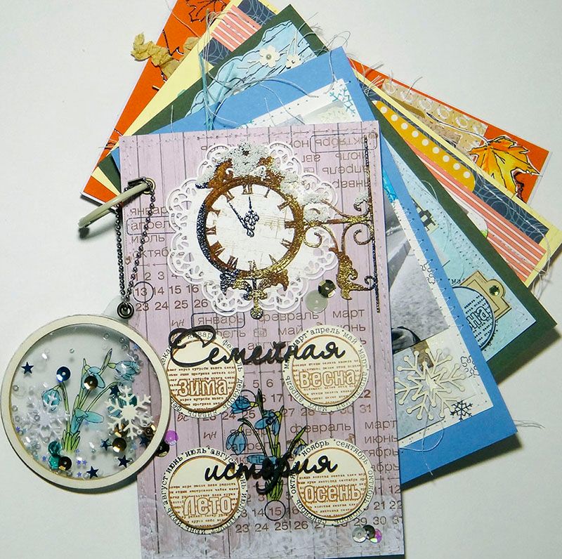 На одной из подложек с акварельным фоном хорошо пристроился штамп «Тепло семьи».
