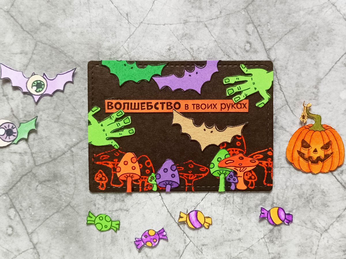 Вторая карточка на оранжевой основе - отштамповала по низу грибочки трёх размеров из того же набора, а затем несколько поверх. Старалась располагать их на разном уровне, добавляя этим глубину работе. Руки по бокам я добавила для поддержания смысла надписи "Волшебство в твоих руках", а заодно и зеленого цвета.