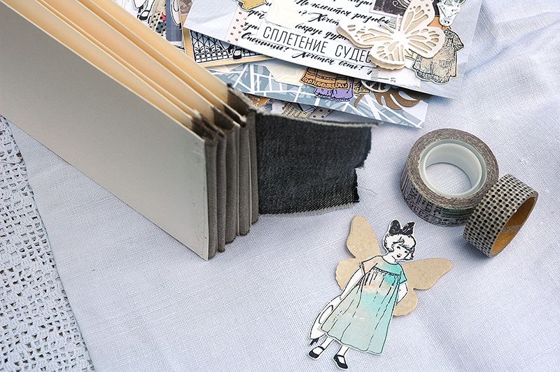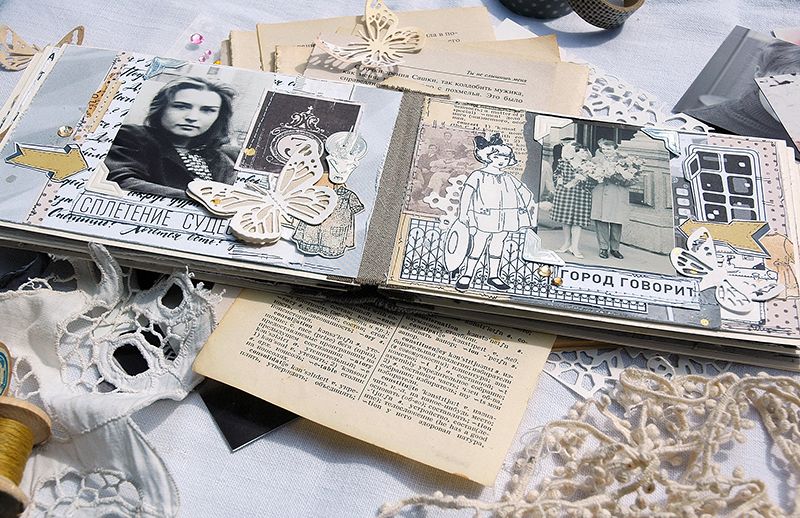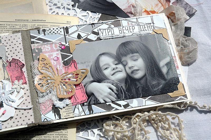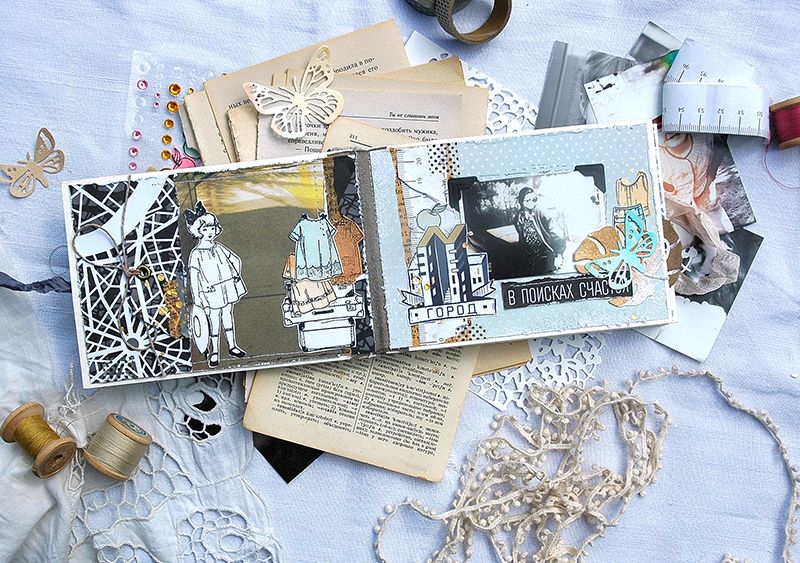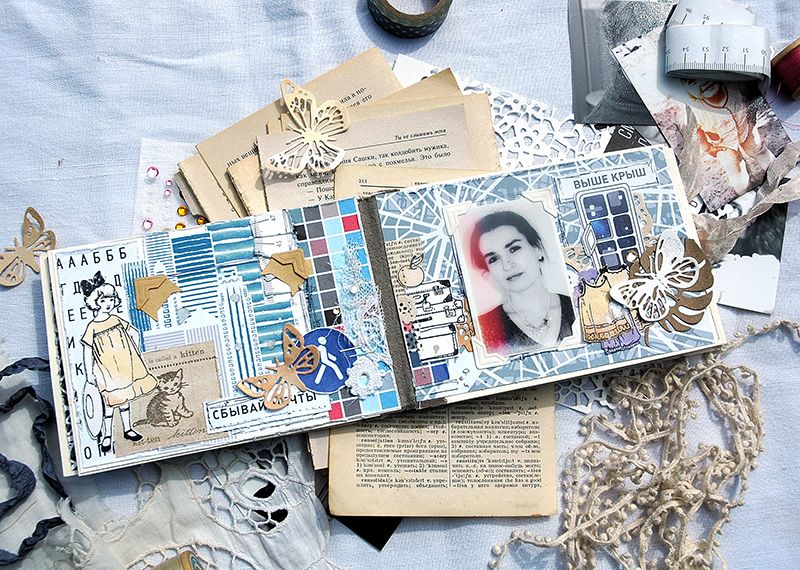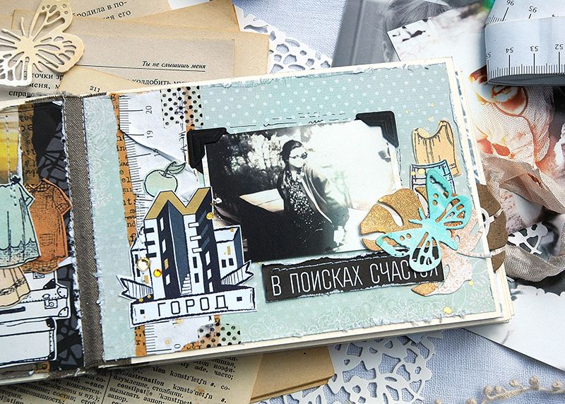 Все развороты я буду показывать со случайными фотографиями, чтобы было видно, что они вполне вписываются в альбом. Первый разворот с кармашком для тега. И соединяем разную бумагу. Сантиметр из Икеа тоже пригодился.