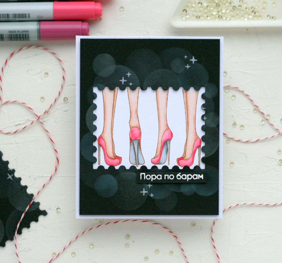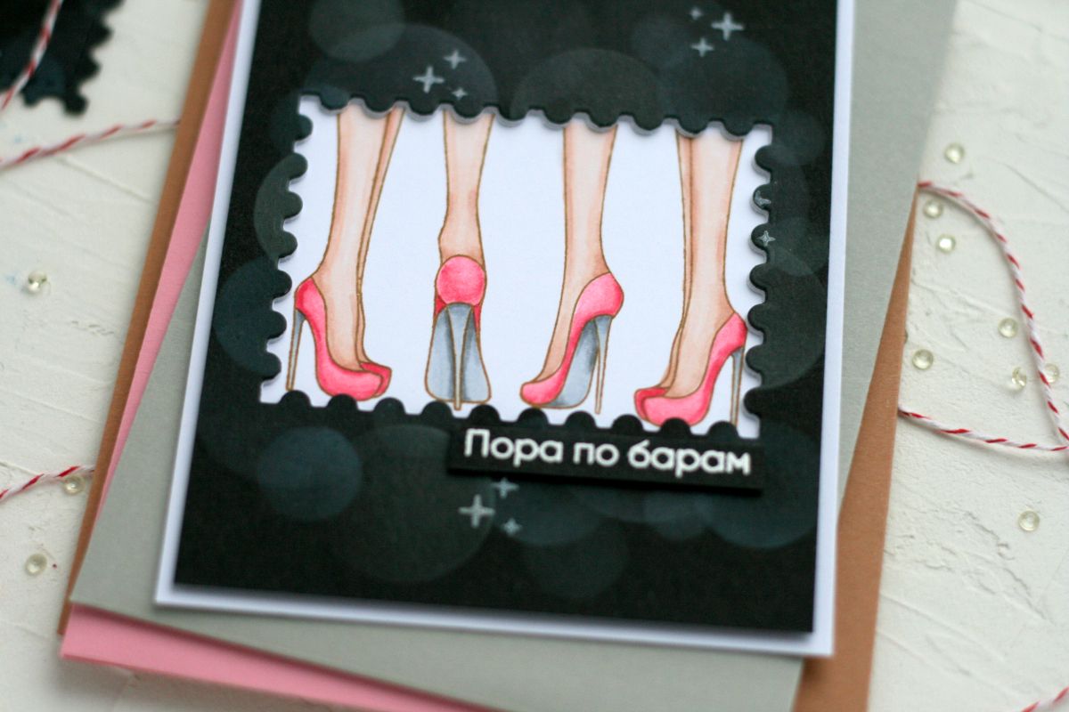На первой открытке три подружки собрались вечером потусить. Ножки раскрашены спиртовыми маркерами. На внешней темной панели тонировка боке с помощью трафарета кругов. Надпись "Пора по барам" горячим эмбоссингом и белой пудрой приподнята на отдельной полоске.