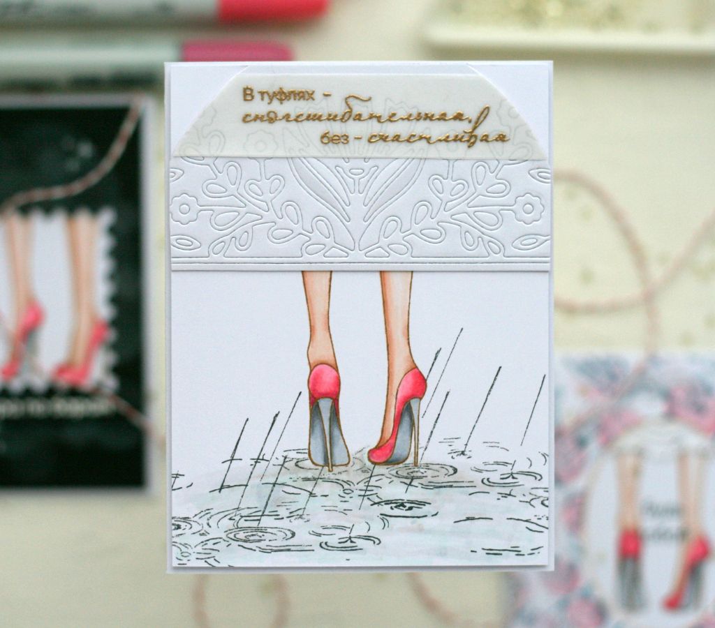 На второй открытке одна из подружек идет в шикарной белой юбке (или платье) по лужам. Легко догадаться, что ножки подружек замаскированы перед штампингом)). Дождевые лужи отштампованы с помощью маскинга. Сверху добавлена надпись на кальке "В туфлях и без них" , чтобы минимально закрыть юбку.