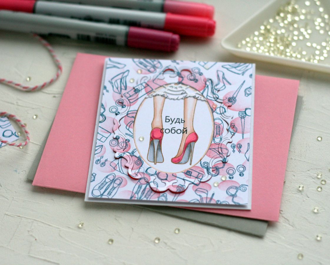 Следующая открытка усложнена. Отдельно сделала фоновую панель с помощью трафарета и фонового штампа, в центре которой оставила центральую пару ног, но нераскрашенную. Отдельно сделала панель с отштампованными и раскрашенными ногами подружек. Потом с помощью ножа для вырубки вырезала рамку на одной и на второй панели. Поменяла местами. Центральную раскрашенную часть ног вставила в фоновую панель. К ногам добавила юбку (или платье).