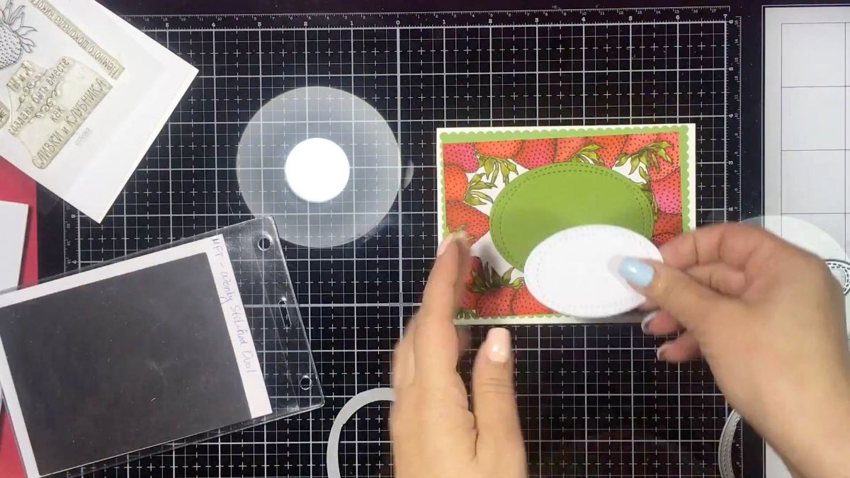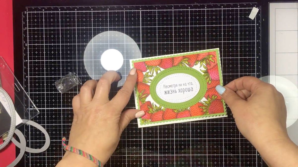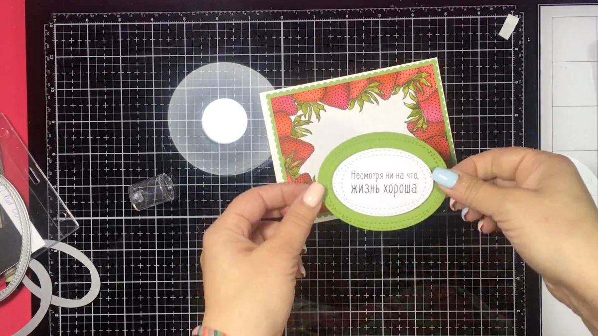 Ну все, поставили оттиск. Теперь слегка выделяем надпись, и сажаем овальную деталь с ней на вспененный скотч, а иначе ягодки сильно перетянут на себя внимание. Любая открытка несет некий посыл, мы ей пытаемся что-то сказать. И это надо выделить.
