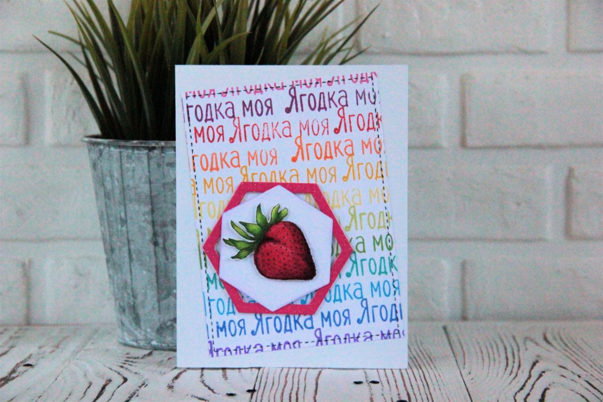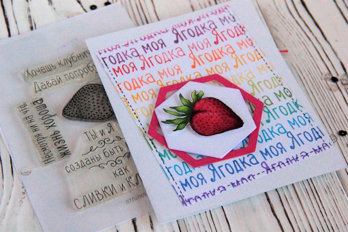 Вторая открытка сначала хотела быть целым клубничным фоном! Прямо сильно хотела. Но, наштамповав клубничек по периметру, мне так понравился результат, что я попробовала сначала раскрасить эти клубнички и посмотреть, что из этого получится. А получилось-то здорово!!! Хотя, может это мне так кажется. Что скажете?