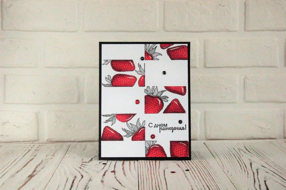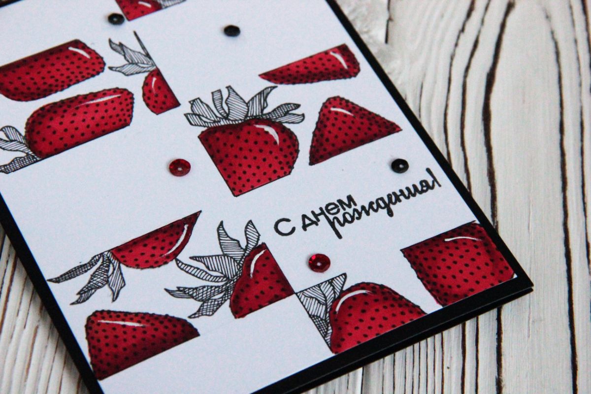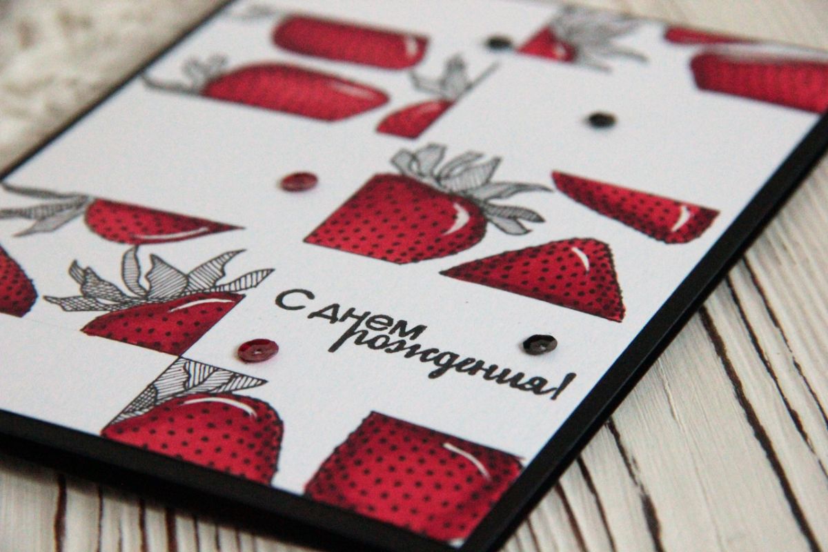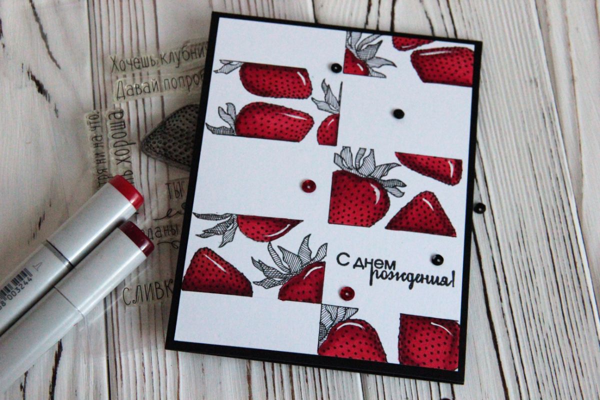 Я использовала красный цвет и черный цвета. Вместо зеленого взяла и заштриховала в разных линиях листики клубники. Добавила надпись. С днем рождения, которая жила в моей мастерской уже очень-очень давно и получилось очень лаконично.