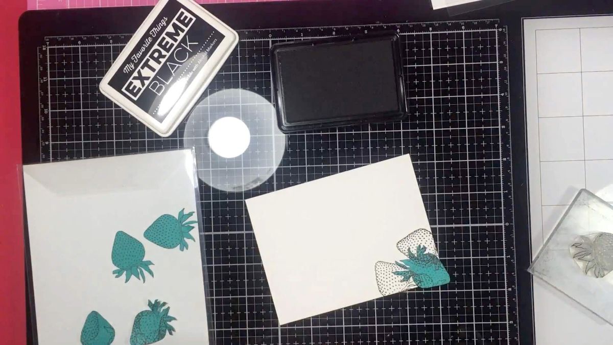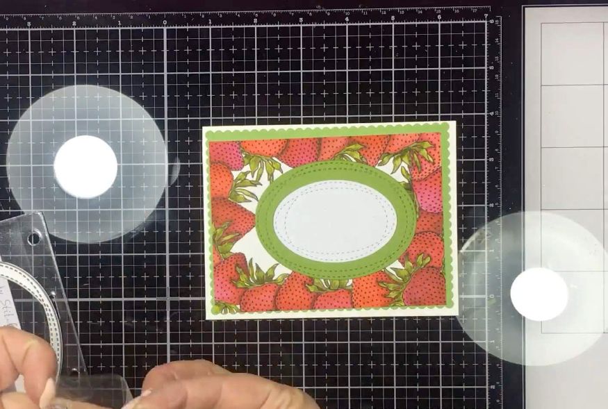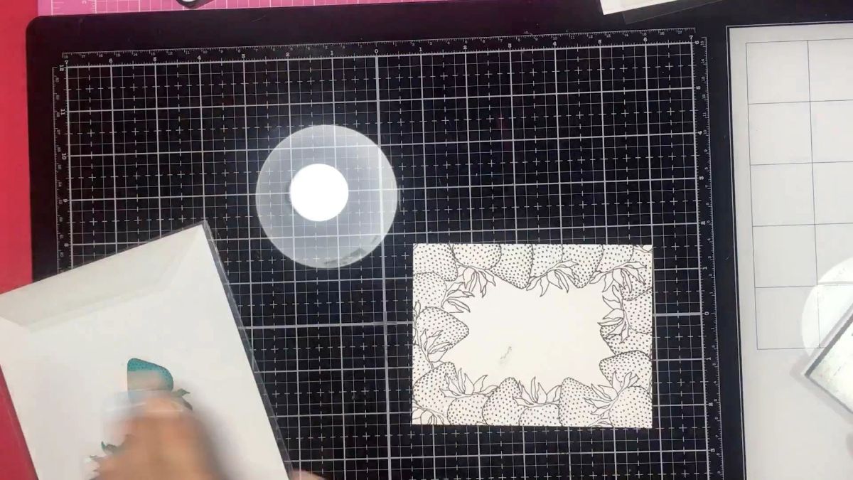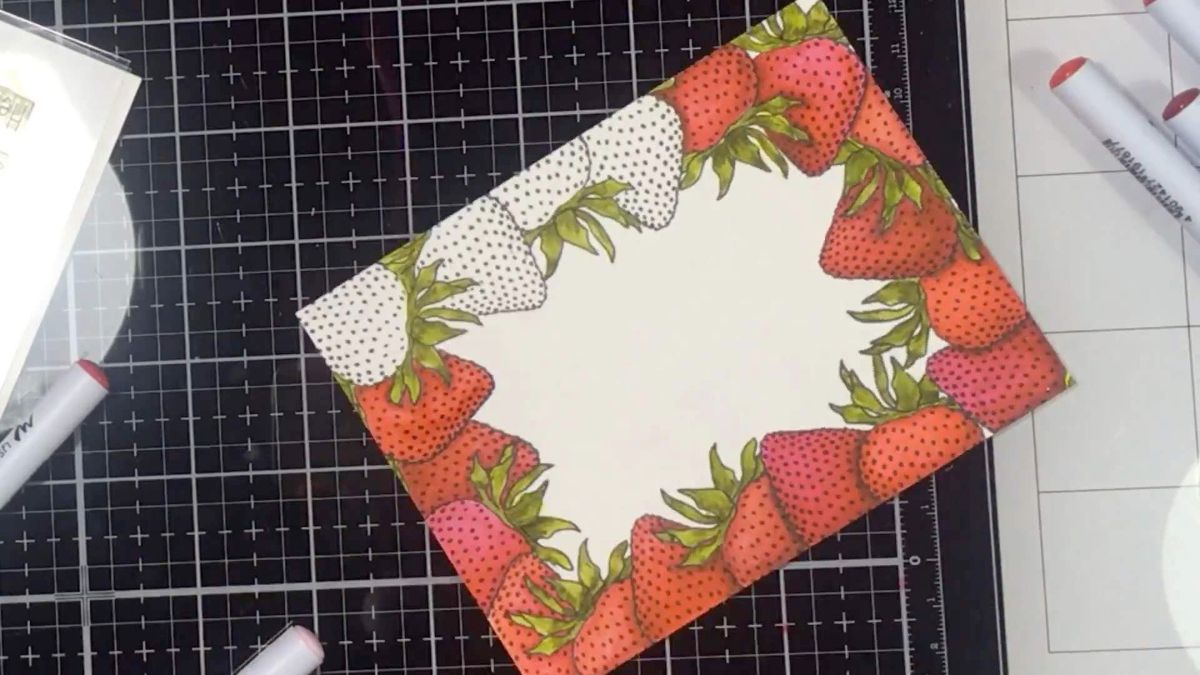 Ставим оттиски клубнички по всему периметру белой подложки, которая станет основной, лицевой частью нашей открытки. Используем маскинг, чтобы придать объема нашей рамке. Про маскинг тоже уже много говорено, не буду углубляться. Должно получится, что-то вроде вот этого :