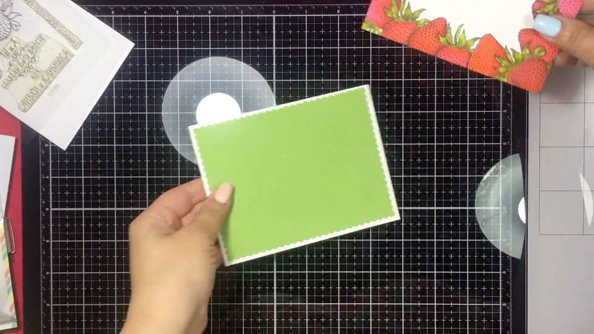 Итак, берем штамп, я беру, конечно, клубничку. Еще нам необходим штамп надпись, у меня это штамп надпись Жизнь хороша , основа для открытки, и две подложки. Лицевая (белая) и подложка основа: