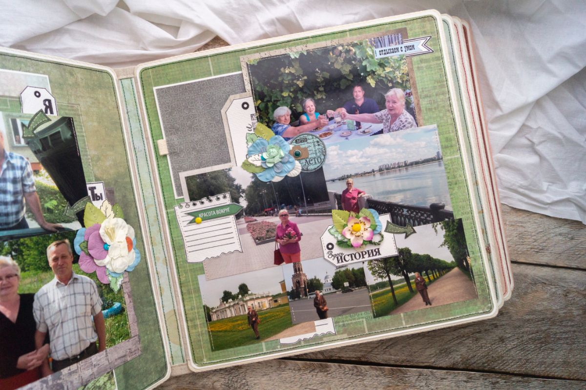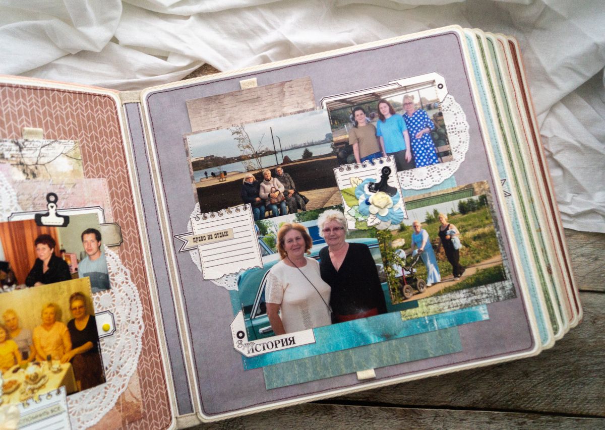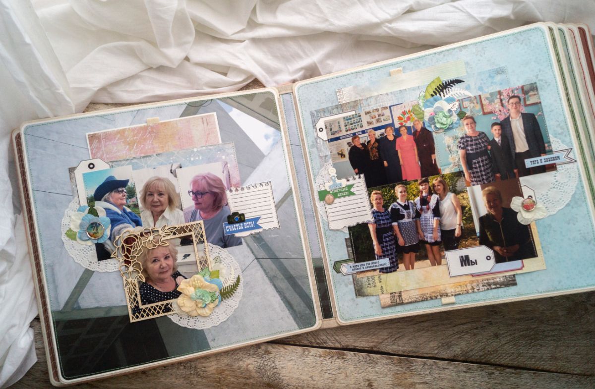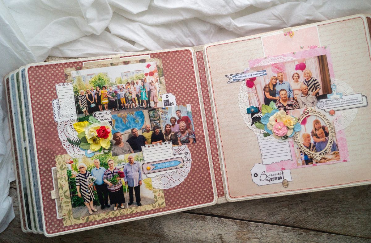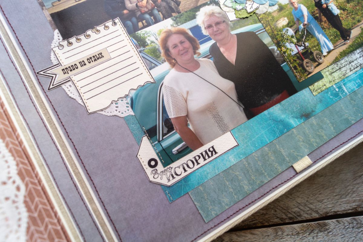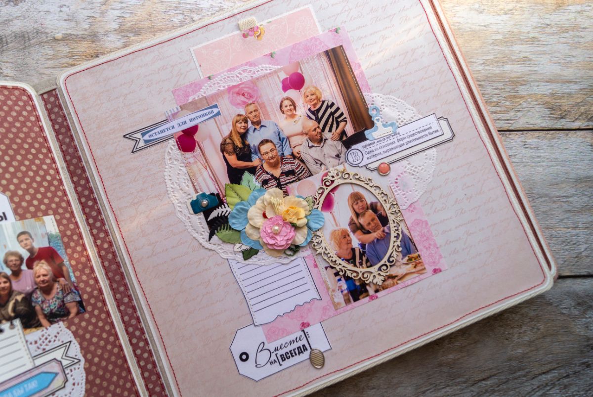 Фото разноплановые - как по сюжетам, так и по временным отрезкам жизни именинницы. Пожалуй, только в этом и была сложность - рассортировать фото по 6-ти разворотам на подтемы под рабочими названиями: посиделки, работа/коллеги, в кругу семьи, на отдыхе, день рождения, свадьбы. В остальном работа шла легко.