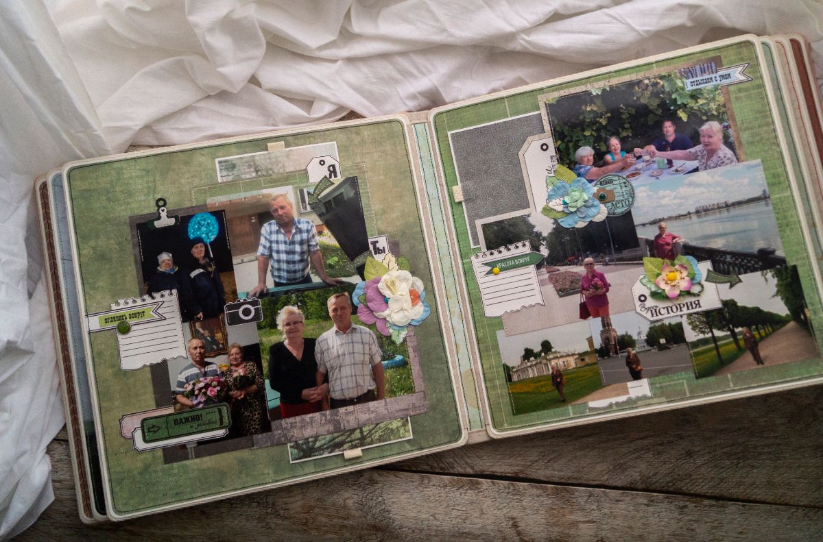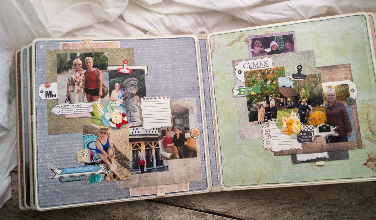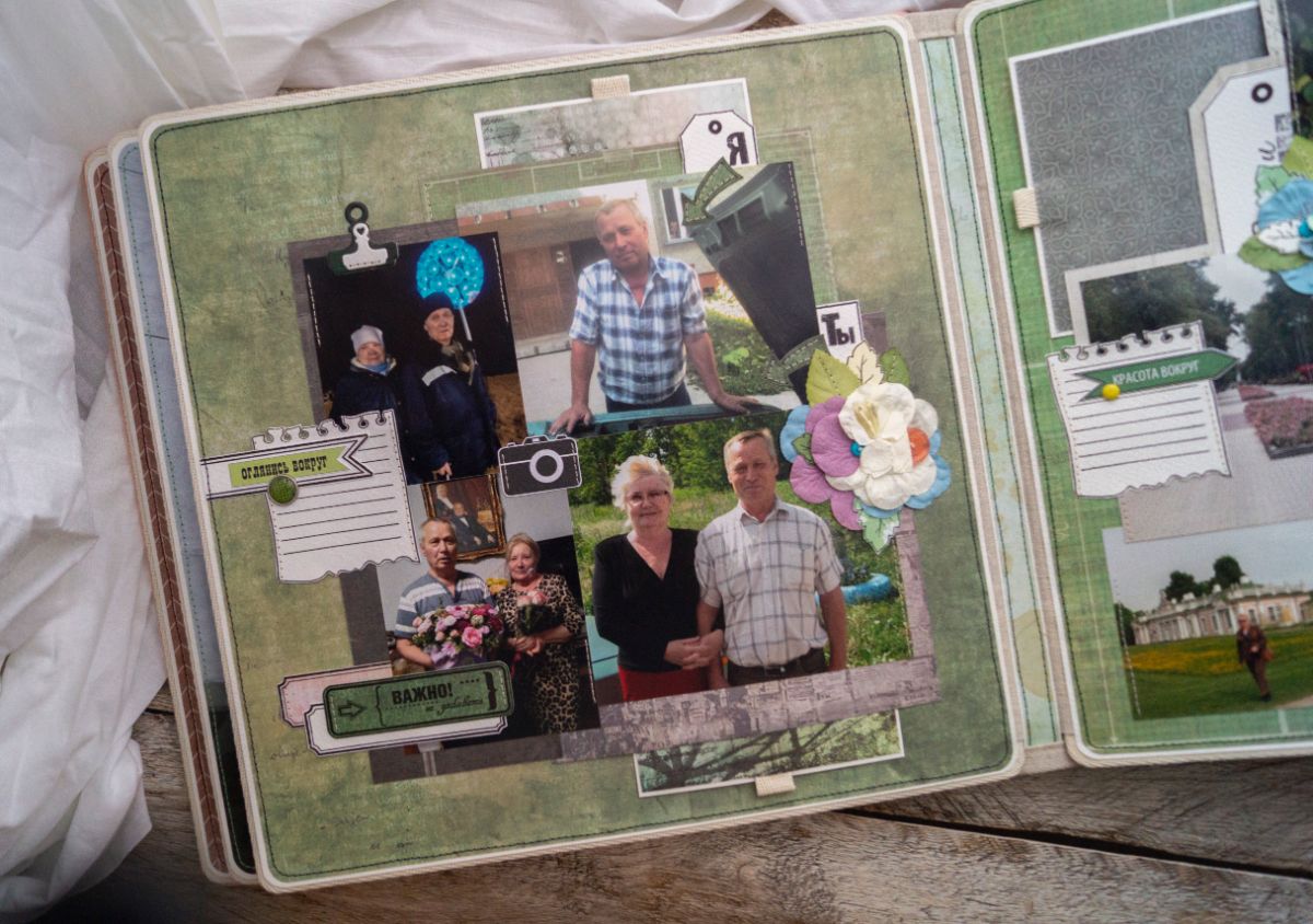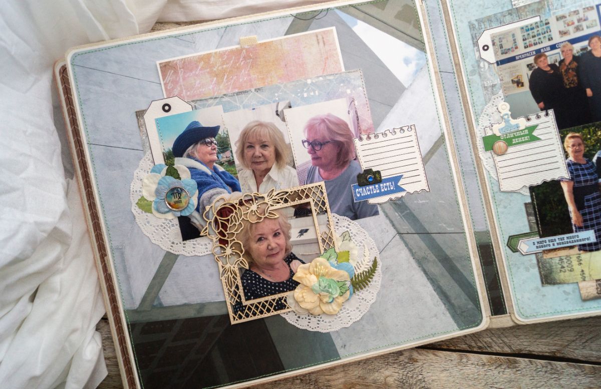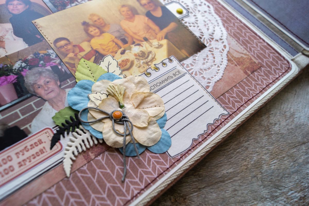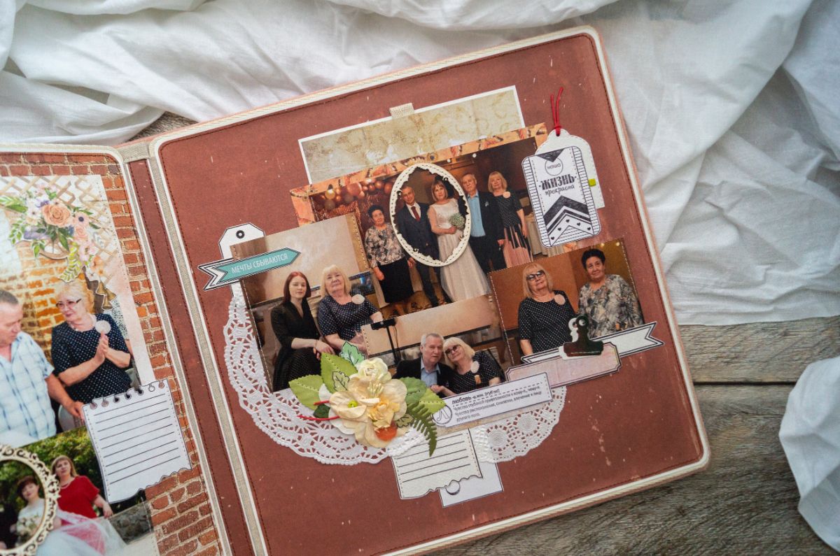 Фото разноплановые - как по сюжетам, так и по временным отрезкам жизни именинницы. Пожалуй, только в этом и была сложность - рассортировать фото по 6-ти разворотам на подтемы под рабочими названиями: посиделки, работа/коллеги, в кругу семьи, на отдыхе, день рождения, свадьбы. В остальном работа шла легко.