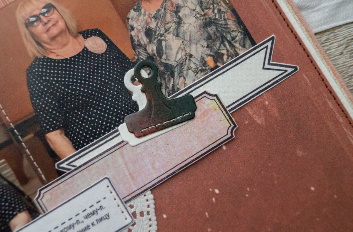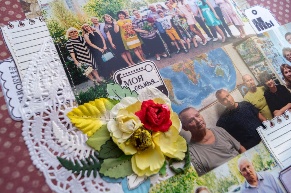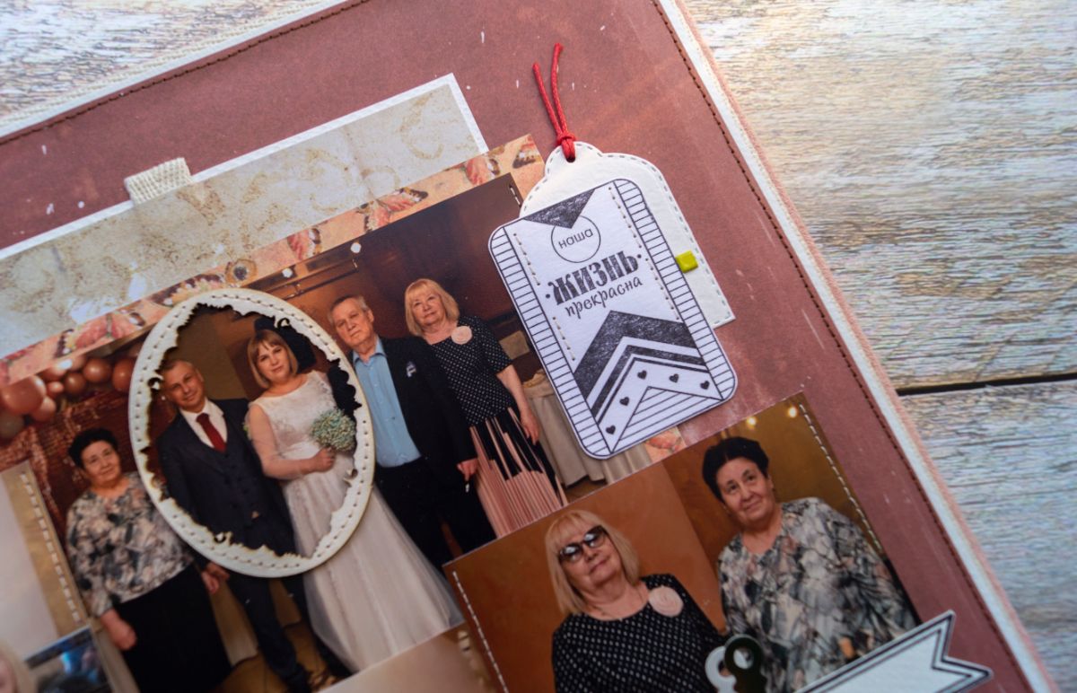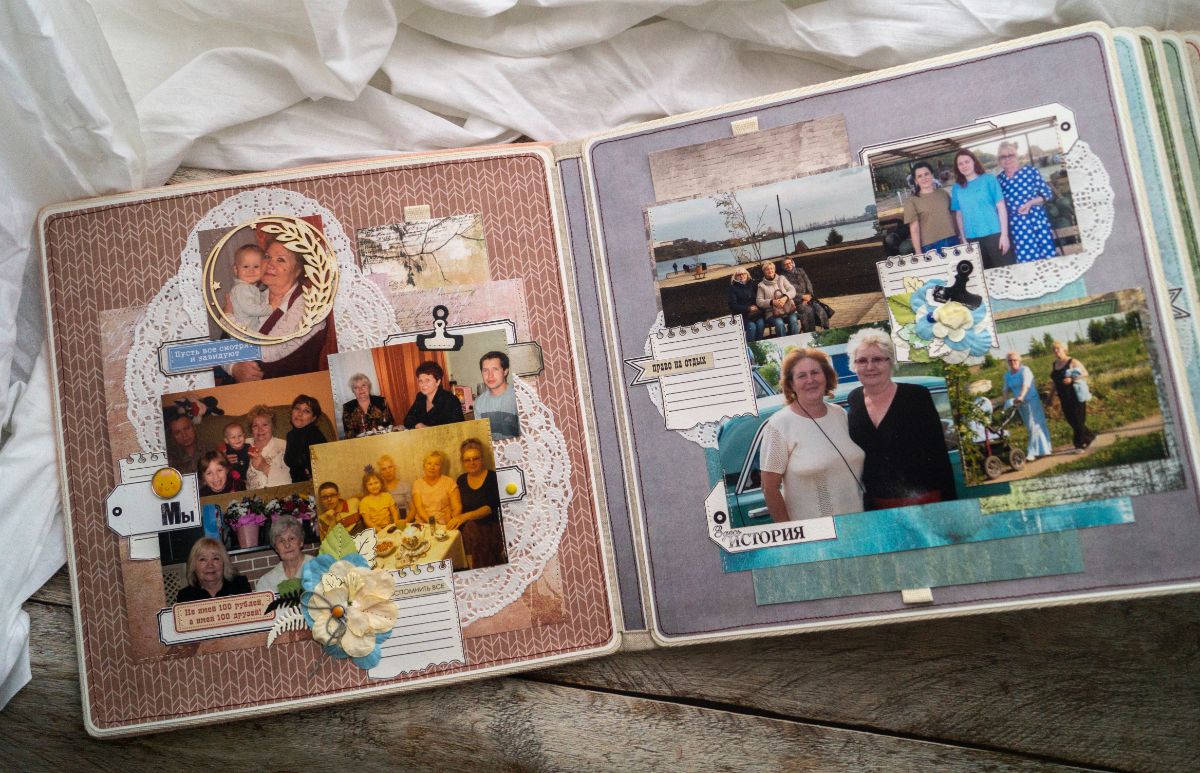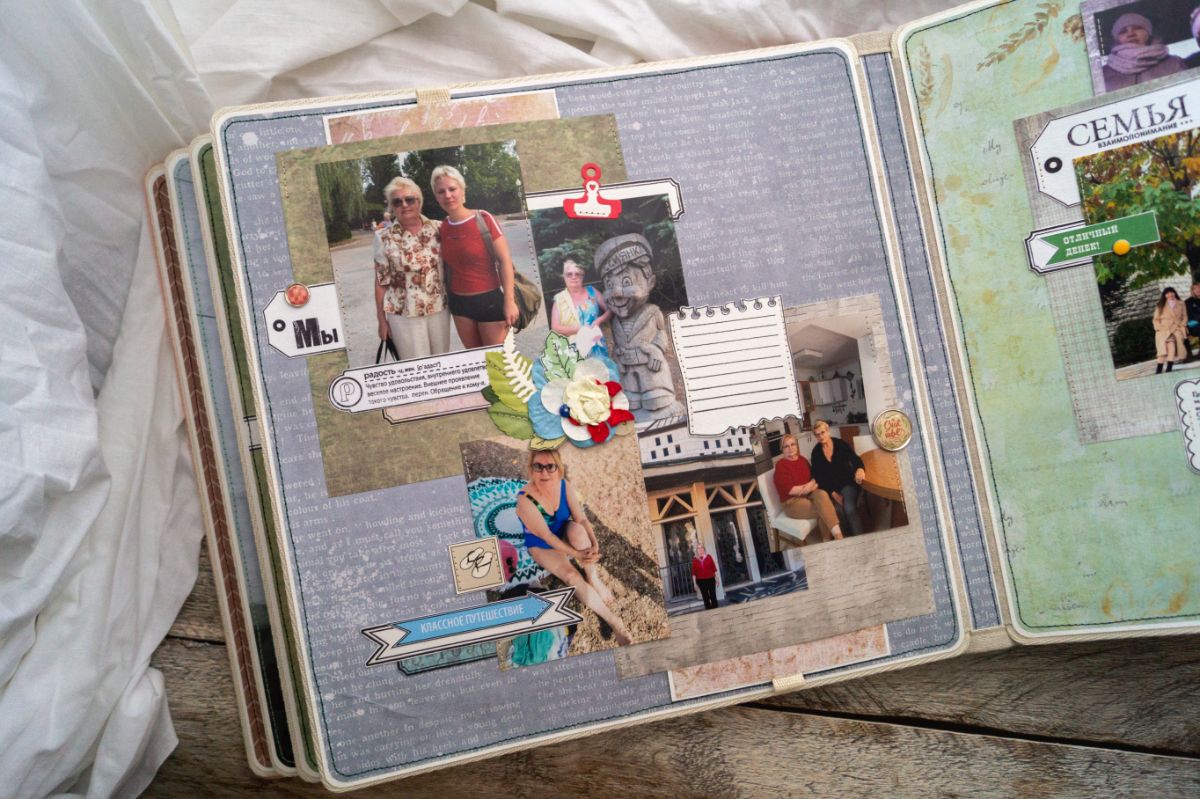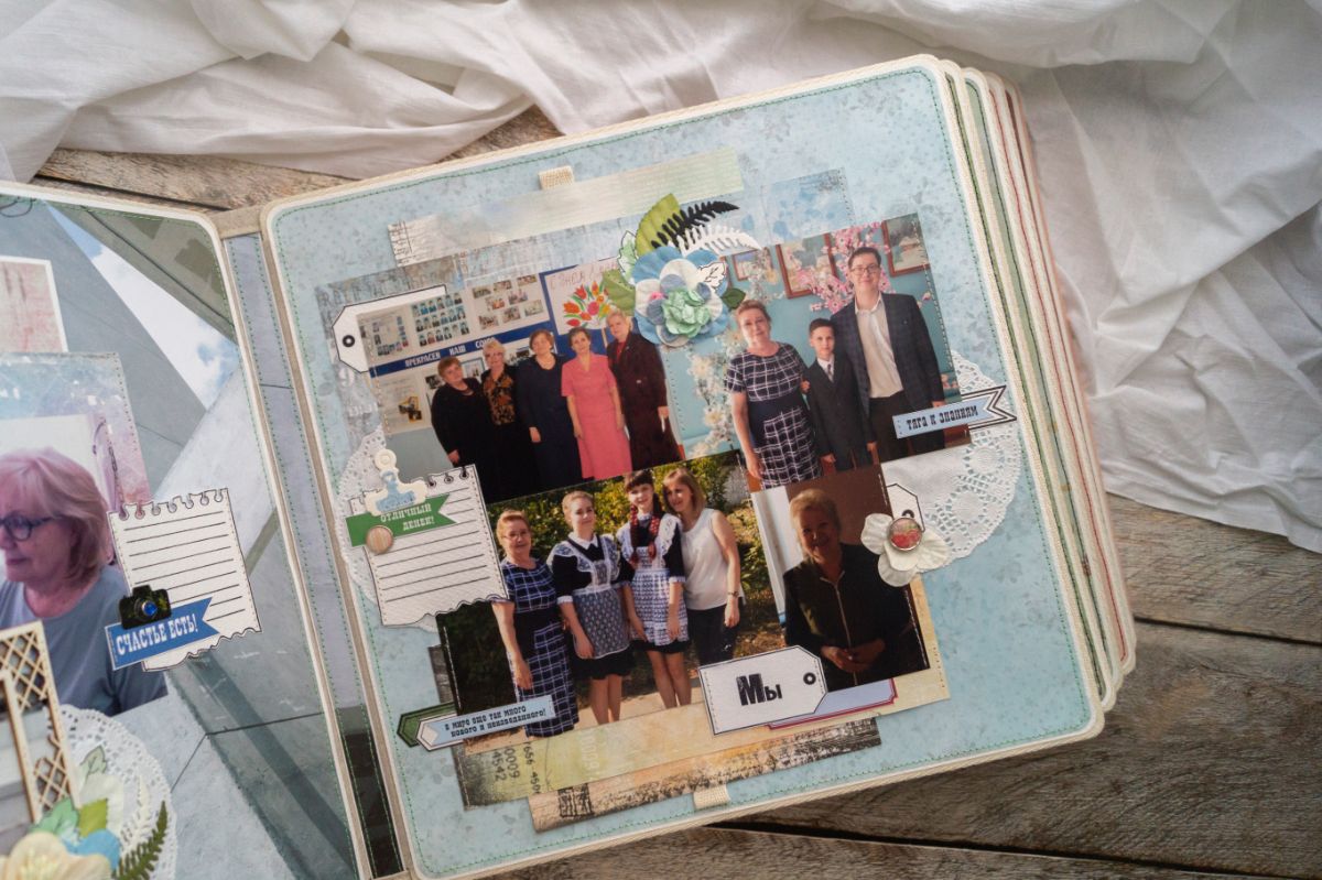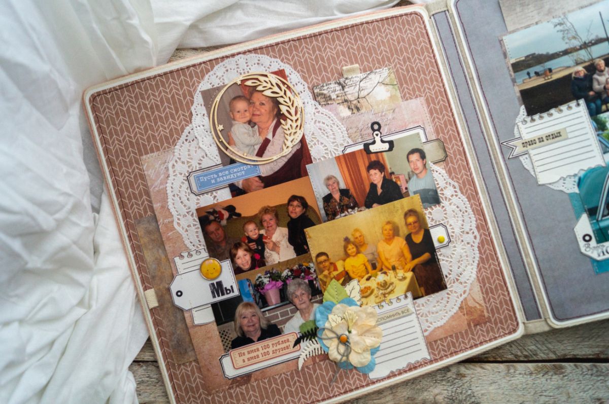 Фото разноплановые - как по сюжетам, так и по временным отрезкам жизни именинницы. Пожалуй, только в этом и была сложность - рассортировать фото по 6-ти разворотам на подтемы под рабочими названиями: посиделки, работа/коллеги, в кругу семьи, на отдыхе, день рождения, свадьбы. В остальном работа шла легко.