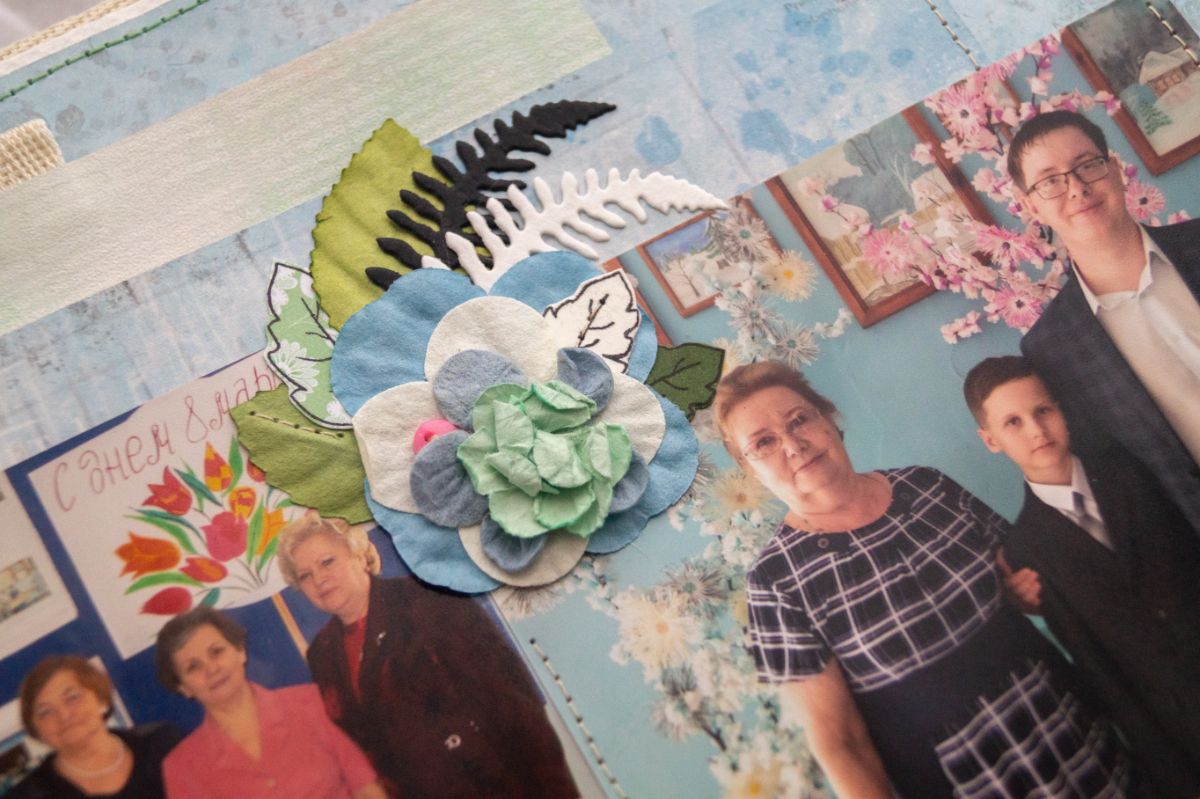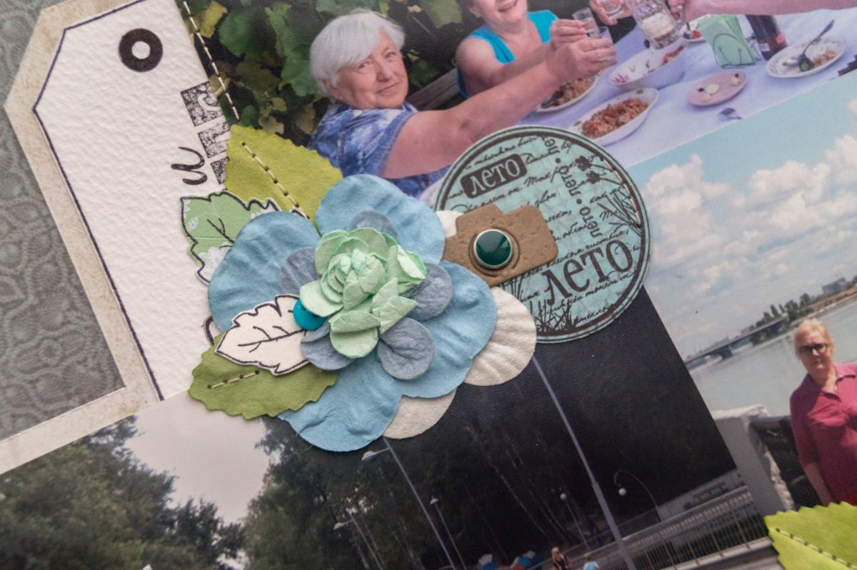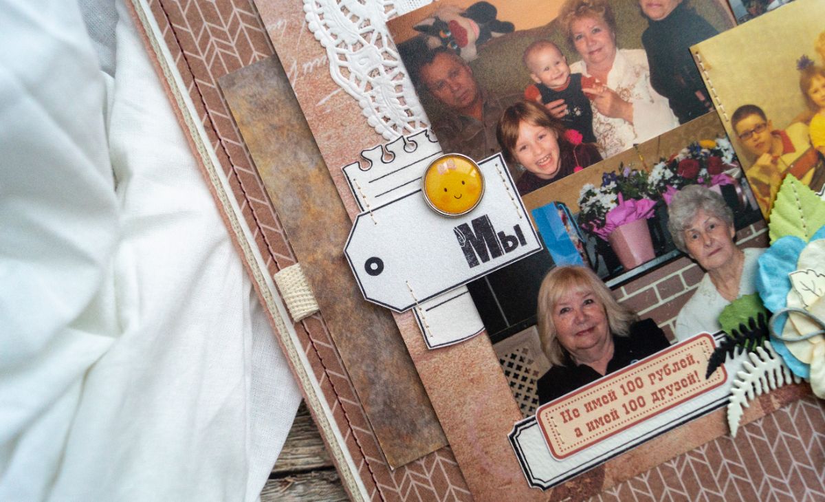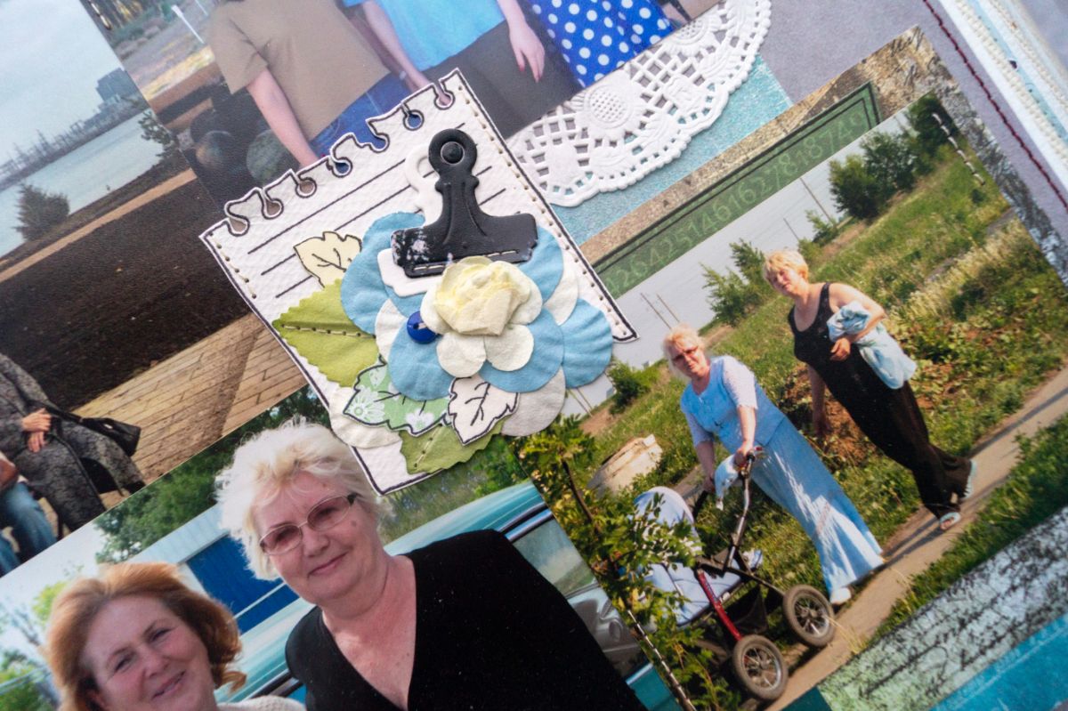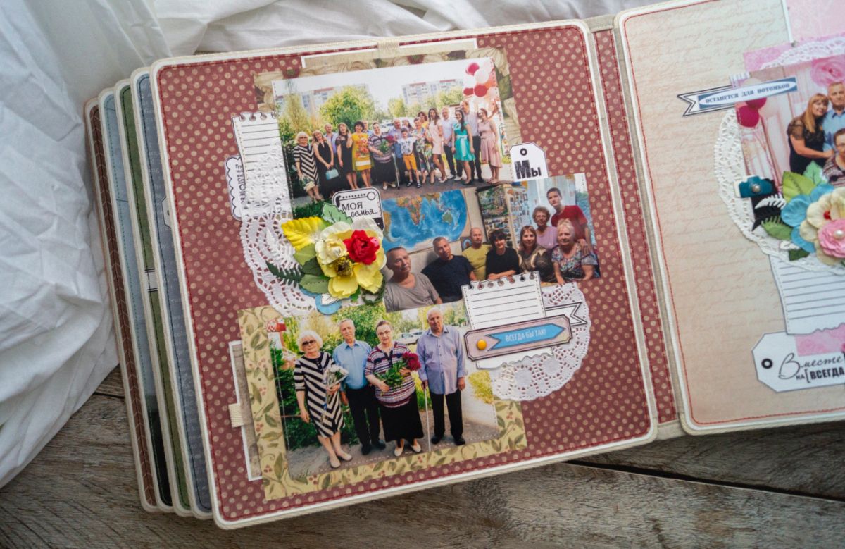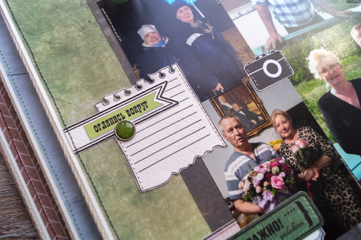 Фото разноплановые - как по сюжетам, так и по временным отрезкам жизни именинницы. Пожалуй, только в этом и была сложность - рассортировать фото по 6-ти разворотам на подтемы под рабочими названиями: посиделки, работа/коллеги, в кругу семьи, на отдыхе, день рождения, свадьбы. В остальном работа шла легко.