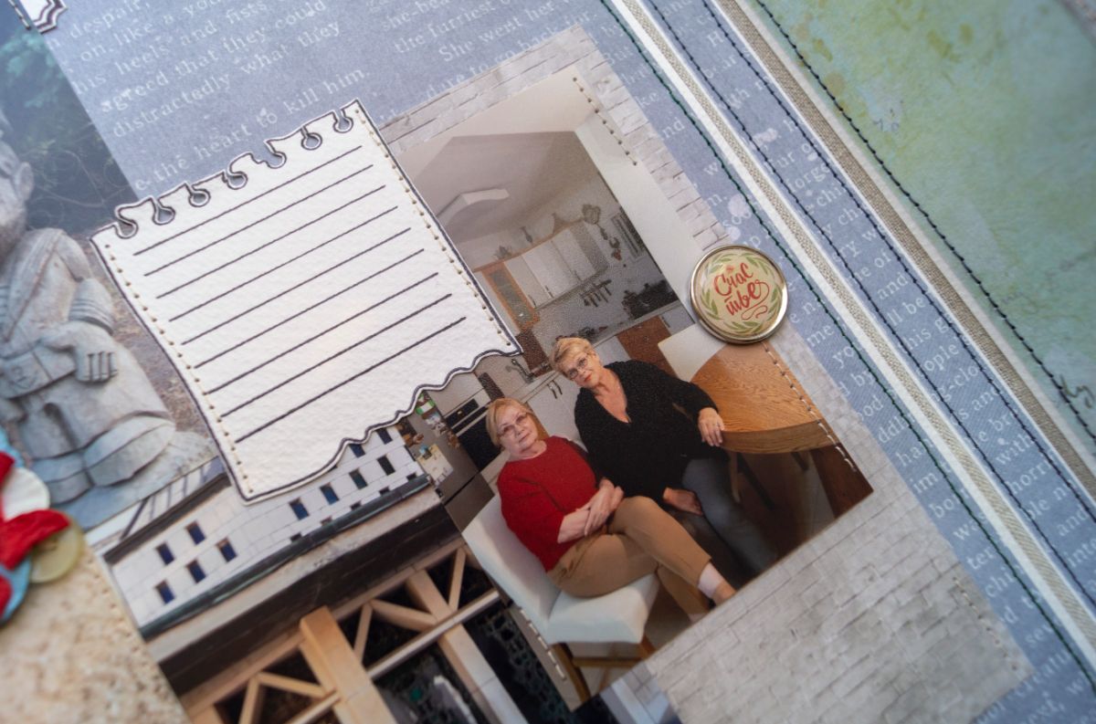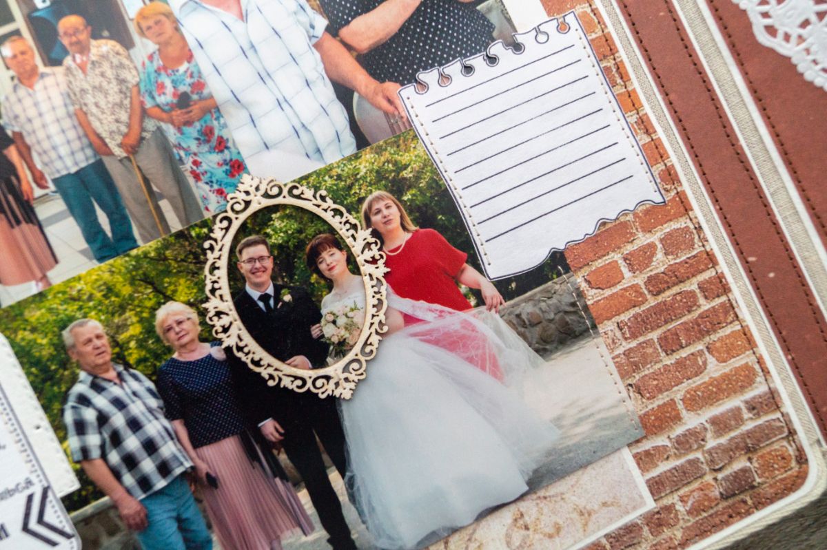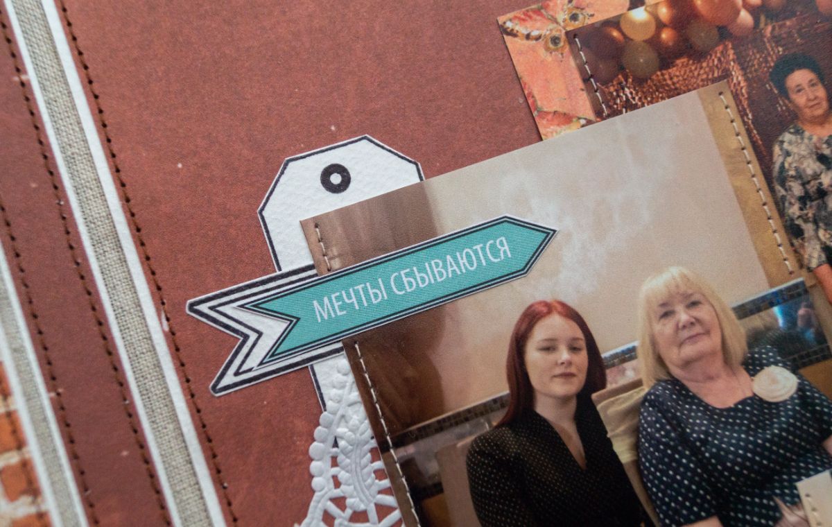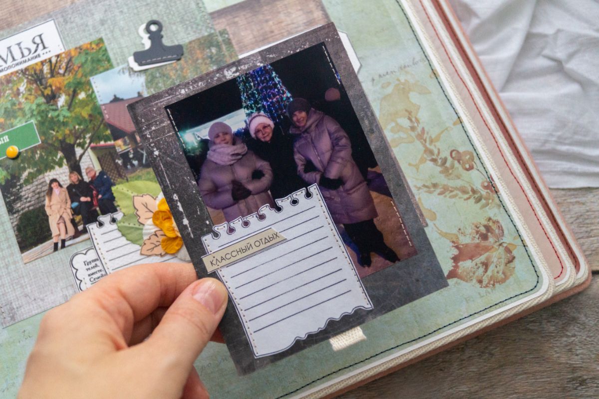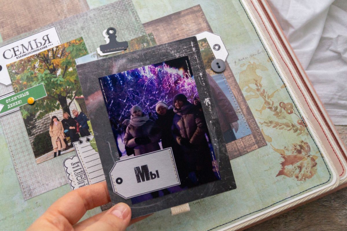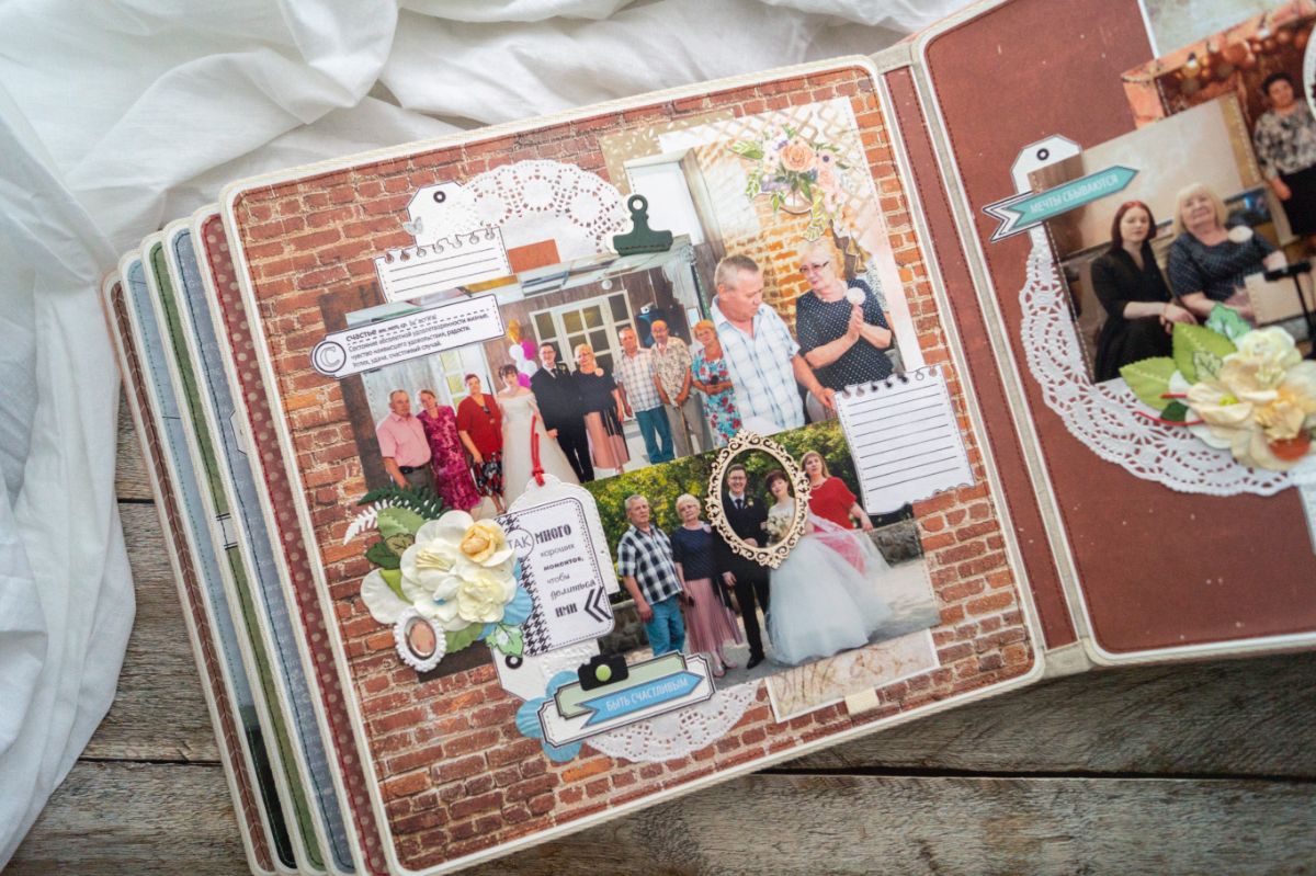 Фото разноплановые - как по сюжетам, так и по временным отрезкам жизни именинницы. Пожалуй, только в этом и была сложность - рассортировать фото по 6-ти разворотам на подтемы под рабочими названиями: посиделки, работа/коллеги, в кругу семьи, на отдыхе, день рождения, свадьбы. В остальном работа шла легко.