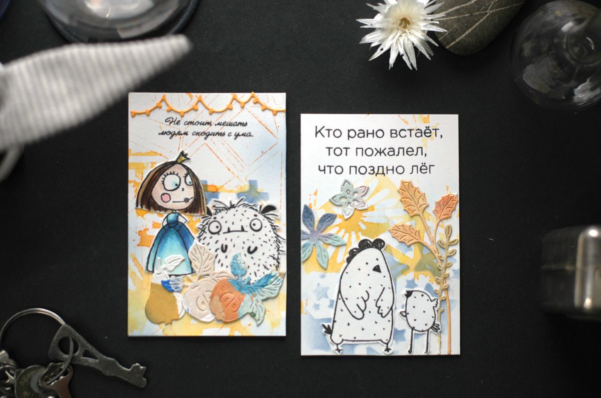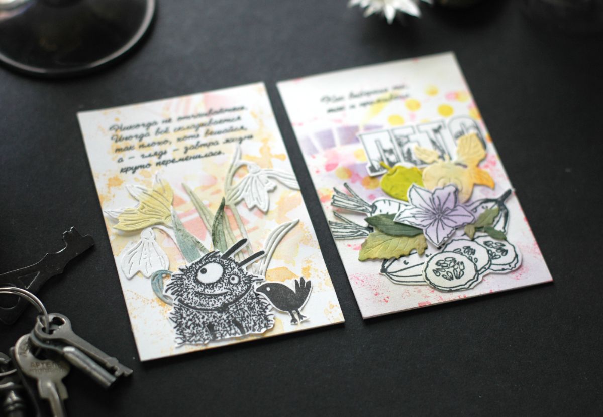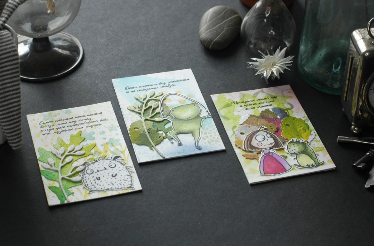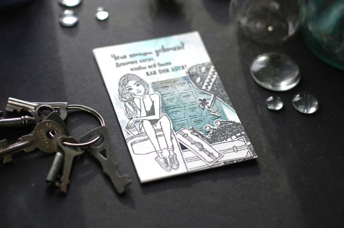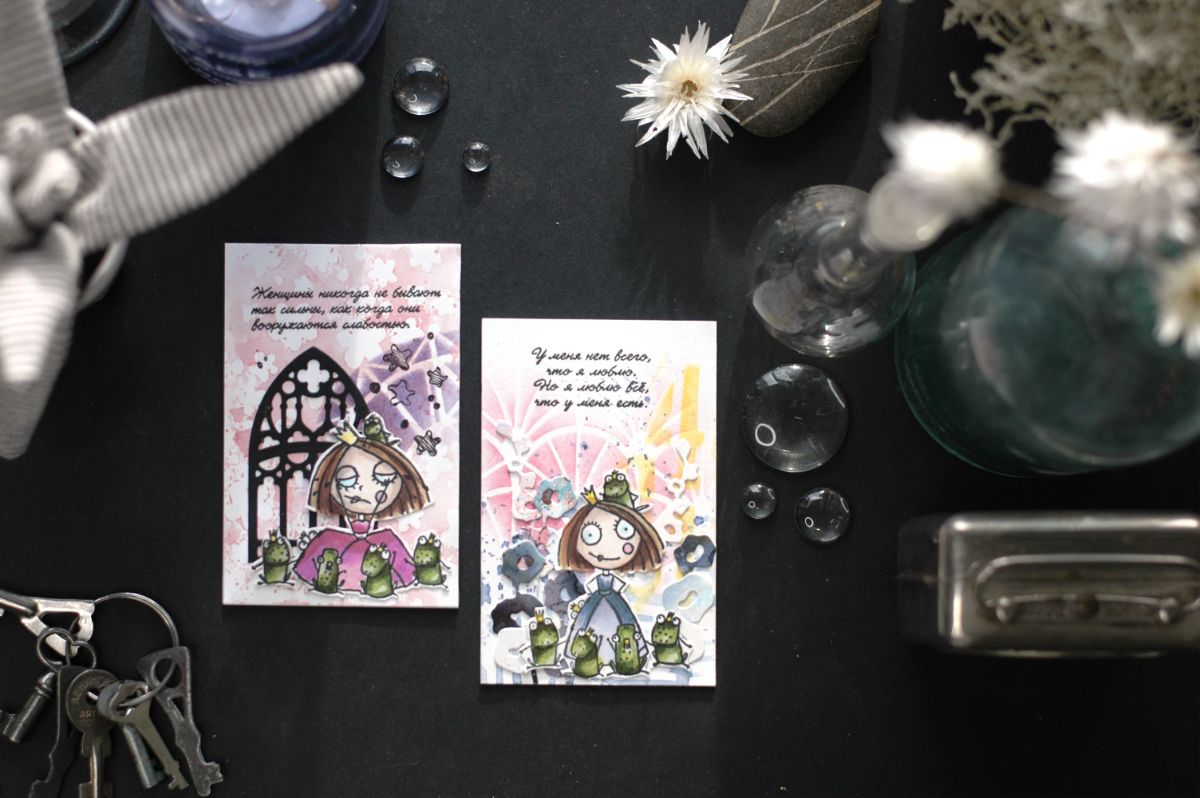 В оформлении карточек активно участвовали Чумички и другие персонажи из Питерского скрапклуба. С удовольствием покрасовалась принцесса с лягушками: штампы "Поцелуйчик?", "Королевские слёзы", "Руки в боки". Приняли участие винтажные штампы "Дама 2" и "Баронет и новое поколение с надписью "Чего хотят девочки?". Оказались на карточках и боги: "Боги Олимпа"3 и "Боги Олимпа"5.