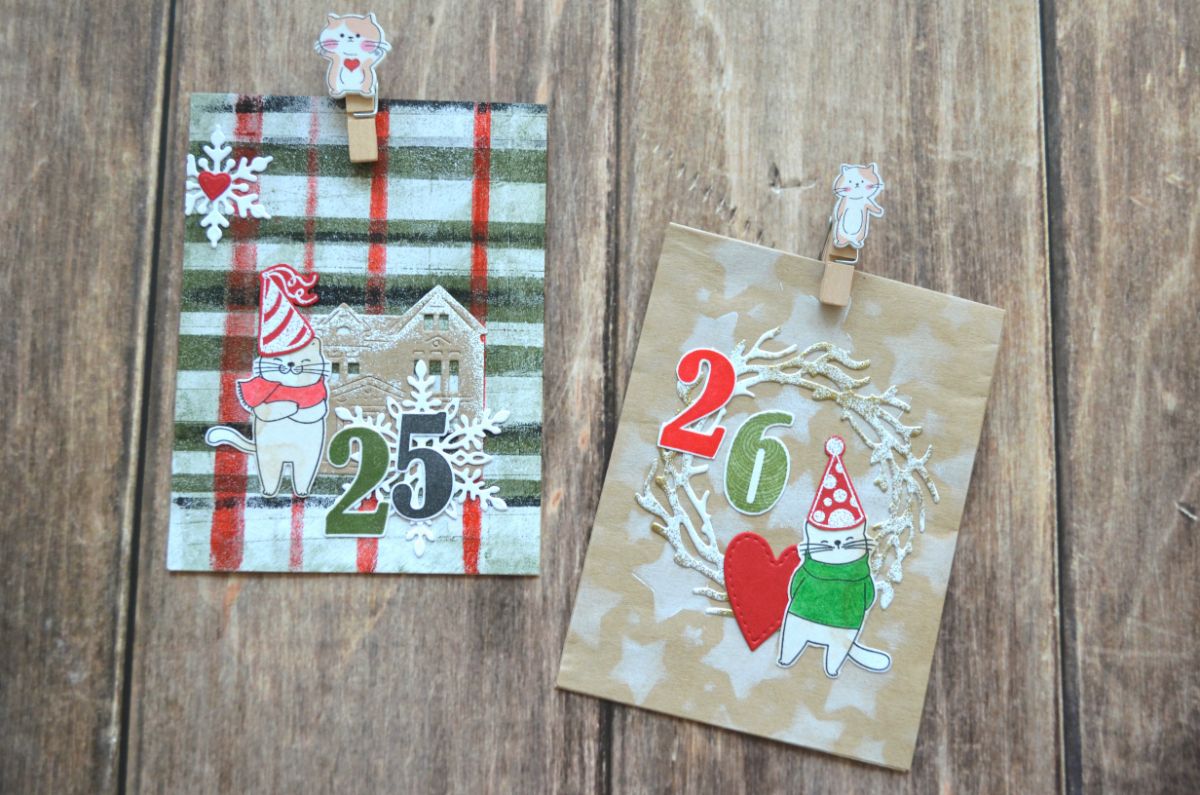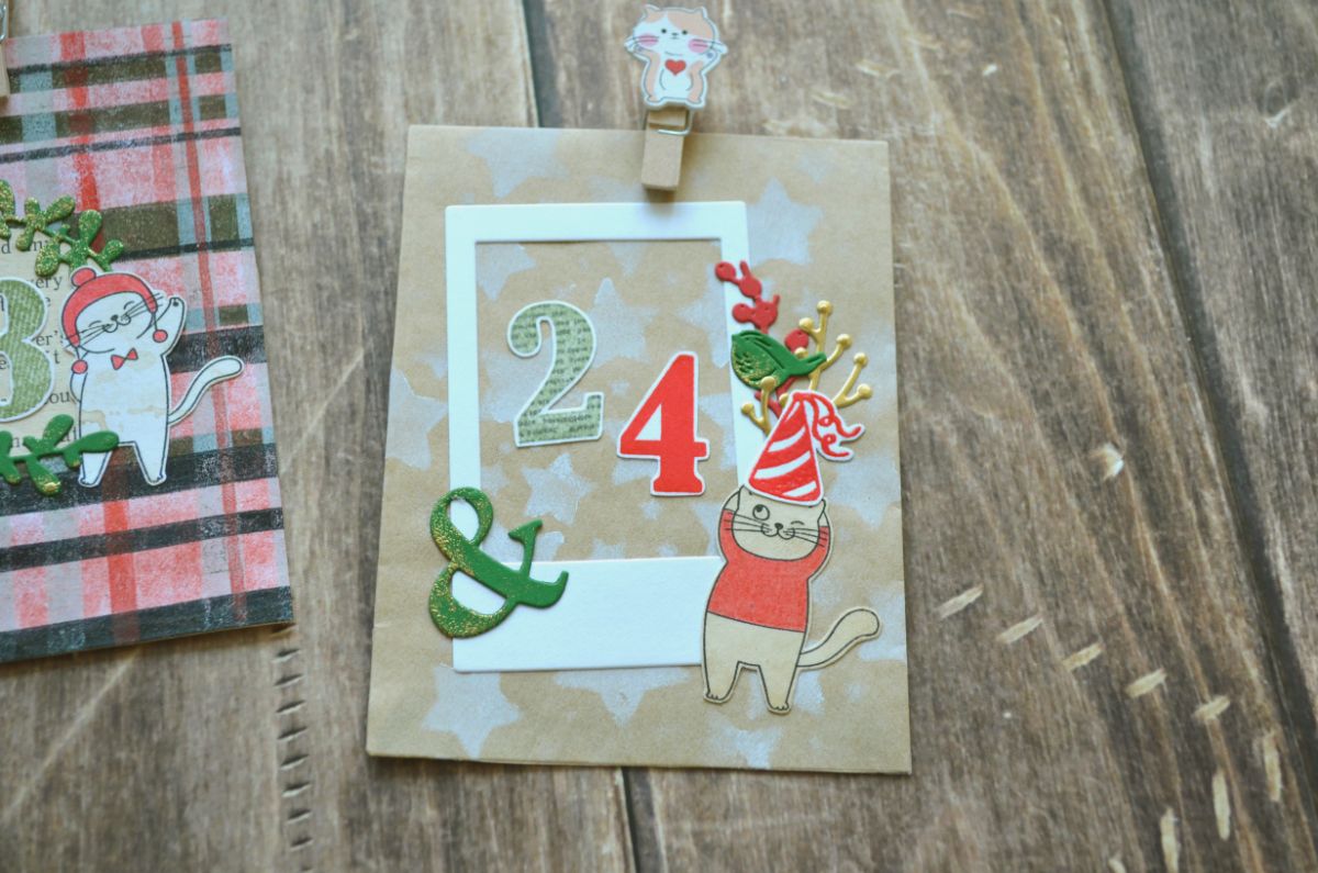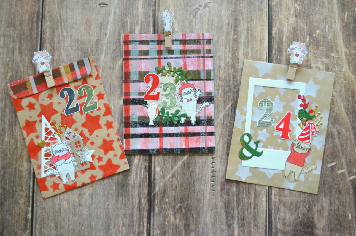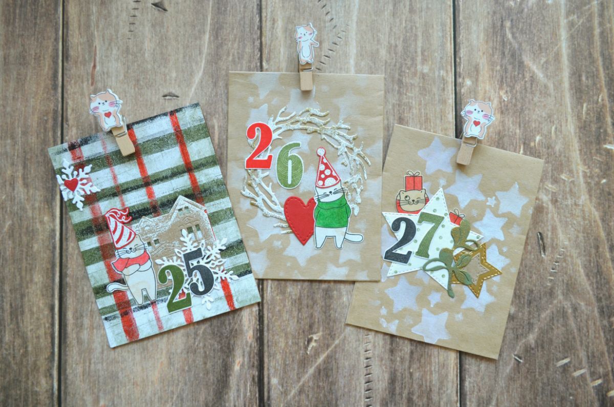 В этом году я сделала адвент календарь для своей маленькой дочки. Она страстная кошатница, поэтому главными героями стали Котики в теплой одежде. Календарь для ребенка, поэтому я остановилась на классическом новогоднем сочетании цветов и простом антивандальном декоре :)