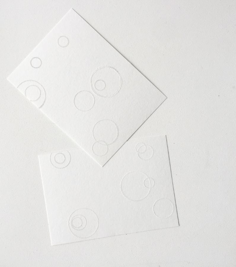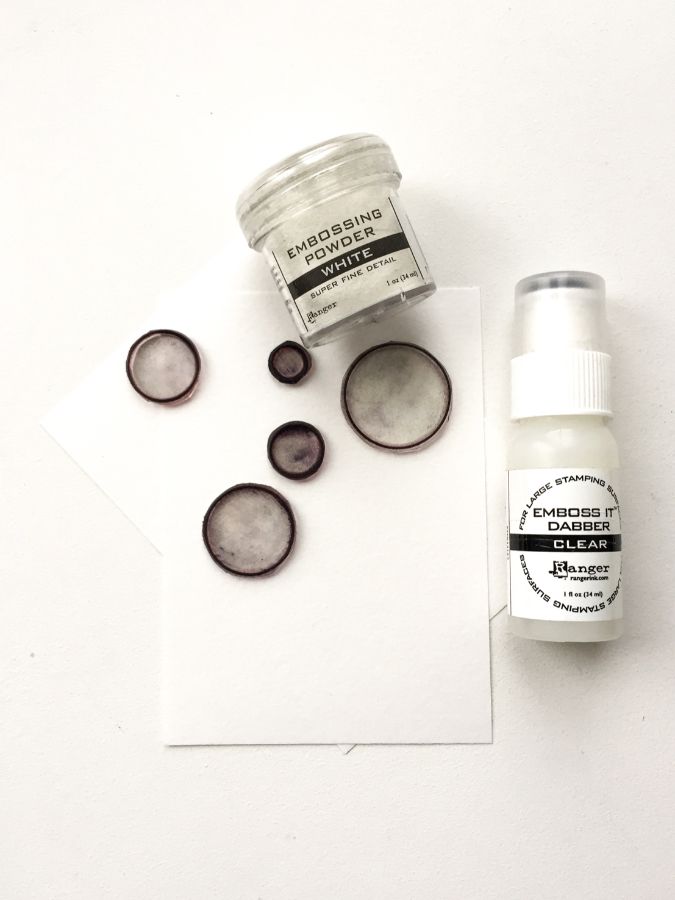 Часть контурных кругов я сделала в технике горячего эмбоссинга белой пудрой, а чтобы фон не казался плоским и был более интересным, сделала круги еще и дыроколами разного диаметра.