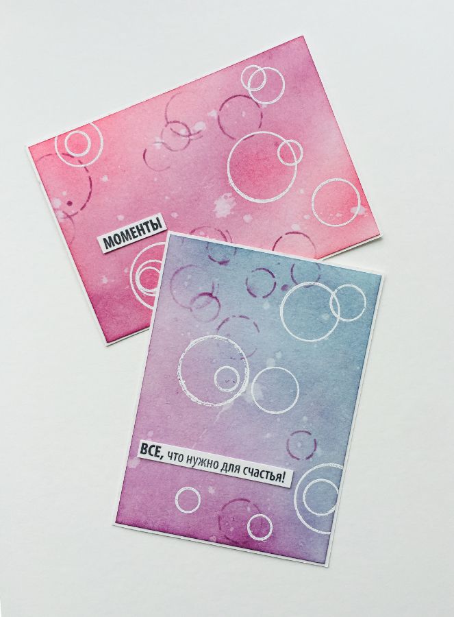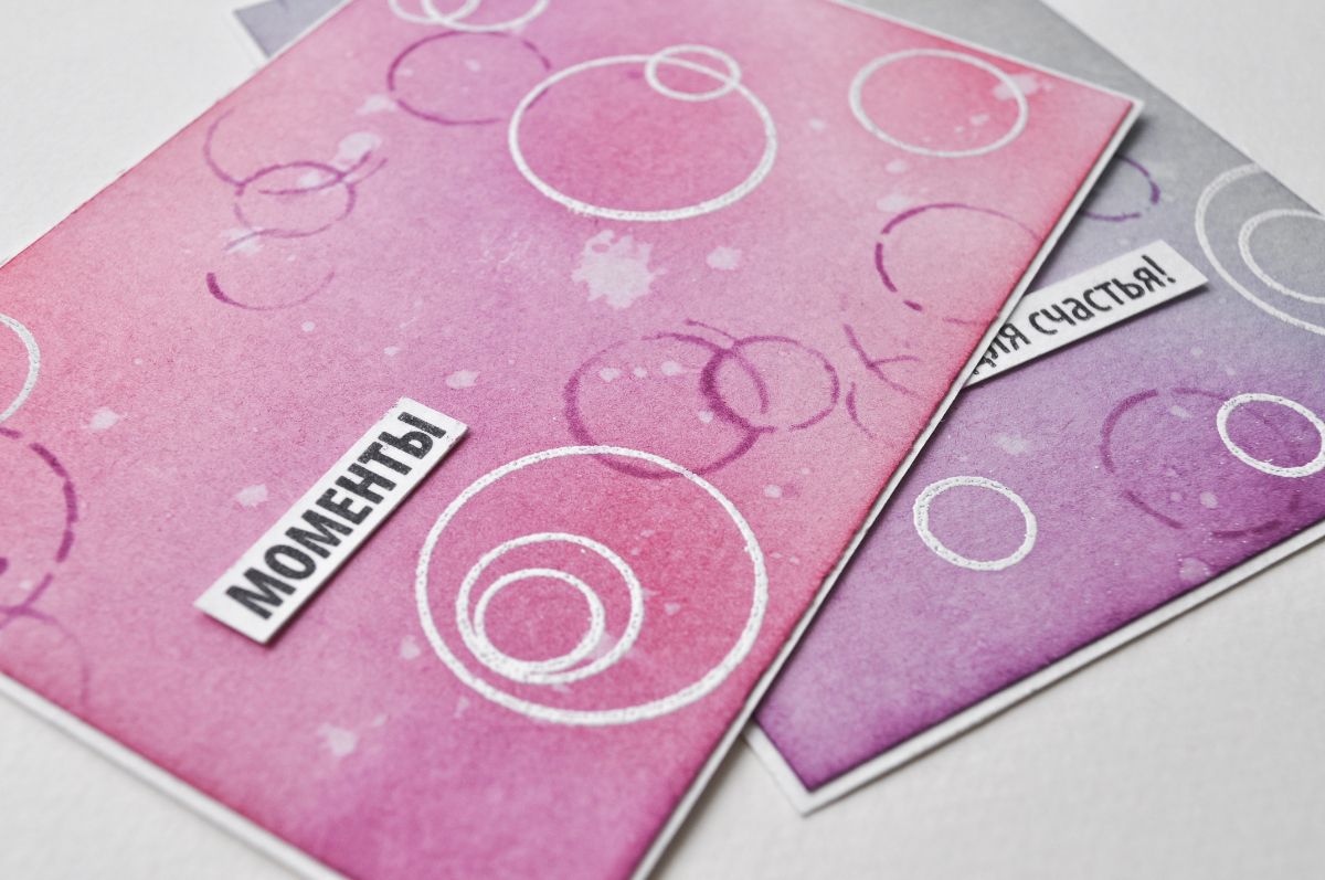 Эти наборы штампов у меня в любимчиках, люблю их за универсальность, а поскольку круги в этих наборах разного размера, контурные и с заливкой, то и вариантов их применения великое множество. Покажу три варианта создания фонов для открыток, используя вышеуказанные наборы штампов.