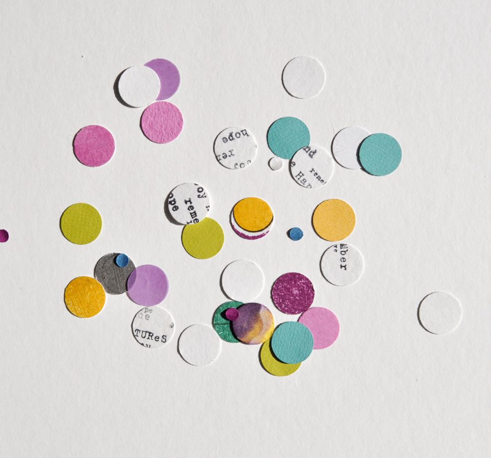 С помощью дырокола вырубаю кружочки из цветного кардстока и кусочка акварельной бумаги, на котором заранее сделала оттиск штампом "Английские надписи", эти кружочки я буду использованы для декора.