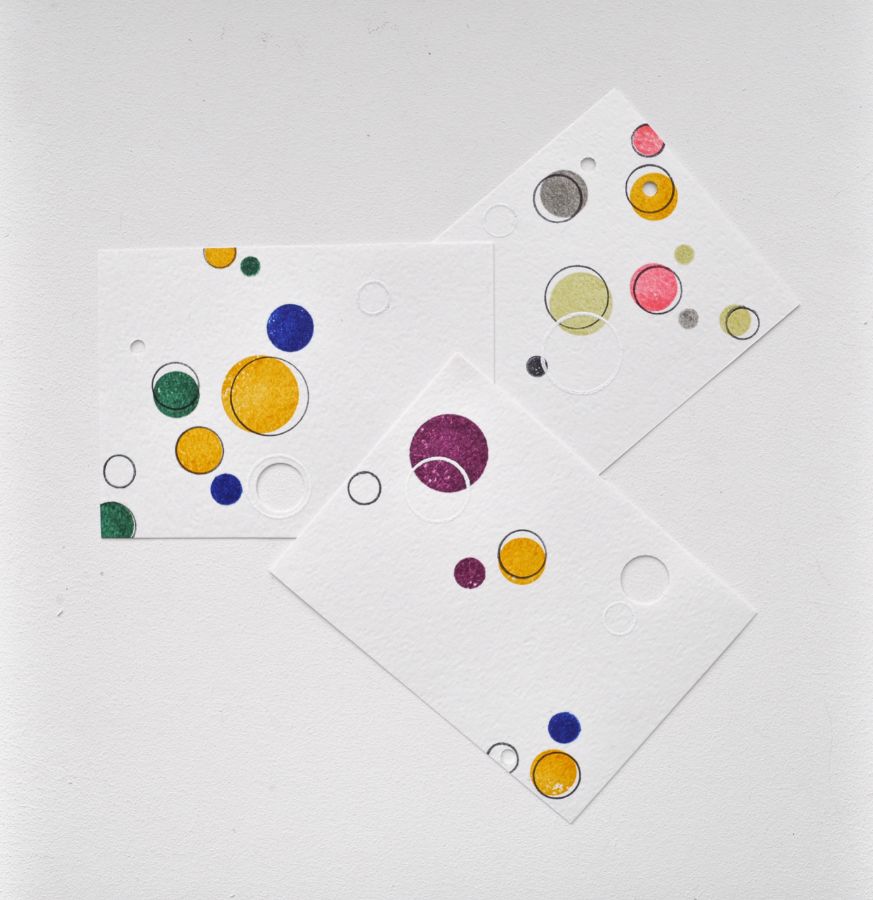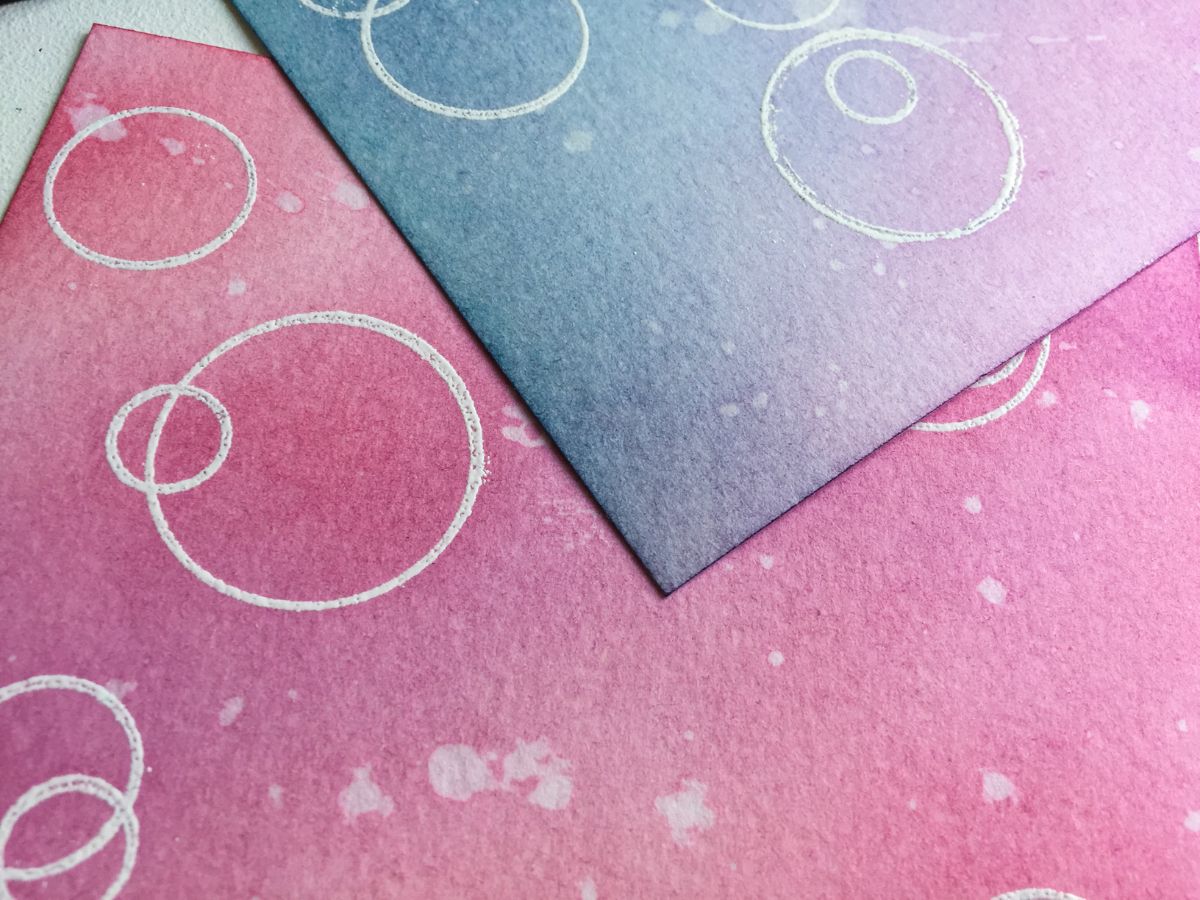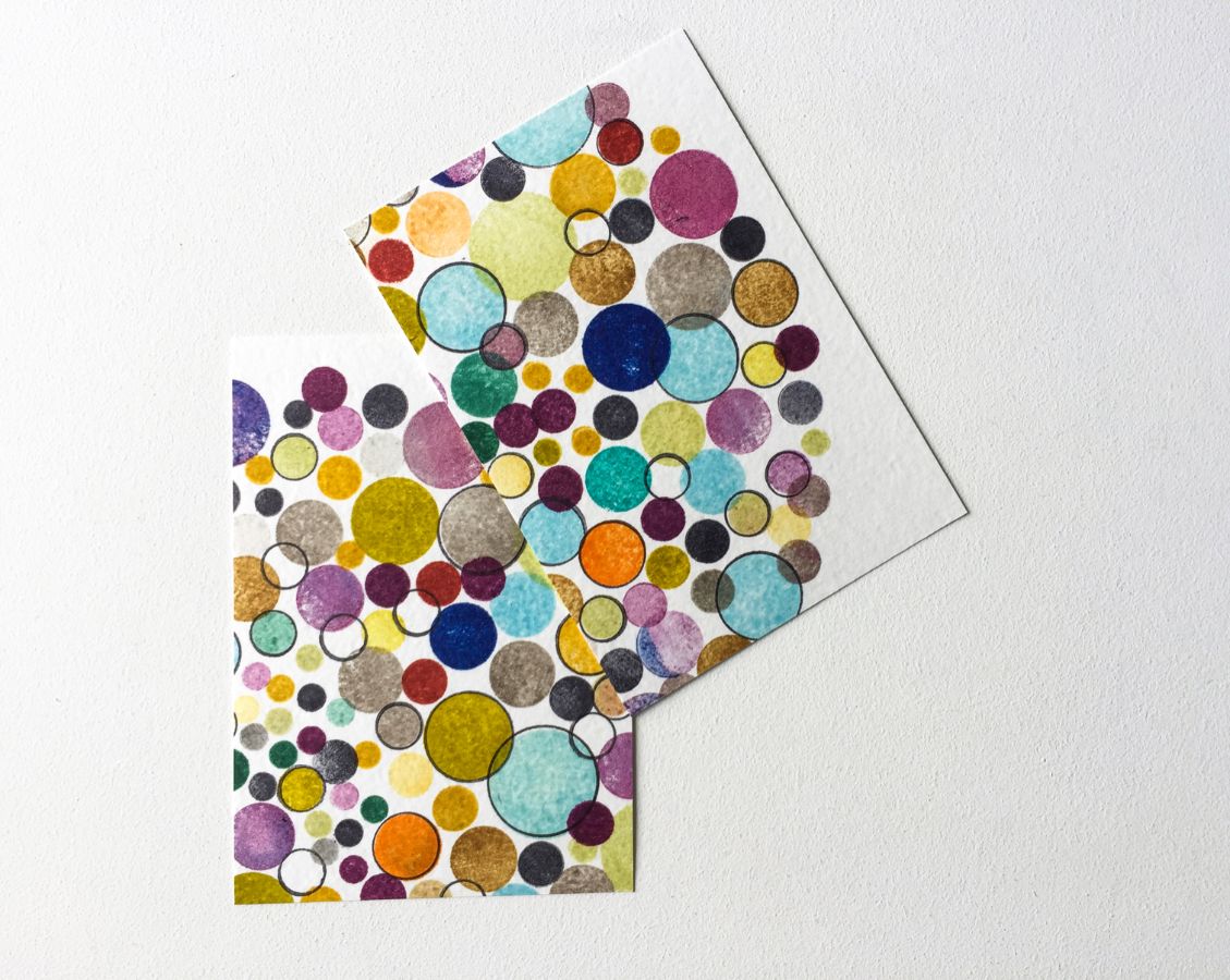 Второй способ - это наштамповать много кругов сплошняком на акварельной бумаге разным цветом и разных размеров, чередуя штампы с заливкой и контурные, а затем разрезаю их на фоны.