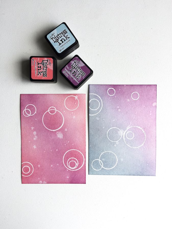 И третий вариант - круги в технике горячего эмбоссинга на основе из акварельной бумаги, затонированной дистресс чернилами, в этом случае использую штампы только контурные.