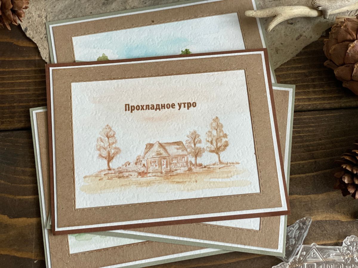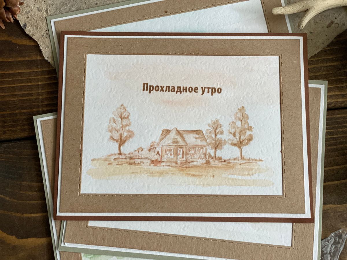 Самая летняя открытка с домиком в деревне. К домику я добавила еще куст и дерево. Все раскрашено акварелью.
