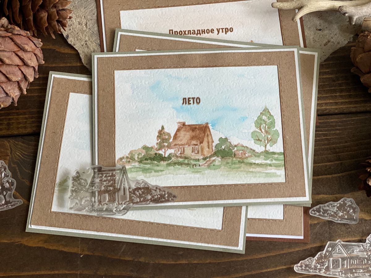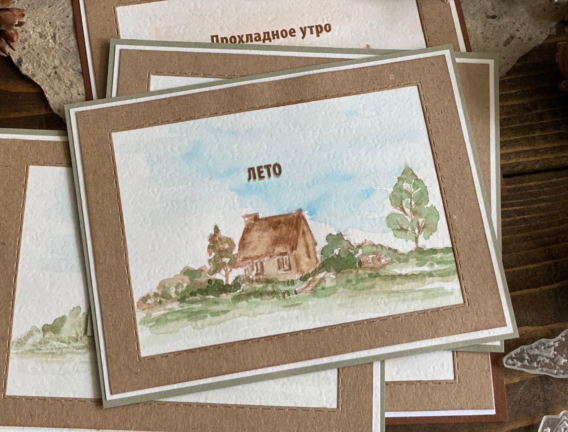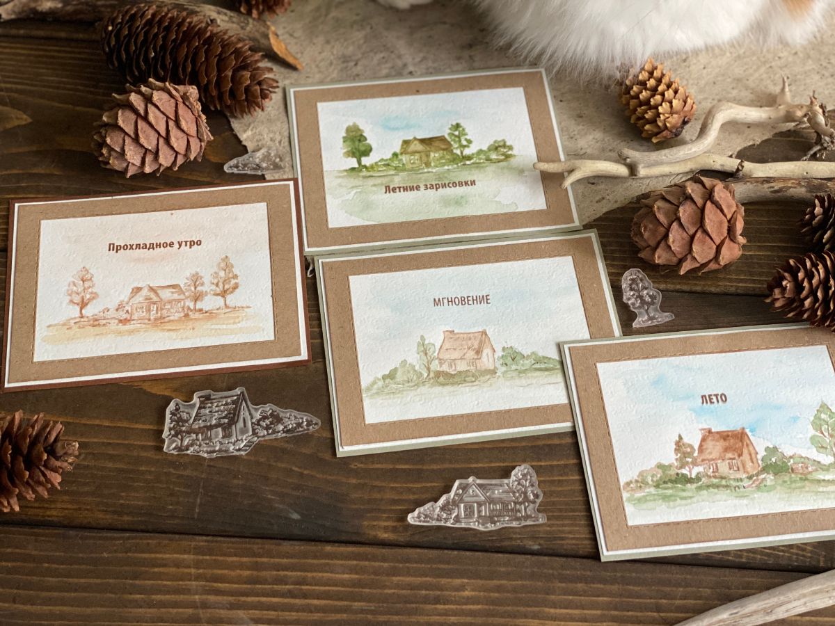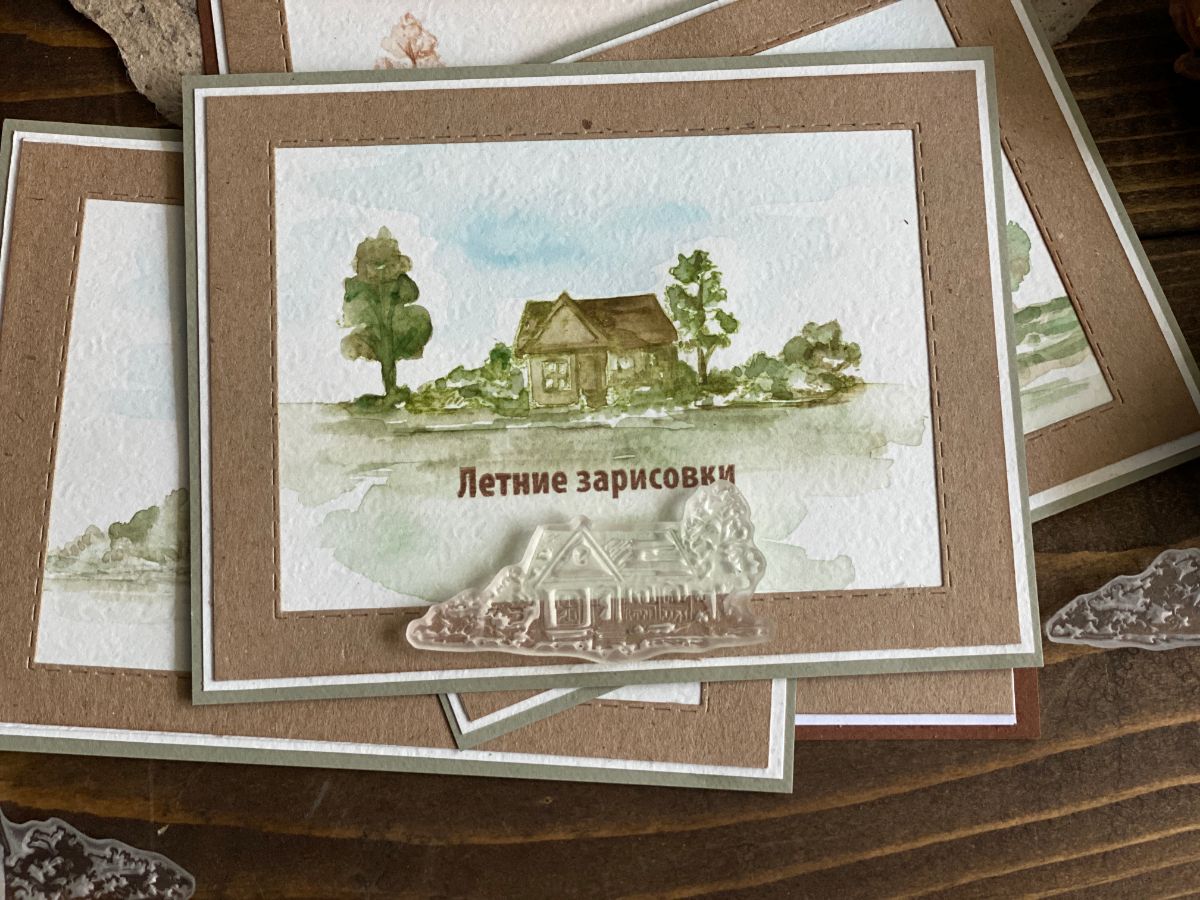 На календаре уже август, хочется подольше насладиться жаркими днями и ночами. Сидеть в беседке, слушать пение птиц и ничего не делать (после тяжелого трудового дня по сборке урожая это особенно актуально). Вот в один из таких вечеров решила я насладиться штампами и порисовать. И получились у меня летние зарисовки, а всему виной новинки с домиками, в деревне они особенно пришлись в тему.