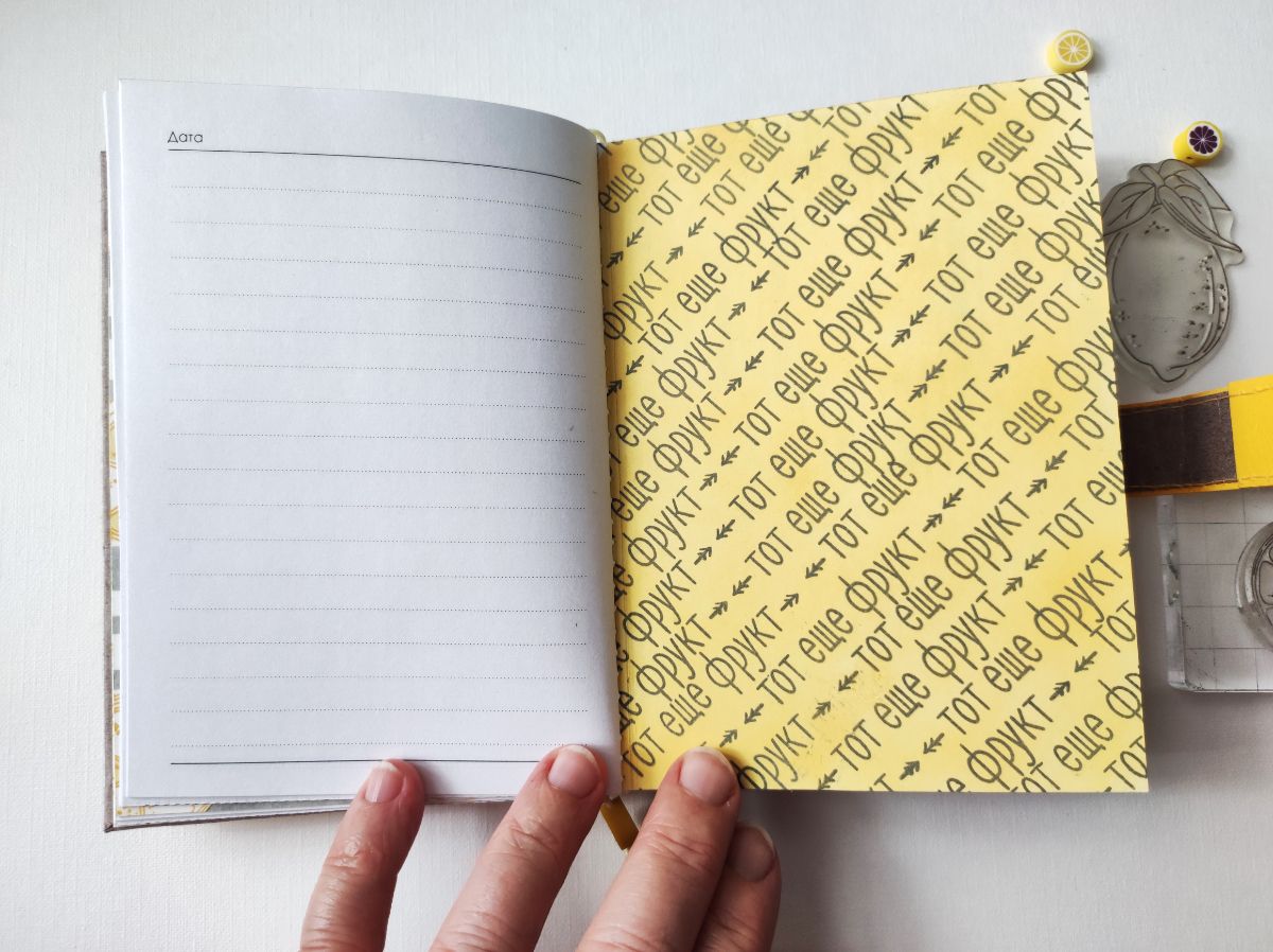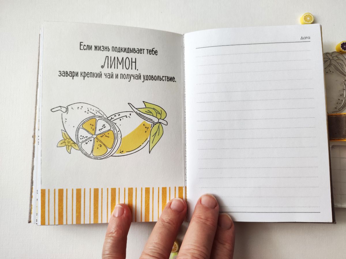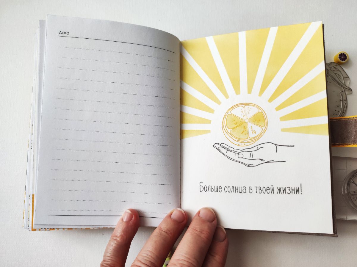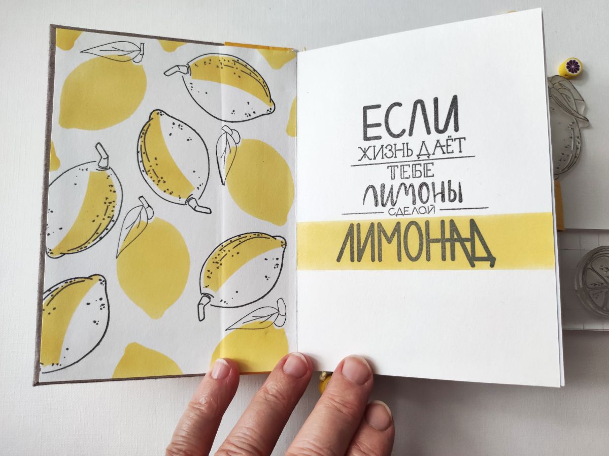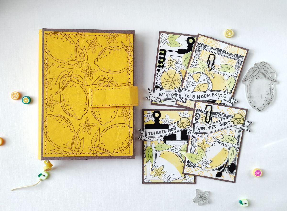 Основными идеями для блокнота стали минимализм в оформлении и исполнение а-ля типографская печать. Блокнот получился формата А6. Странички для записей сверстала сама и распечатала. Решила, что в блокноте будут только штампы и тонировка, но в самом конце добавила немного вырубки на разделители. Главными действующими лицами стали штампы – Лимон с листиками, Лимон на веточке, Пол-лимона и Цветы лимона, они участвовали и в "заглавных ролях", и в "массовке".