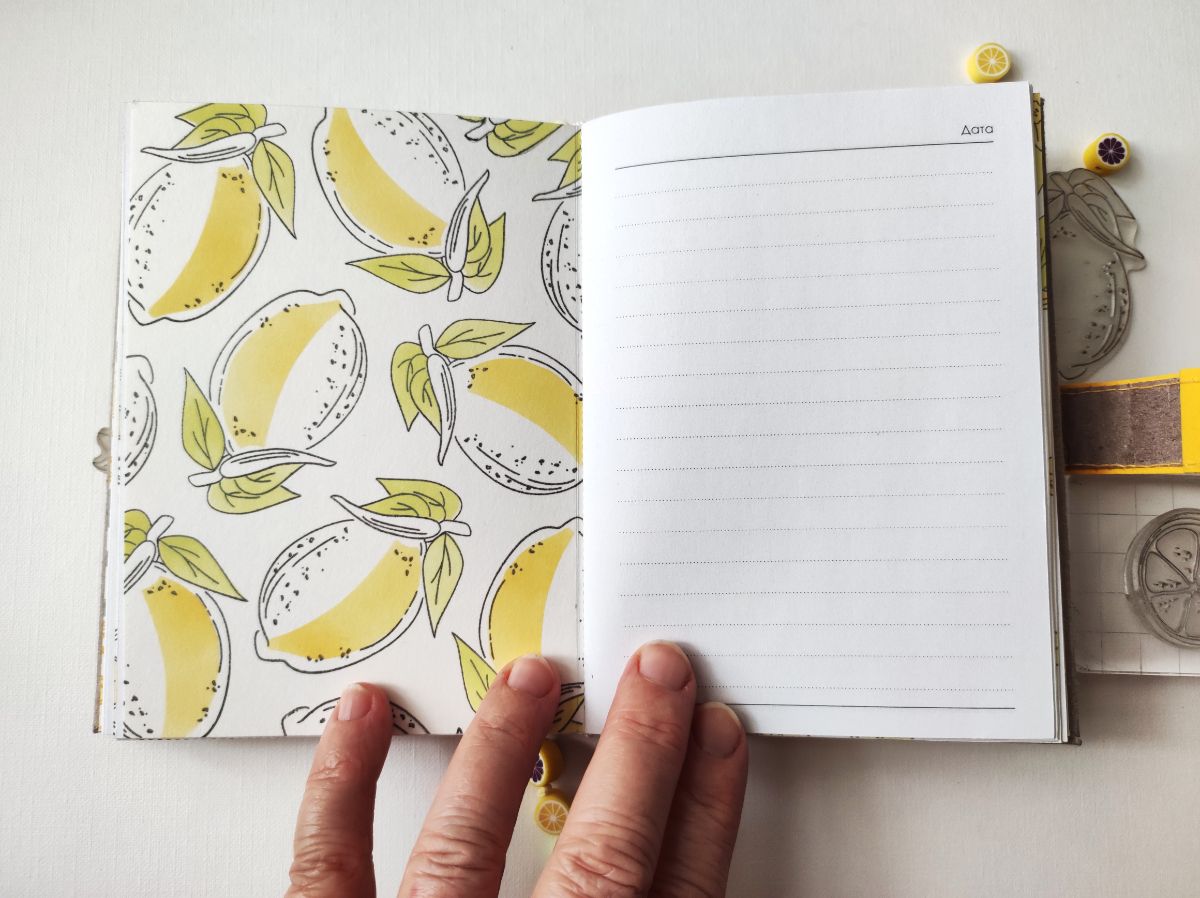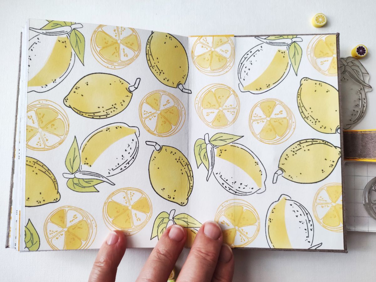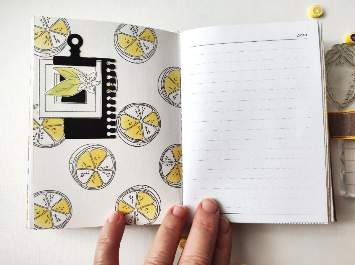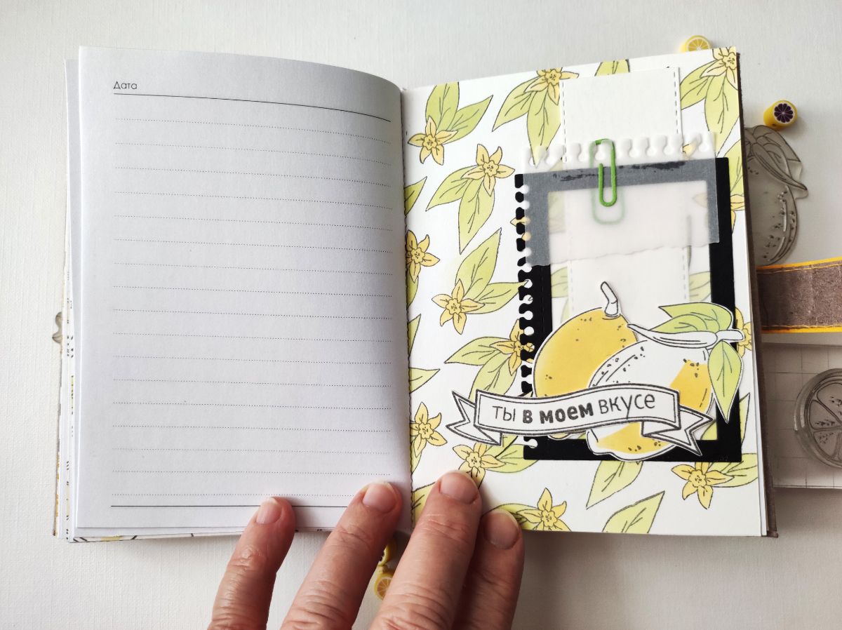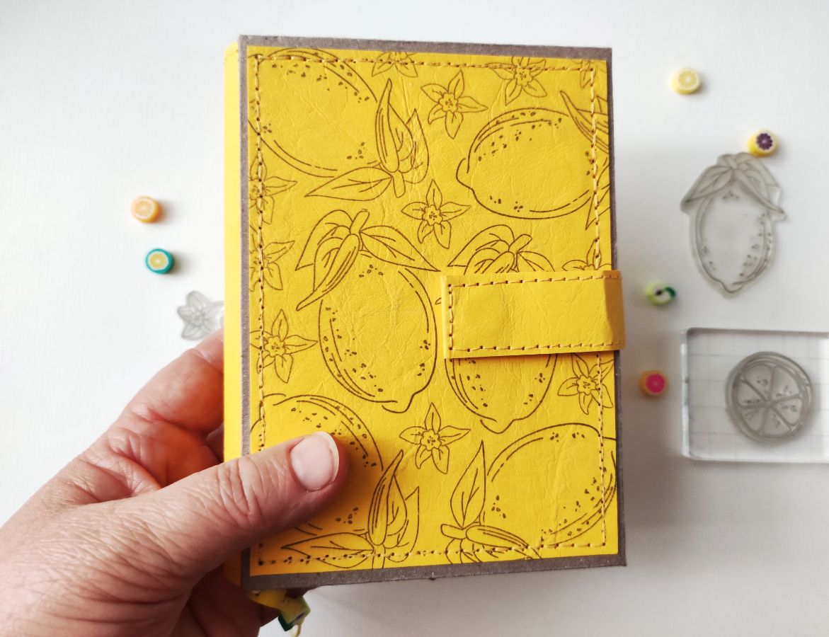 Основными идеями для блокнота стали минимализм в оформлении и исполнение а-ля типографская печать. Блокнот получился формата А6. Странички для записей сверстала сама и распечатала. Решила, что в блокноте будут только штампы и тонировка, но в самом конце добавила немного вырубки на разделители. Главными действующими лицами стали штампы – Лимон с листиками, Лимон на веточке, Пол-лимона и Цветы лимона, они участвовали и в "заглавных ролях", и в "массовке".