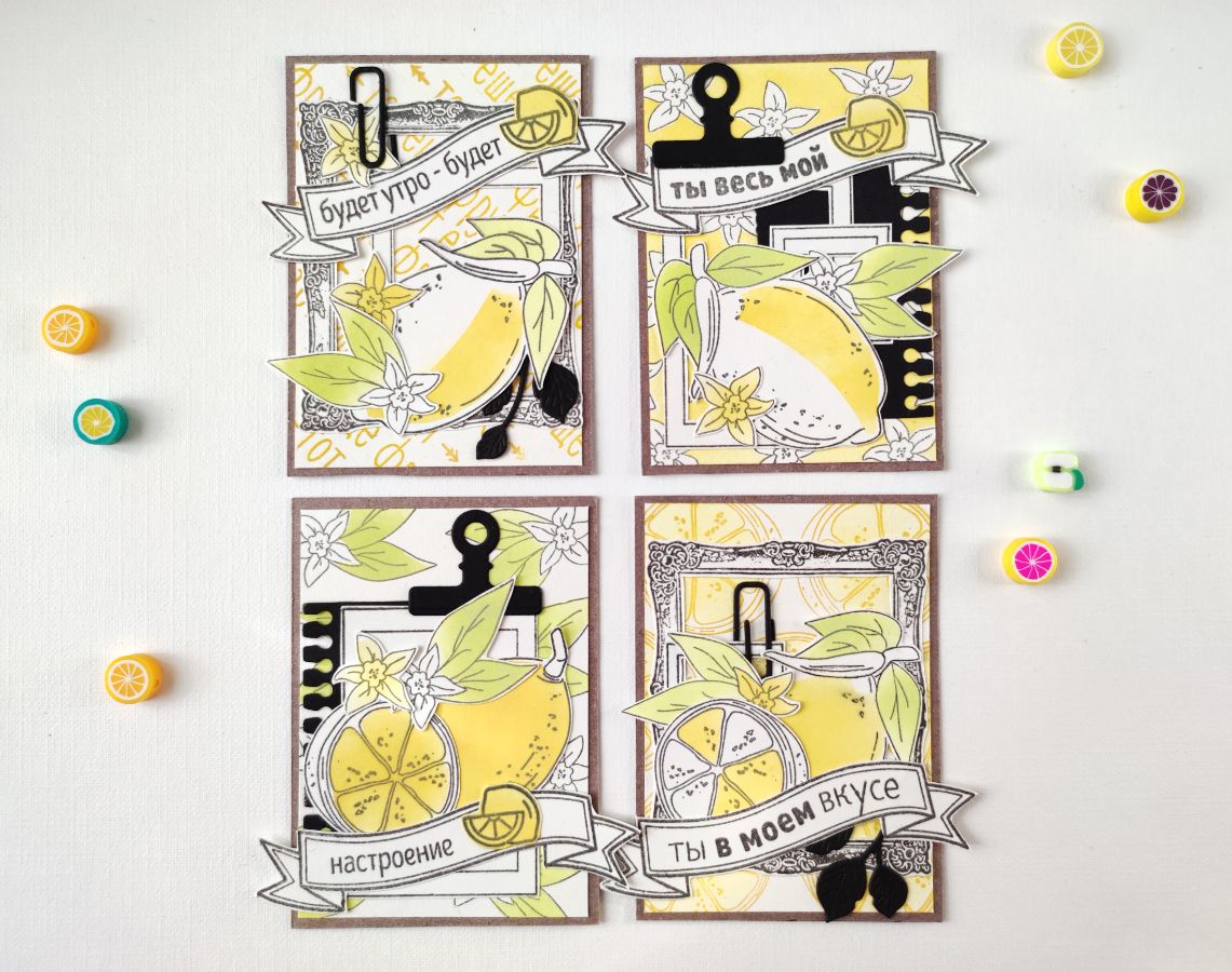 И дополнительно я использовала штампы – Девушка с напитком, Прими, Вертикальные полоски, и, конечно же, мотивирующие надписи – Лимонад из лимонов, Абсолютная сочность, Тот еще фрукт, Начни с понедельника, Если жизнь подкидывает лимон, Ты в моем вкусе, Больше солнца в твоей жизни.