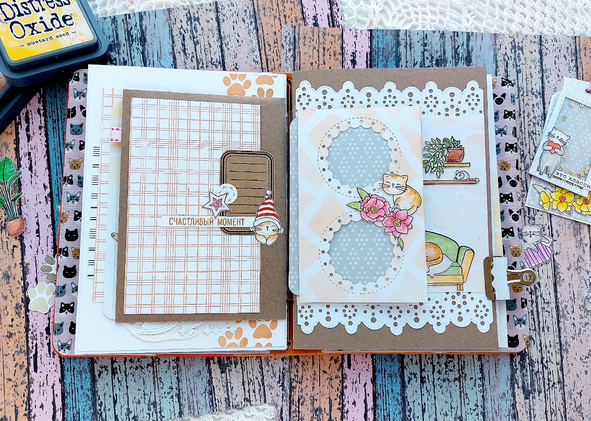 А объединить их можно как едиными персонажами – котами, так и повторяющимися фонами. Например, у меня это фон бумажный созданный с помощью штампа «Скатерть», и фон тонированный через трафареты «Витраж» и «Круги и кружочки».
