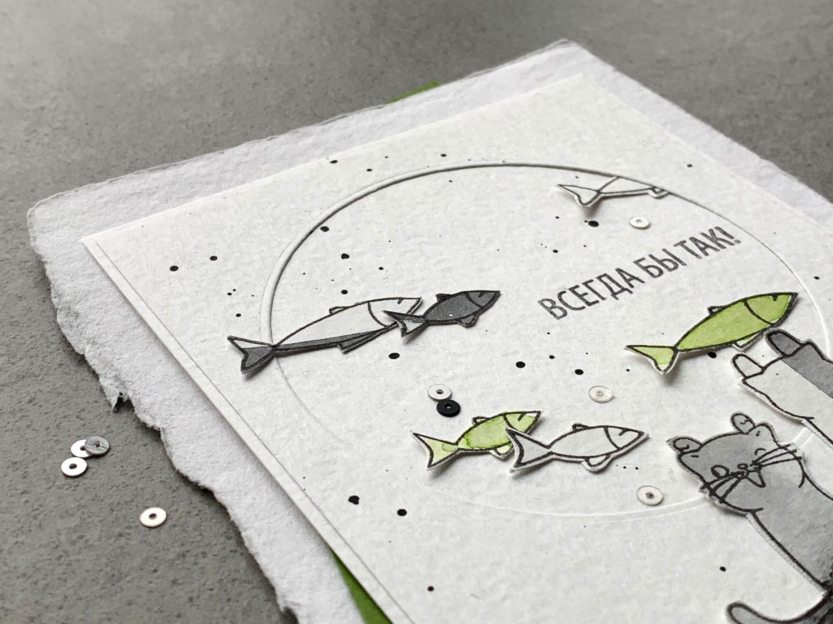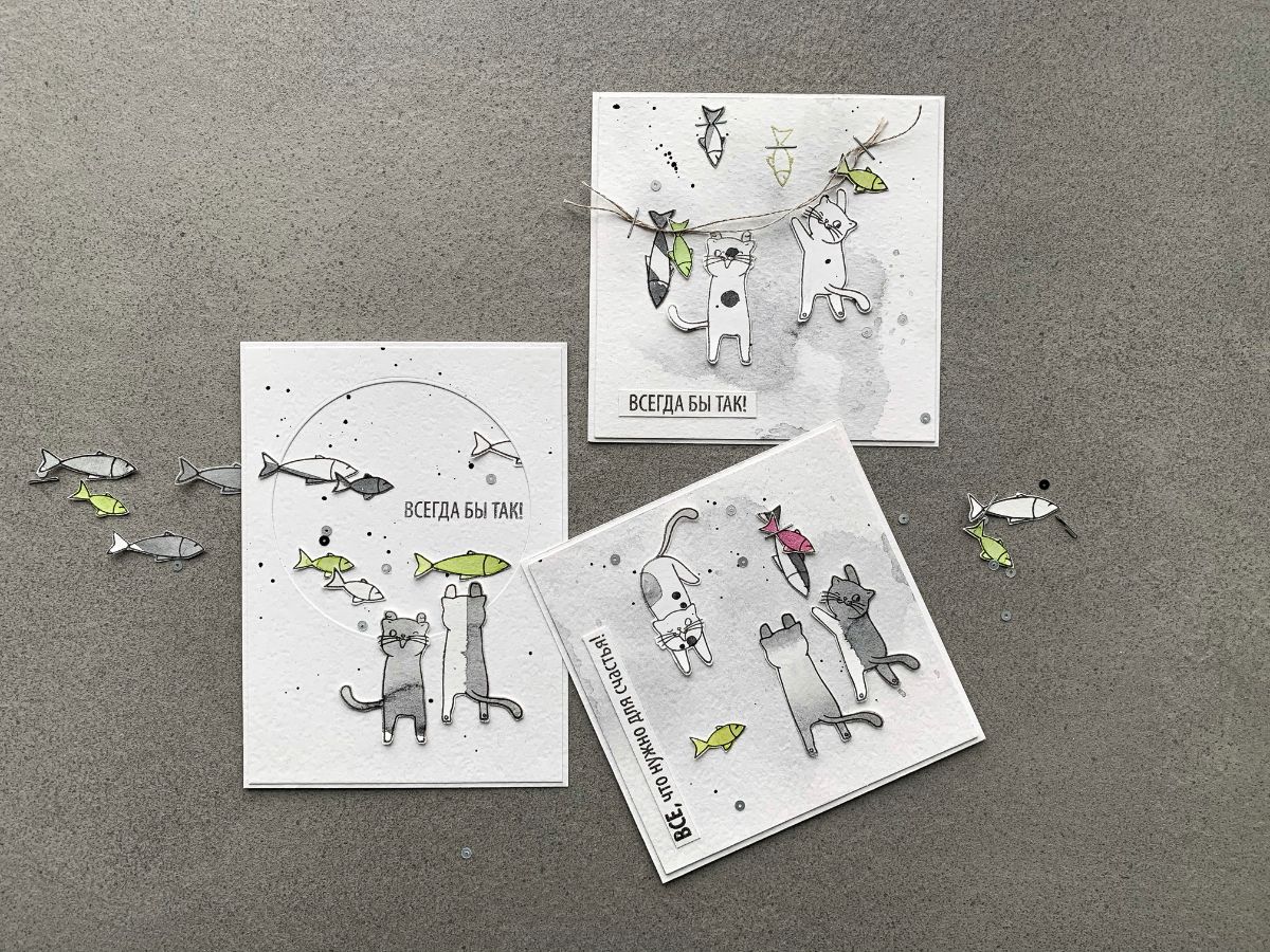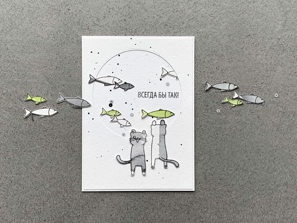 На этот раз для открыточных историй я использовала только вырезанные отштамповки, ну и пару рыбок в технике горячего эмбоссинга.