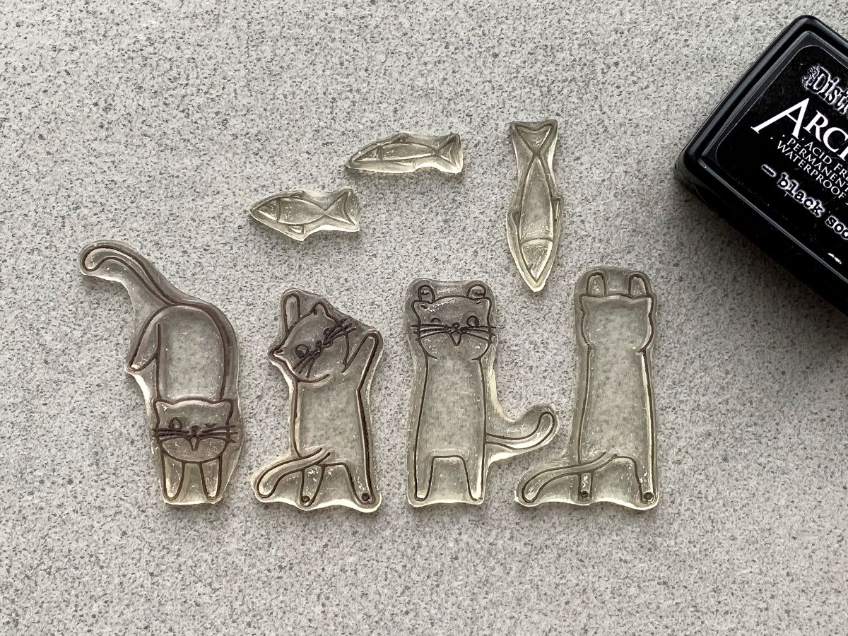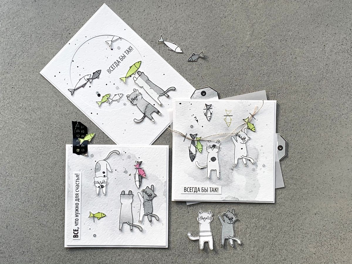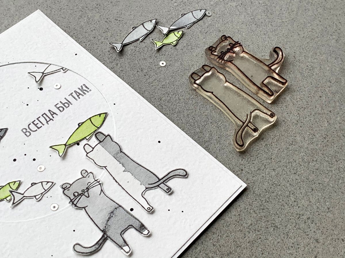 На этот раз для открыточных историй я использовала только вырезанные отштамповки, ну и пару рыбок в технике горячего эмбоссинга.