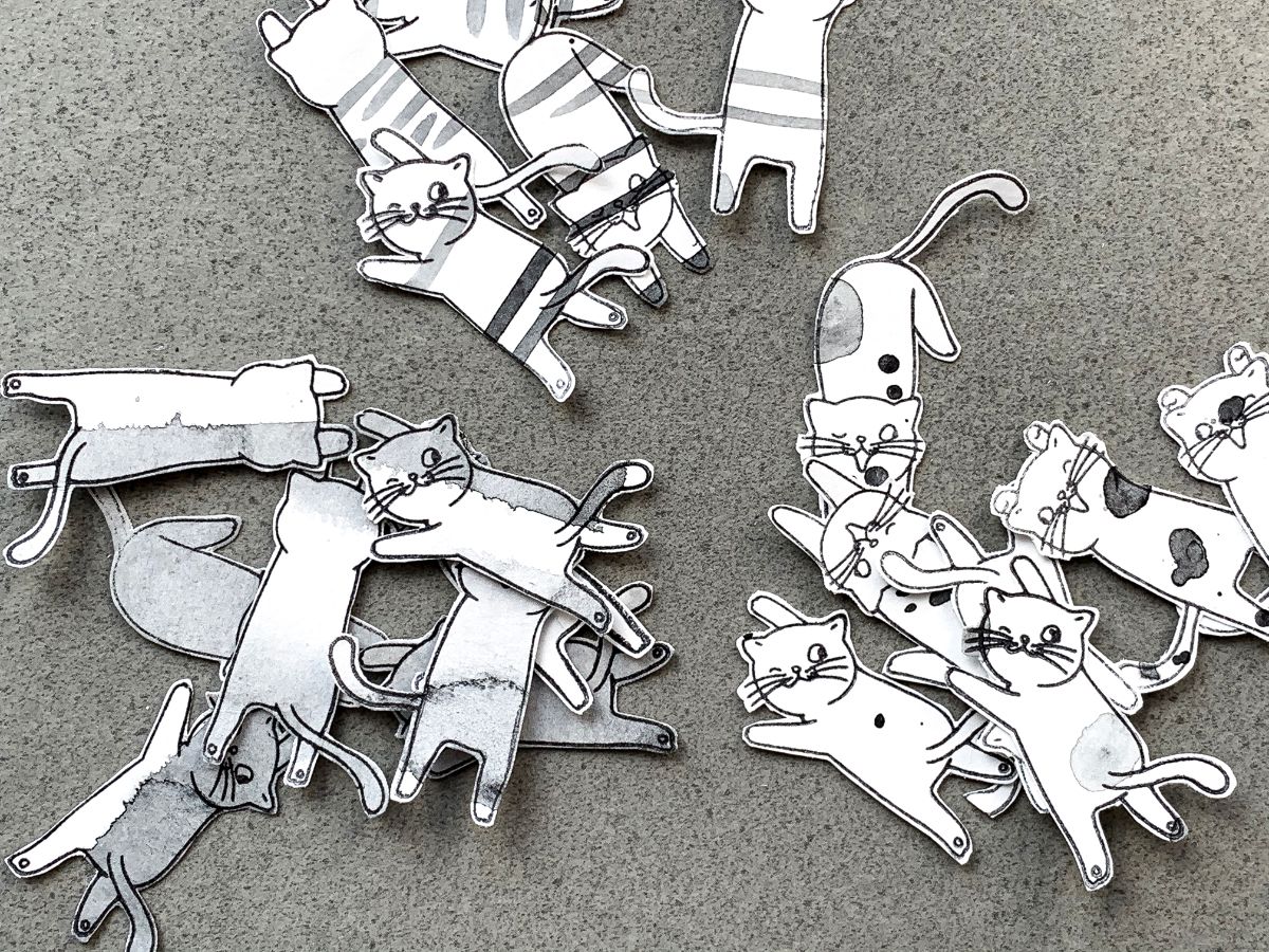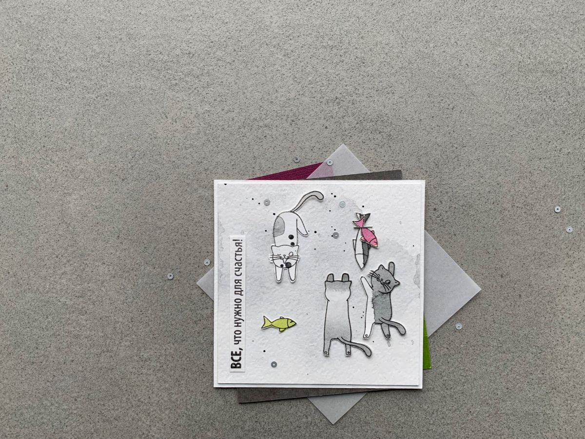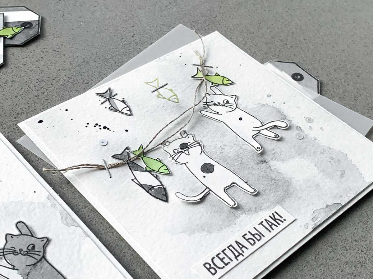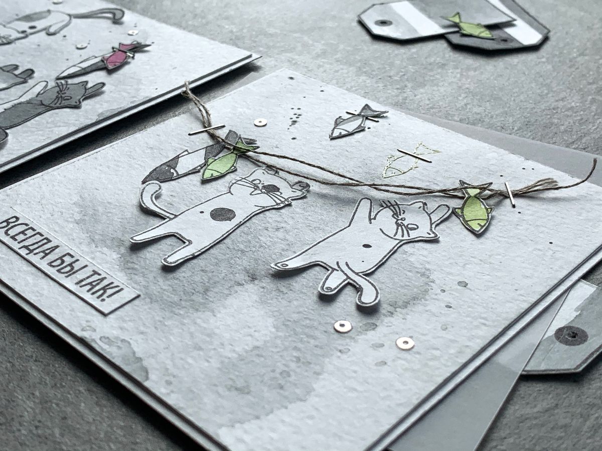 А теги, которые участвуют в фотосессии, я сделала этим штампом Для счастья каждому нужно свое. А что для счастья нужно котам?)