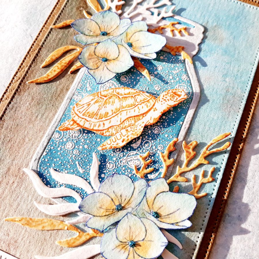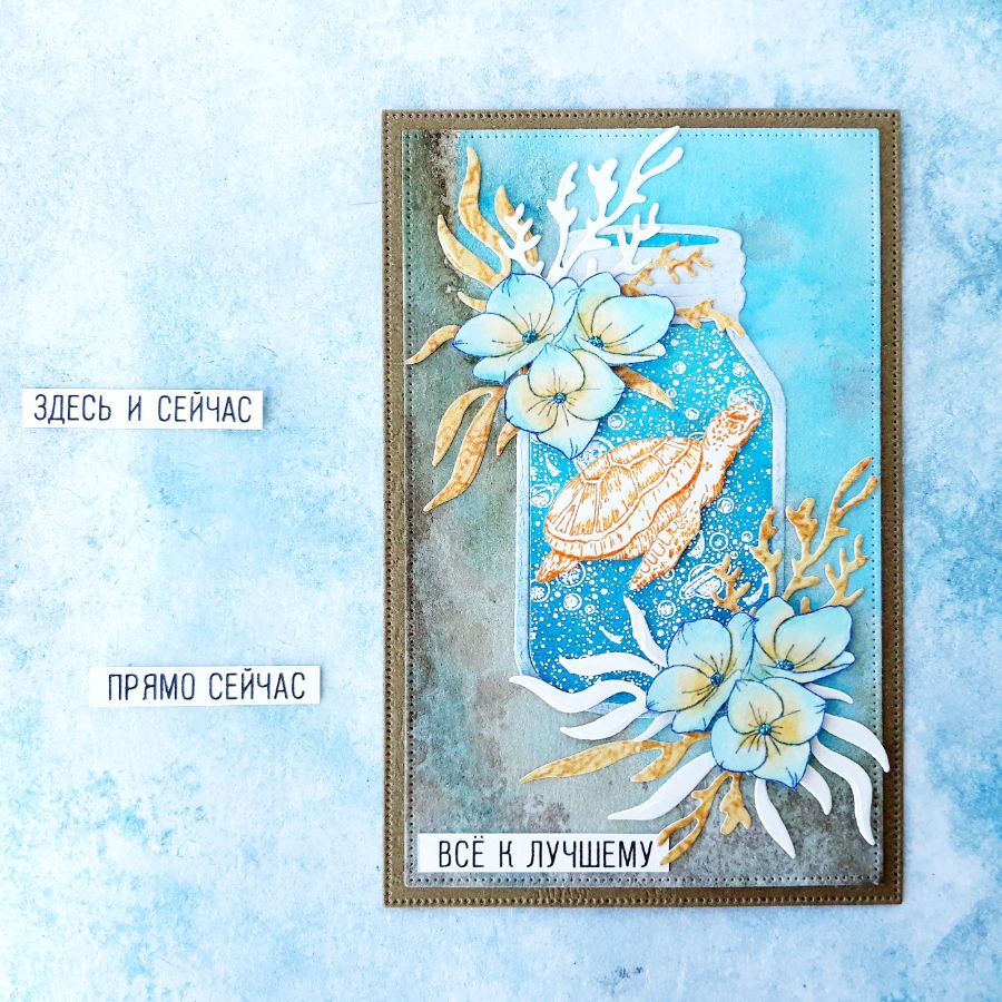 Банка в этой открытке вырублена ножом. Фон и эмбоссинг сделаны уже на готовой вырубке. Листья и кораллы также сделаны ножами и служат ажурным украшением для ГОРТЕНЗИЙ среднего размера. Как и черепаха, они закреплены на панели с помощью объемного скотча. Фон панели тоже сделан "с нуля". А вот листья и кораллы - из бумаги для скрапбукинга. Серединки цветов украшены декоративным клеем с глиттером от Ranger. А сами гортензии раскрашены чернилами Distress Inks с помощью "водной" кисти.