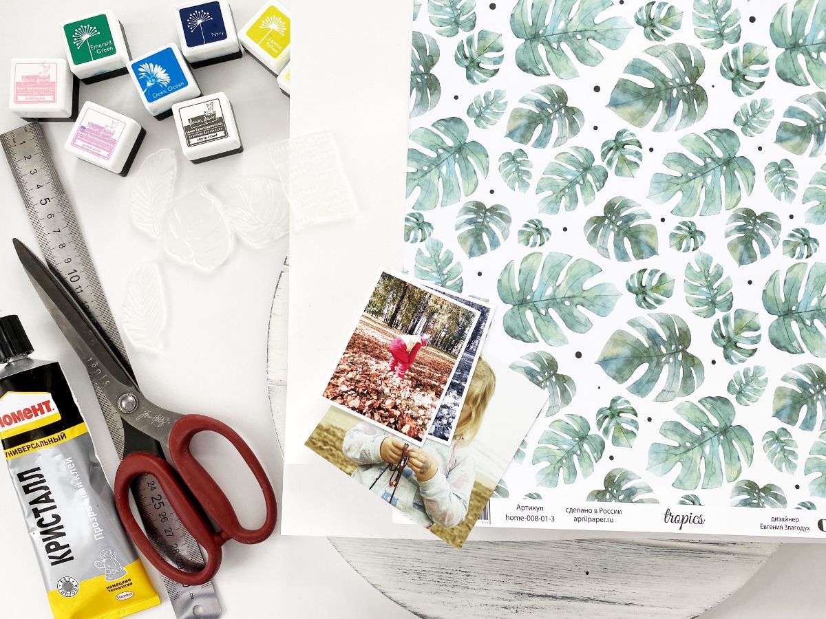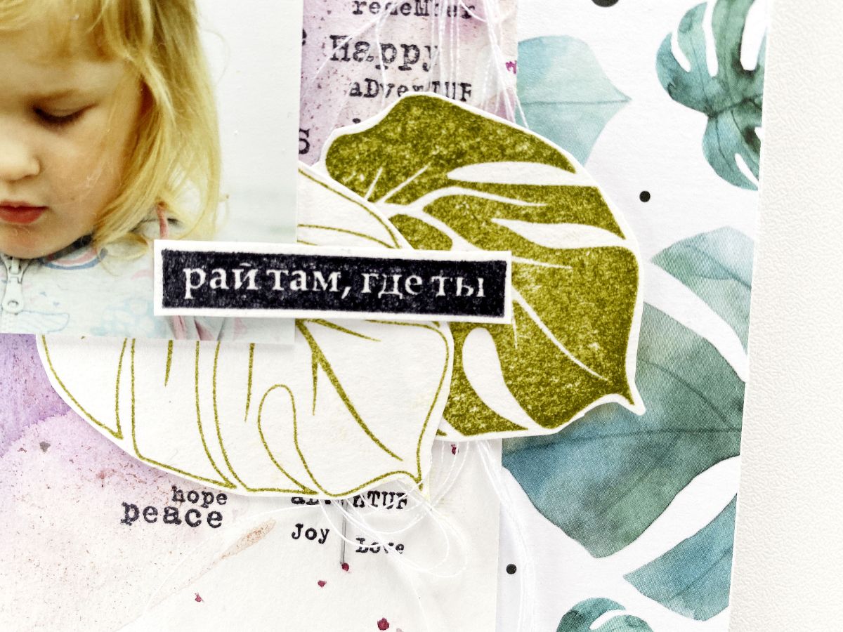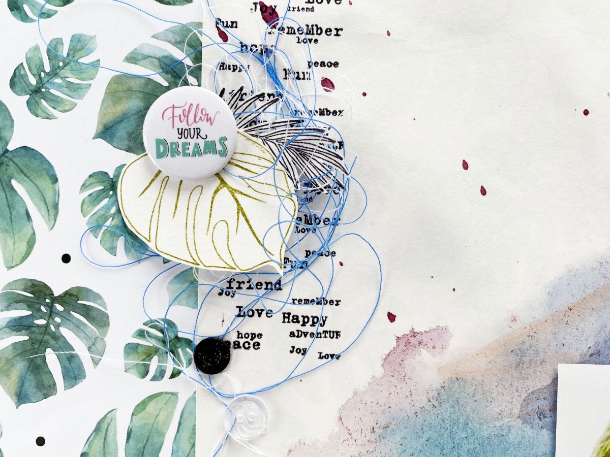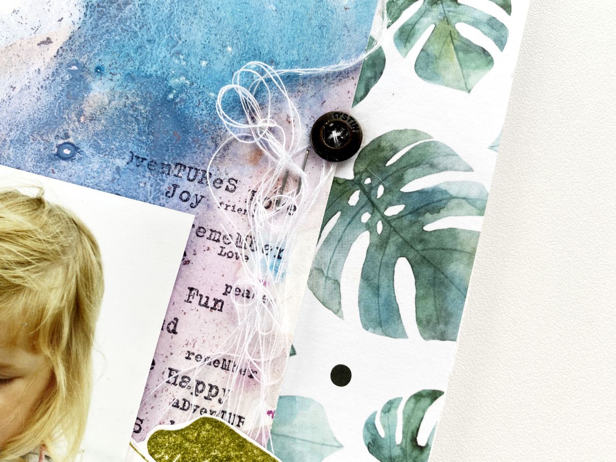 Теперь самый приятный этап - сбор и склейка странички. Для декора я взяла фишку и вырезанные оттиски листья пальм и монстеры, швейные нитки для объема и пуговки