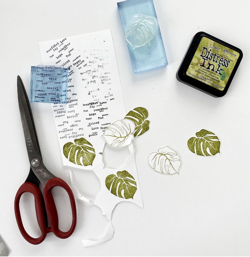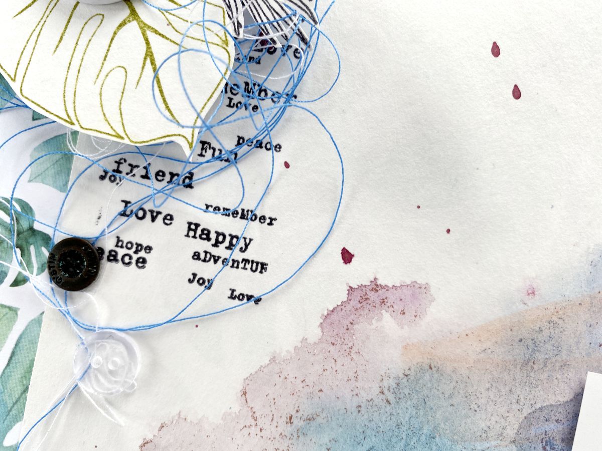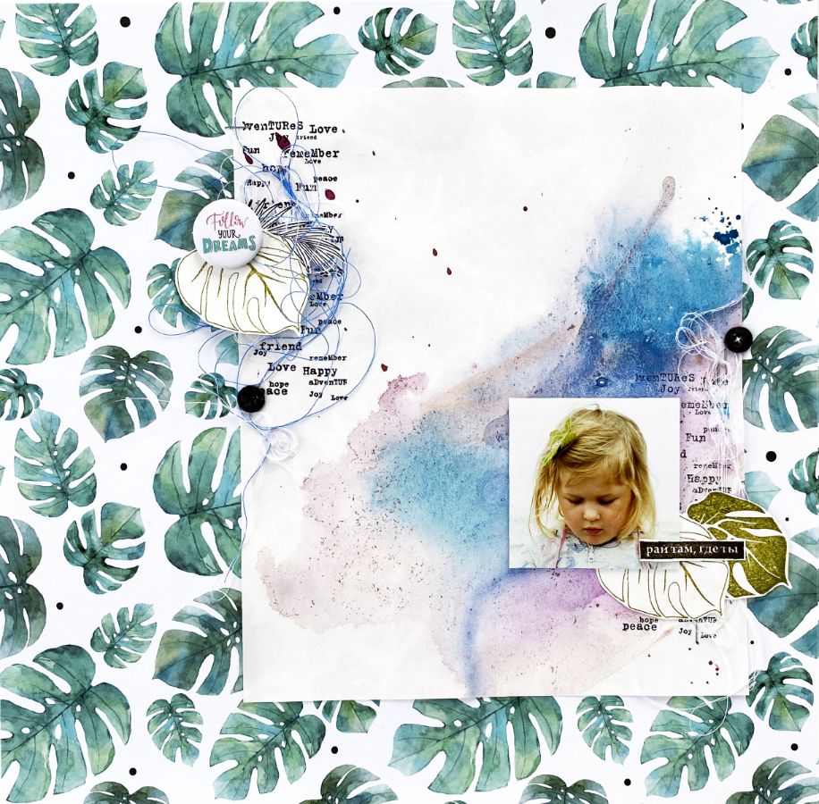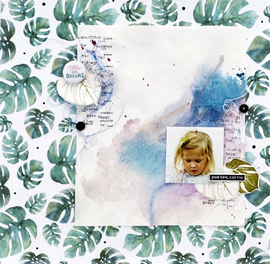Теперь самый приятный этап - сбор и склейка странички. Для декора я взяла фишку и вырезанные оттиски листья пальм и монстеры, швейные нитки для объема и пуговки