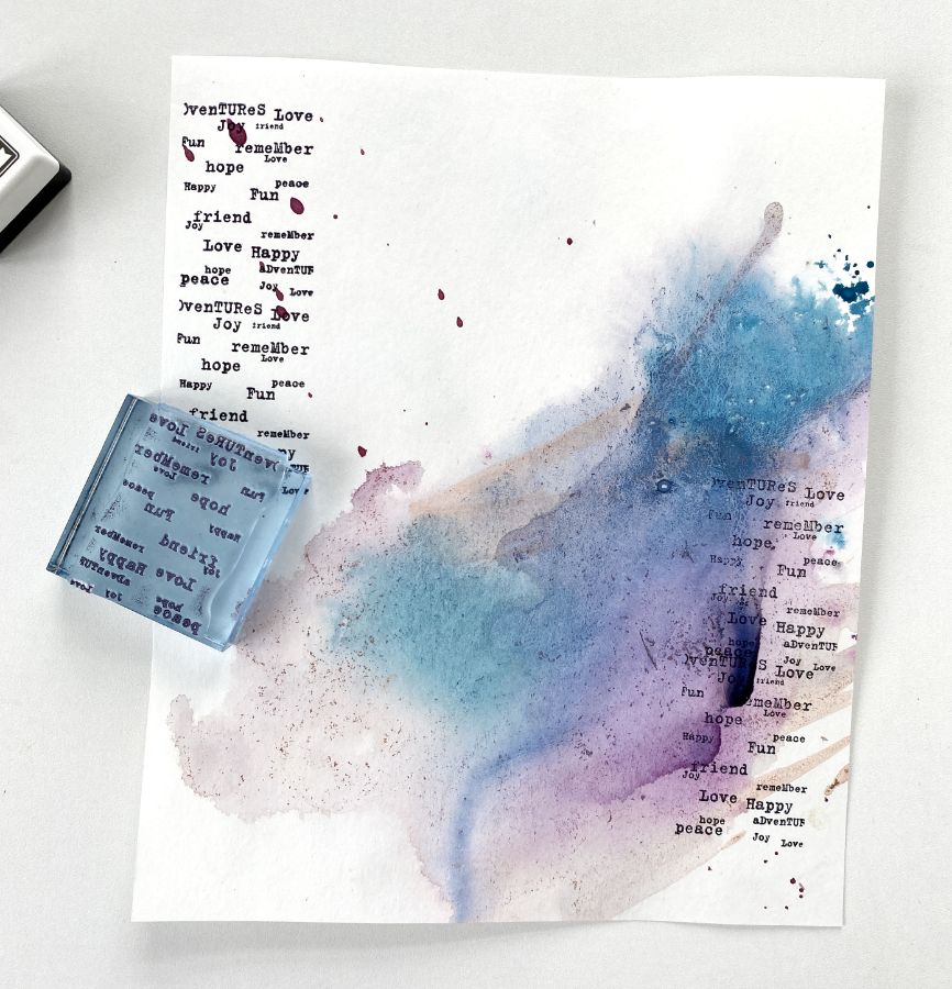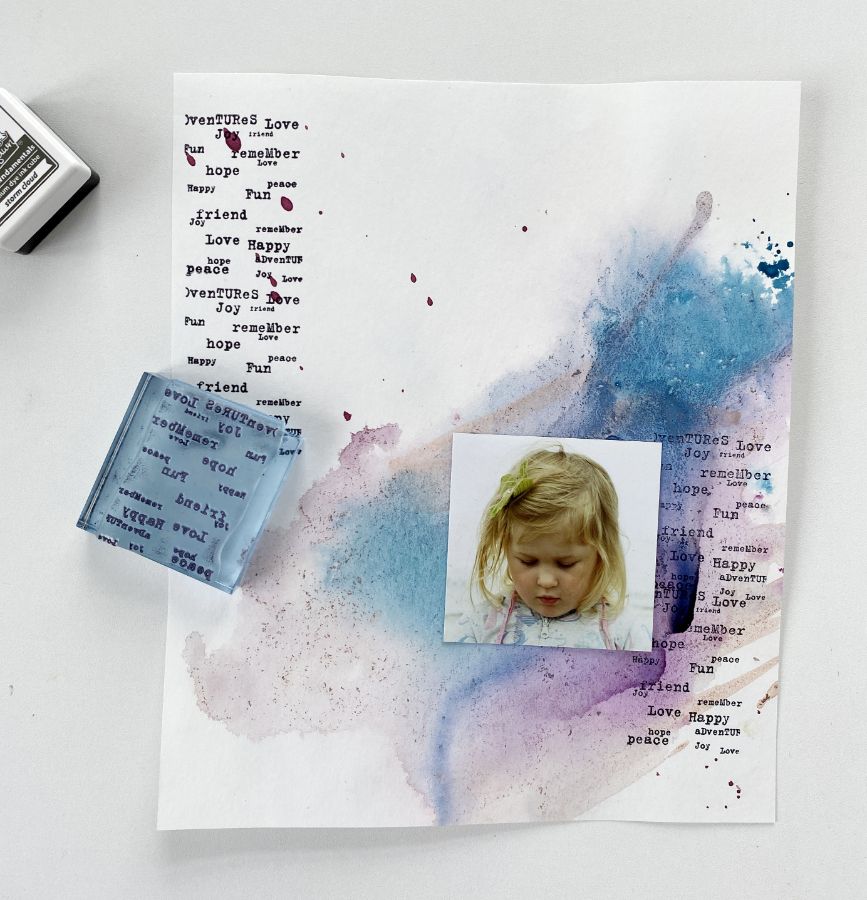 Примерив, где на листе будет фотография с декором, начинаем штамповать фон. Под фото оттиски пусть будут не яркие, смазанные, т.к. там главная роль у других деталей. А в левом углу надо создать композиционный акцент, там ярче. Рисунок штампа рваный, разбитый на отдельные слова, поэтому можно пропечатать его весь целиком. Будь фон более "кирпичный", требовалось бы стирание чатси чернил, чтобы возникало ощущение сходы на нет, растворения в листе.