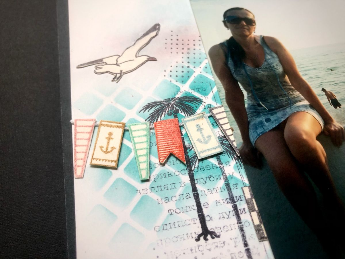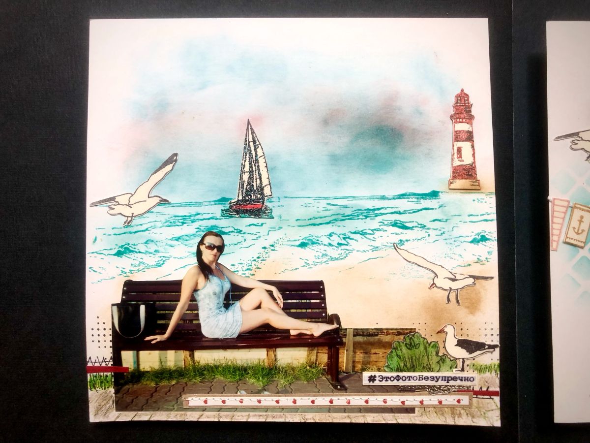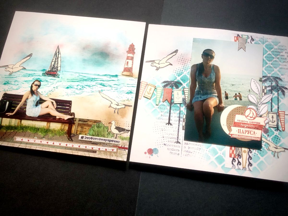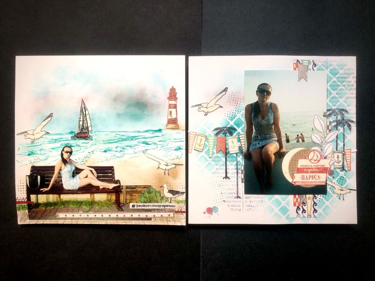 Первый разворот создан с помощью ФП штампов : "ЕВ.Парусник мал" , "ЕВ.Прибрежные волны" ,набора "Чайки","Точки инверсия", набора "Мой капитан", набора "Морской", "Штриховка 2",набора "Вечер в парке" , "Хештеги Фото дня", "Пальма",набора "Цветущий сад",набора "Прикосновение" и трафарета "Пергола 19*19 см"
