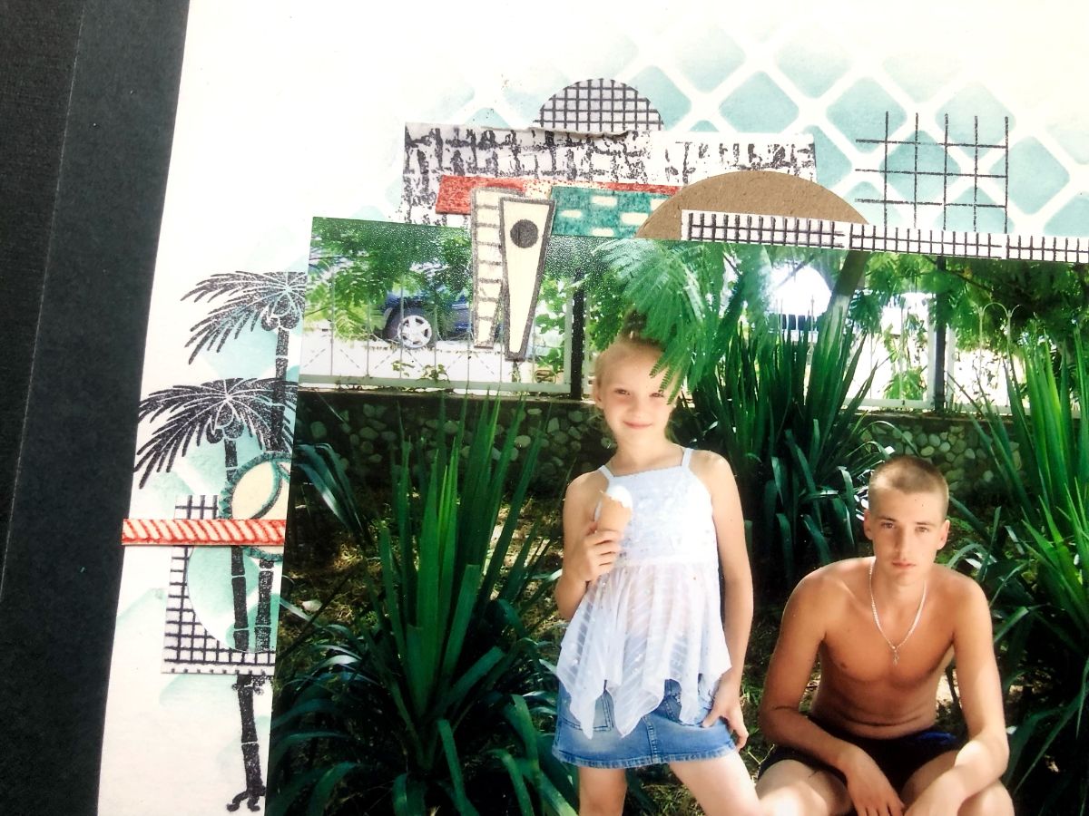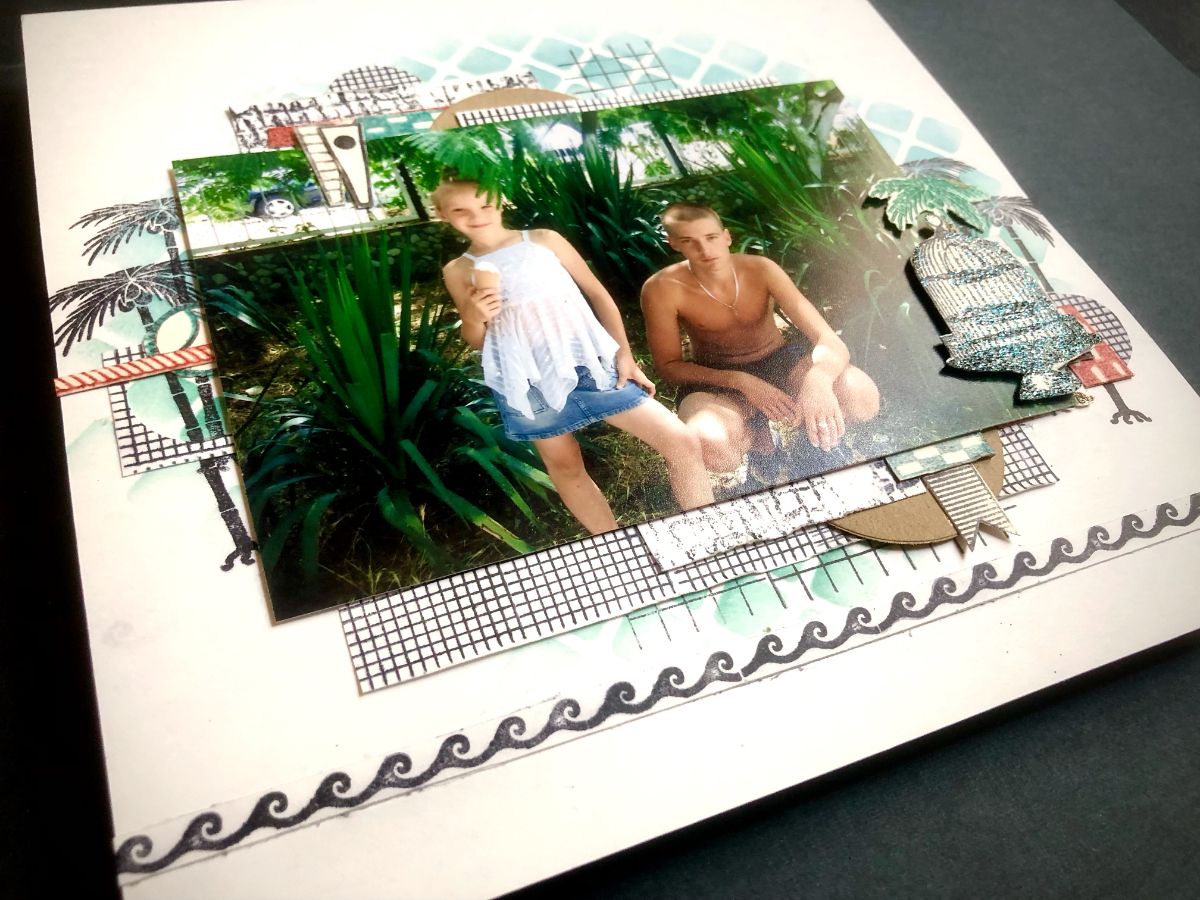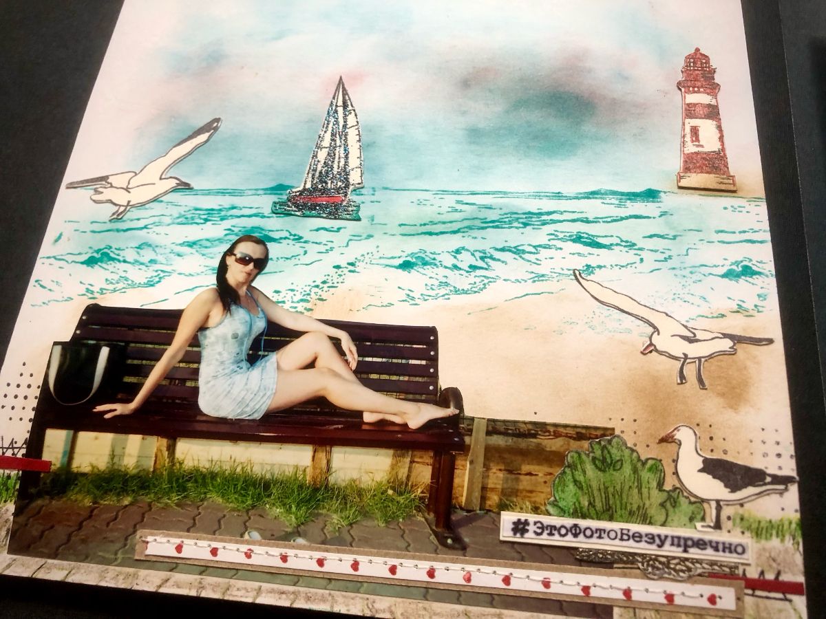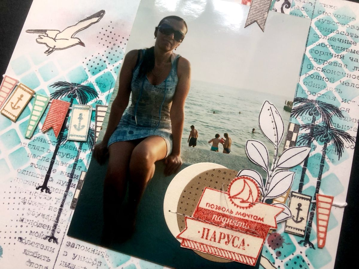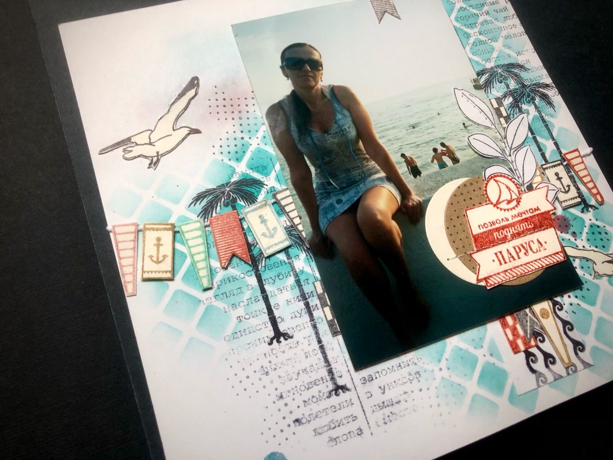 Первый разворот создан с помощью ФП штампов : "ЕВ.Парусник мал" , "ЕВ.Прибрежные волны" ,набора "Чайки","Точки инверсия", набора "Мой капитан", набора "Морской", "Штриховка 2",набора "Вечер в парке" , "Хештеги Фото дня", "Пальма",набора "Цветущий сад",набора "Прикосновение" и трафарета "Пергола 19*19 см"