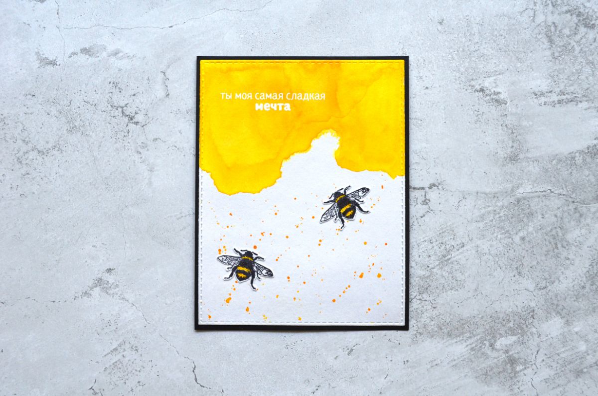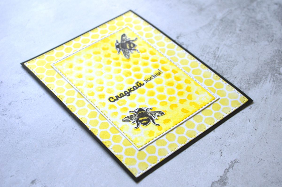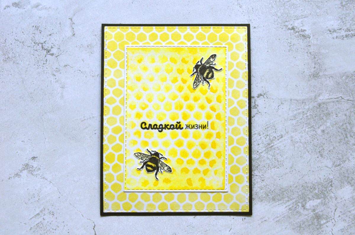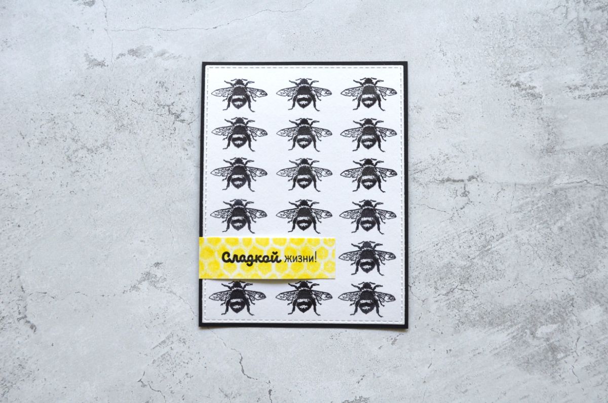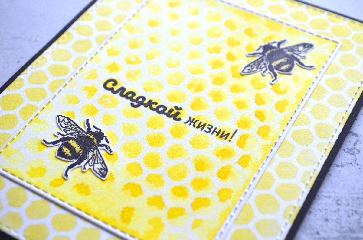 Еще одна открытка, тон которой задает фон, который я сделала с помощью трафарета. Все внимание на жужжащих красавицах и контрастной надписи.