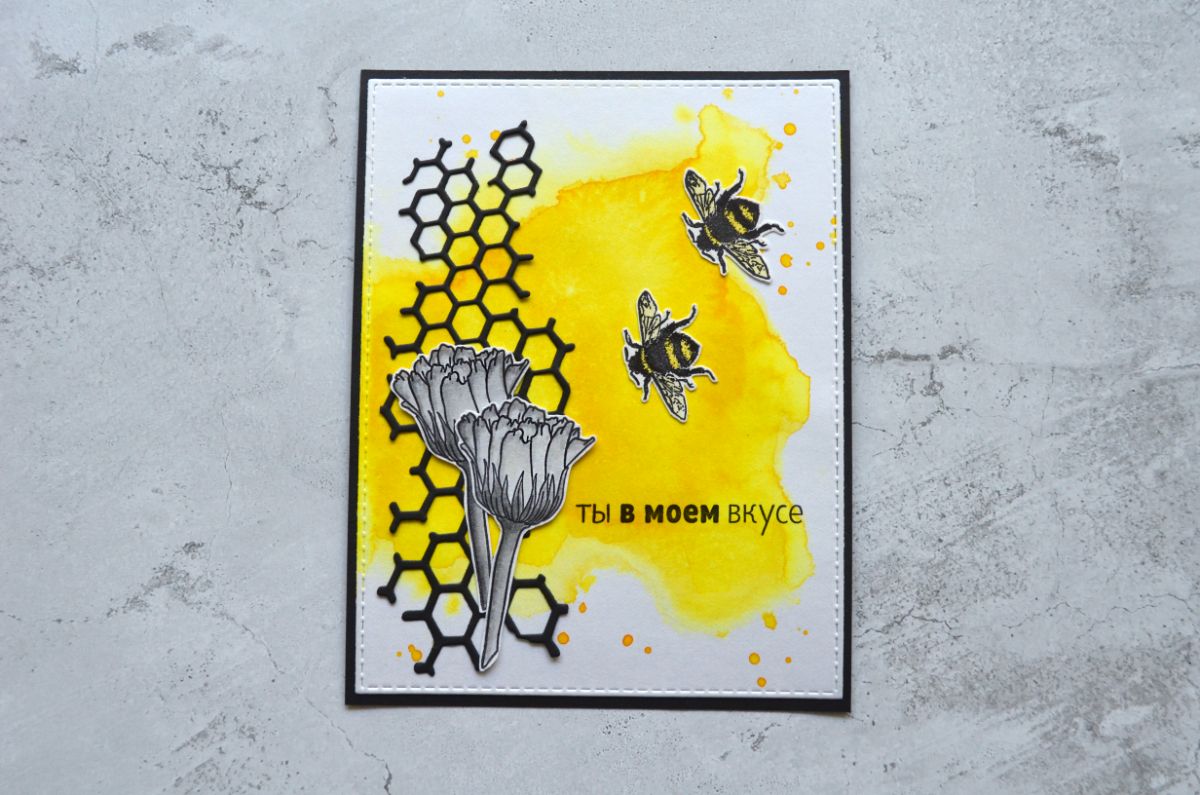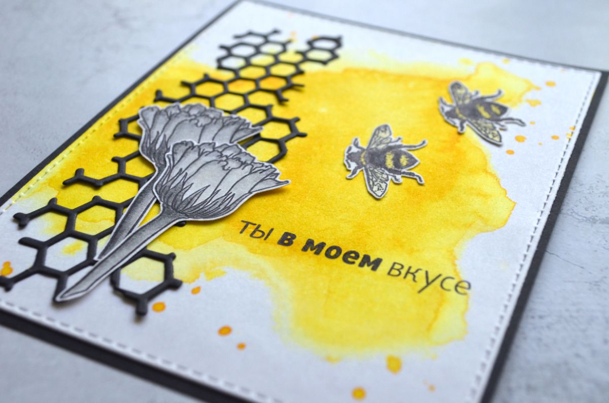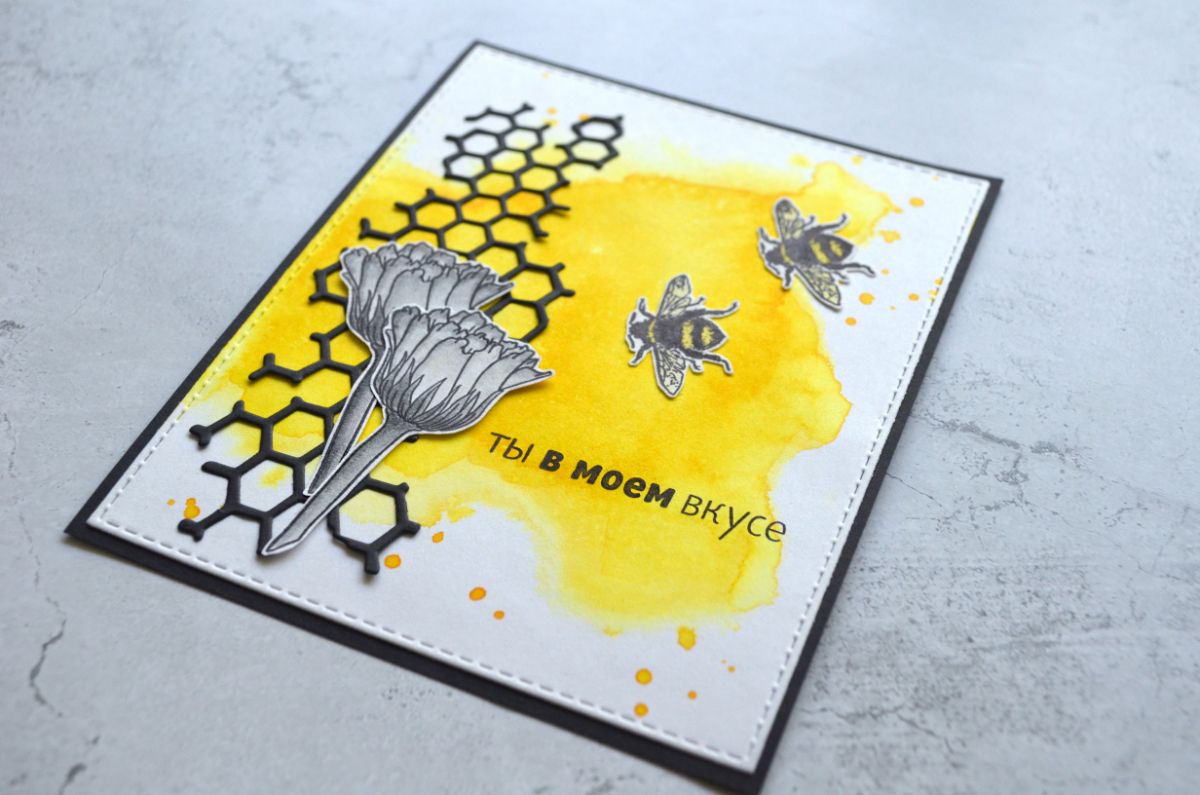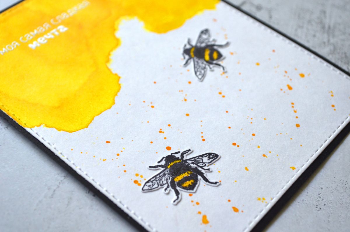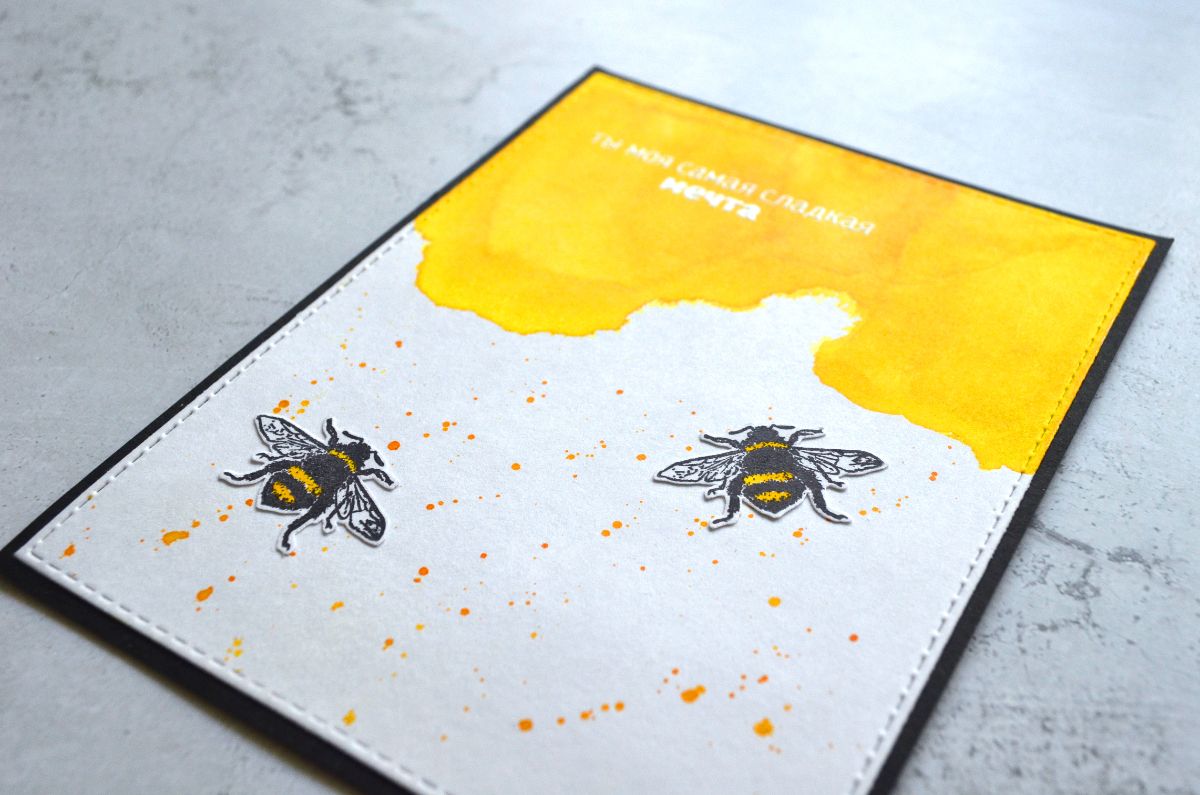 Еще одна открытка, тон которой задает фон, который я сделала с помощью трафарета. Все внимание на жужжащих красавицах и контрастной надписи.