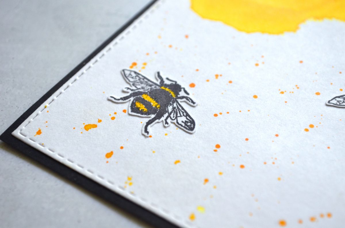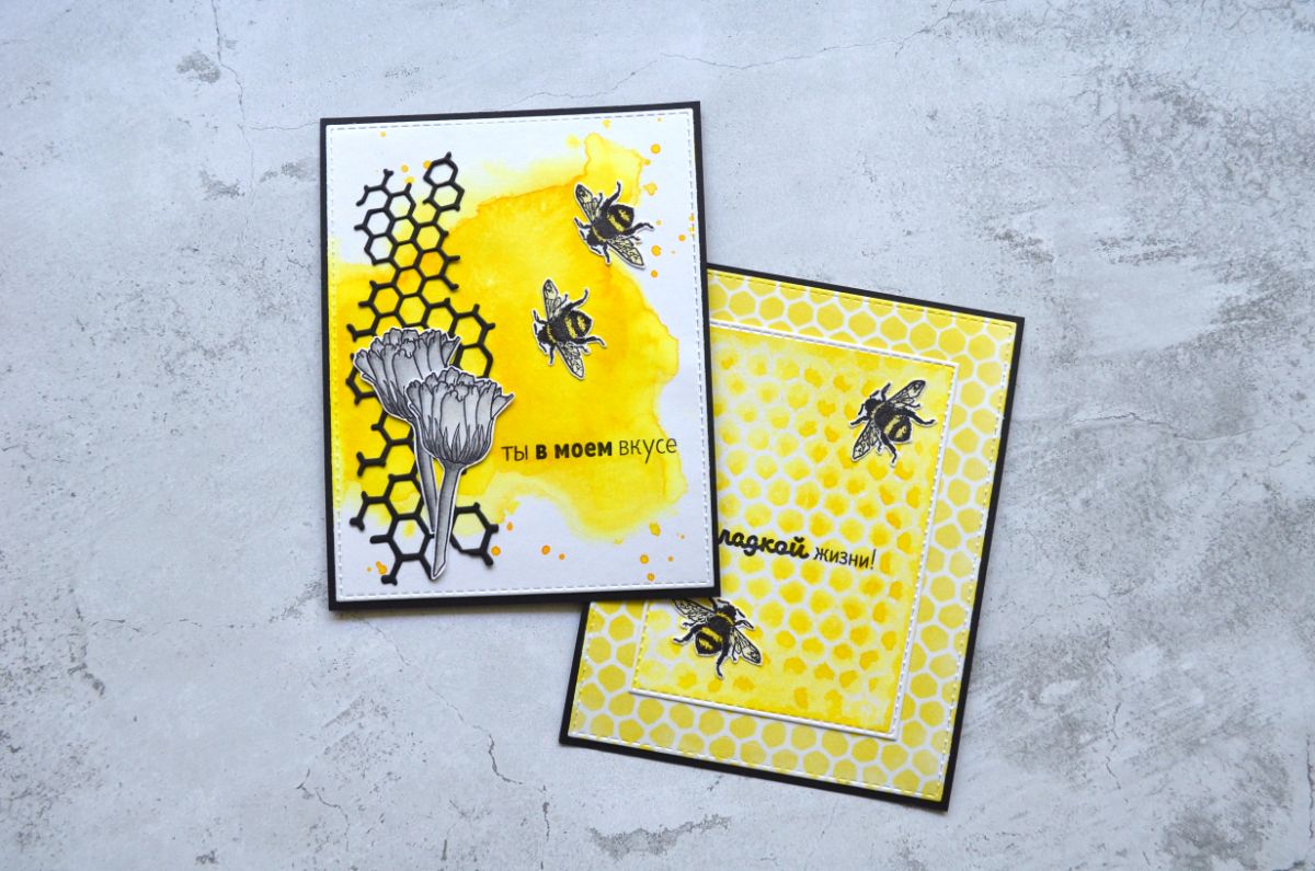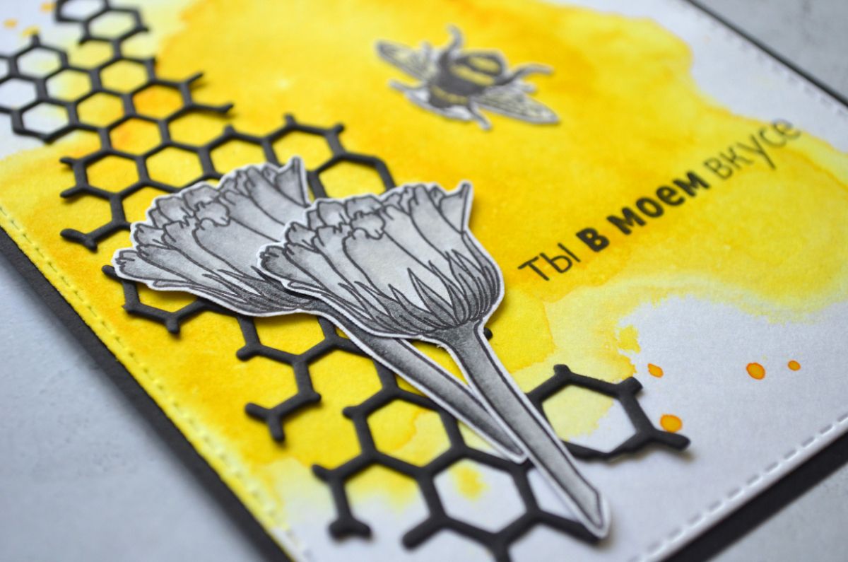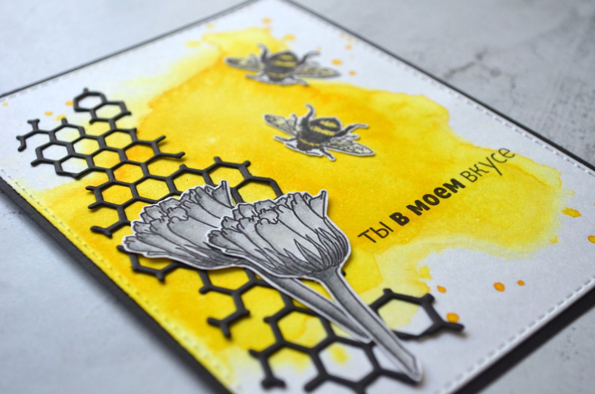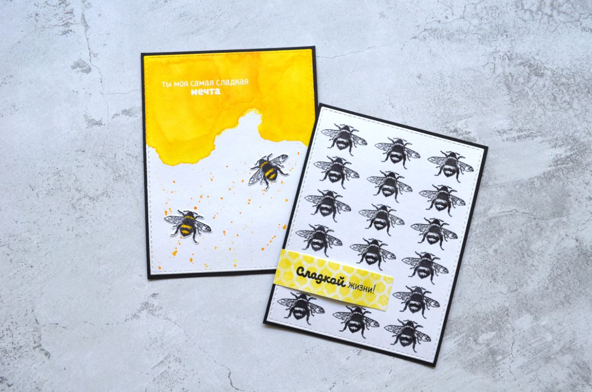 Еще одна открытка, тон которой задает фон, который я сделала с помощью трафарета. Все внимание на жужжащих красавицах и контрастной надписи.