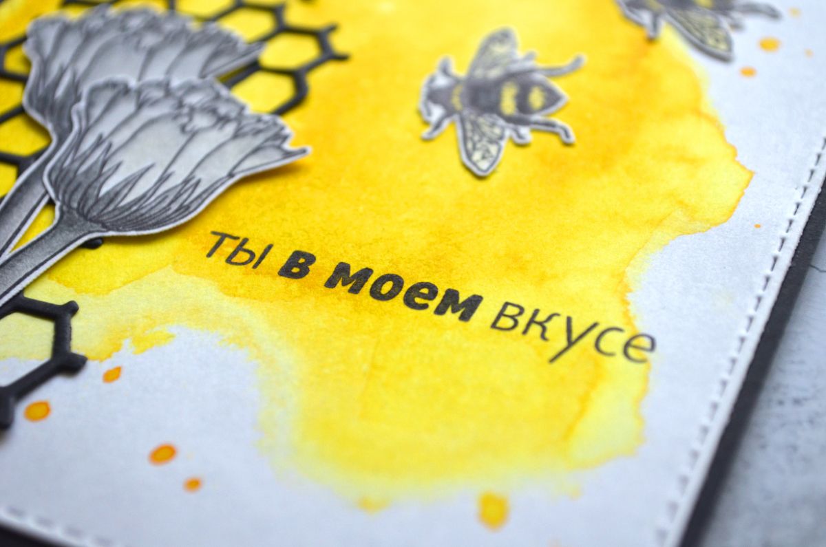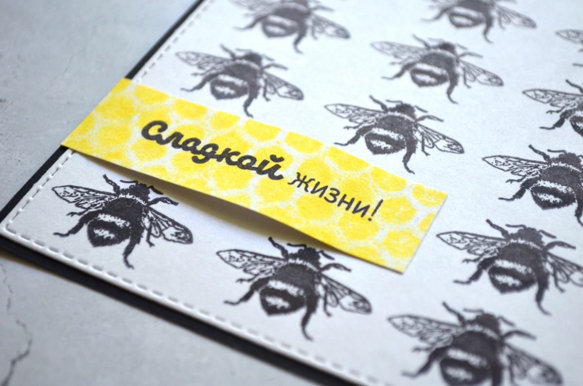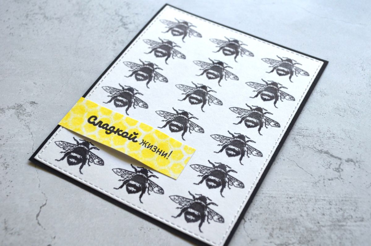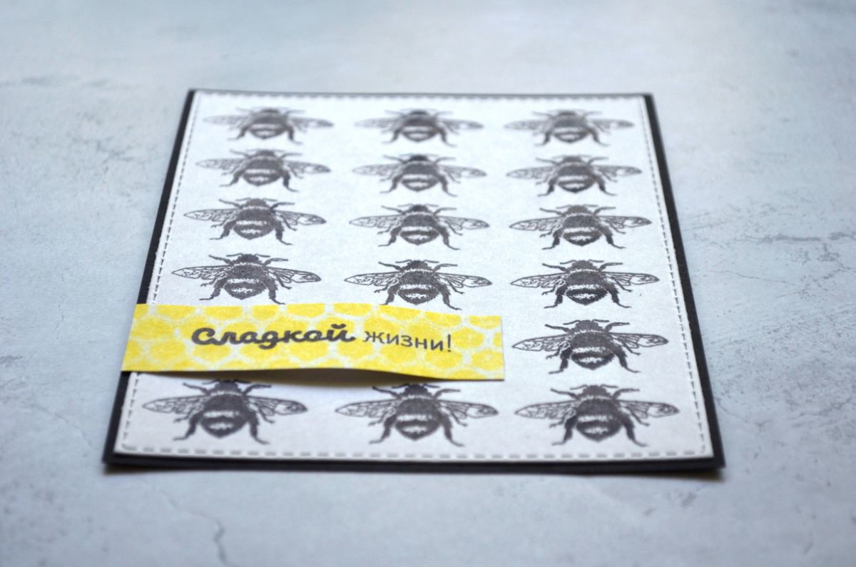 Красота и эффектность оттиска Пчела в монохроме. На этой открытке есть объемный хлястик с заголовком Сладкой жизни. В него можно вставить небольшую шоколадку или конфету.