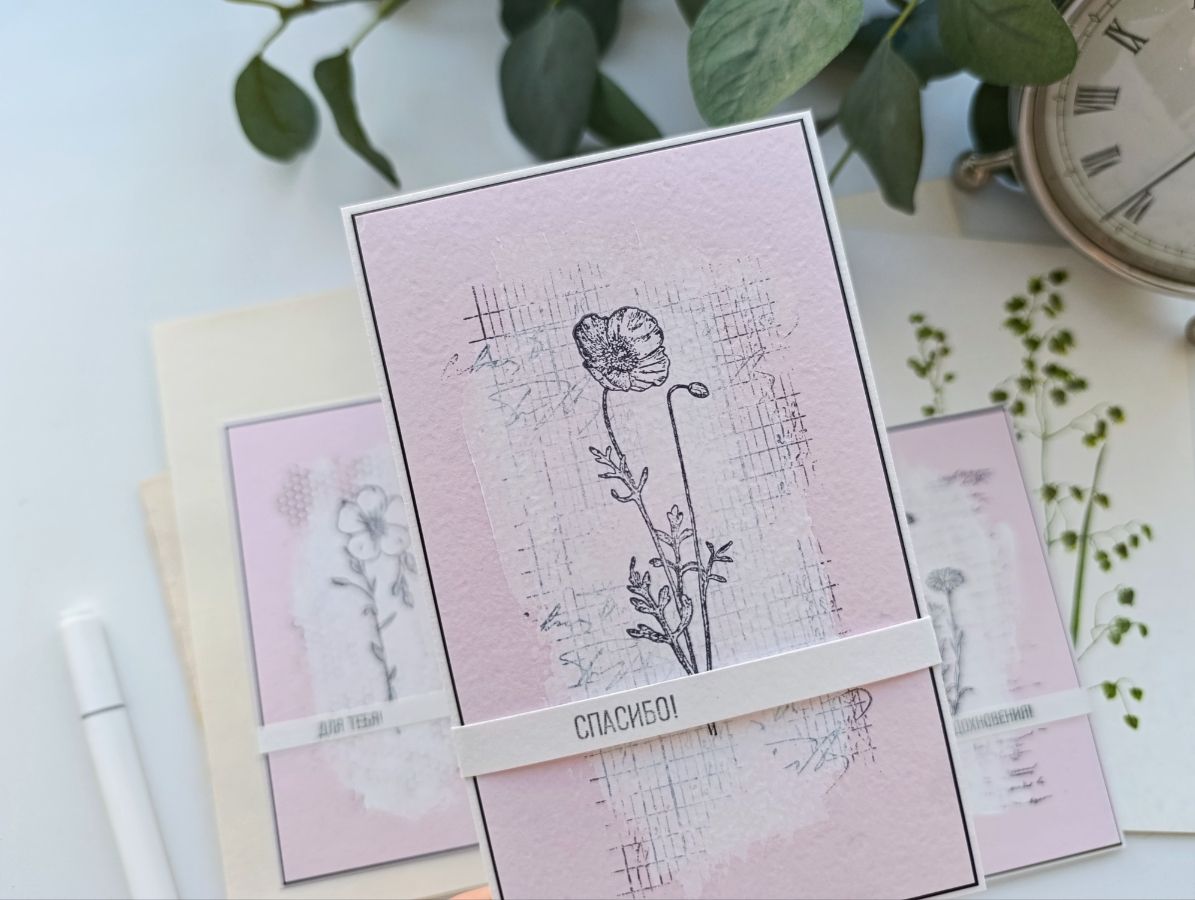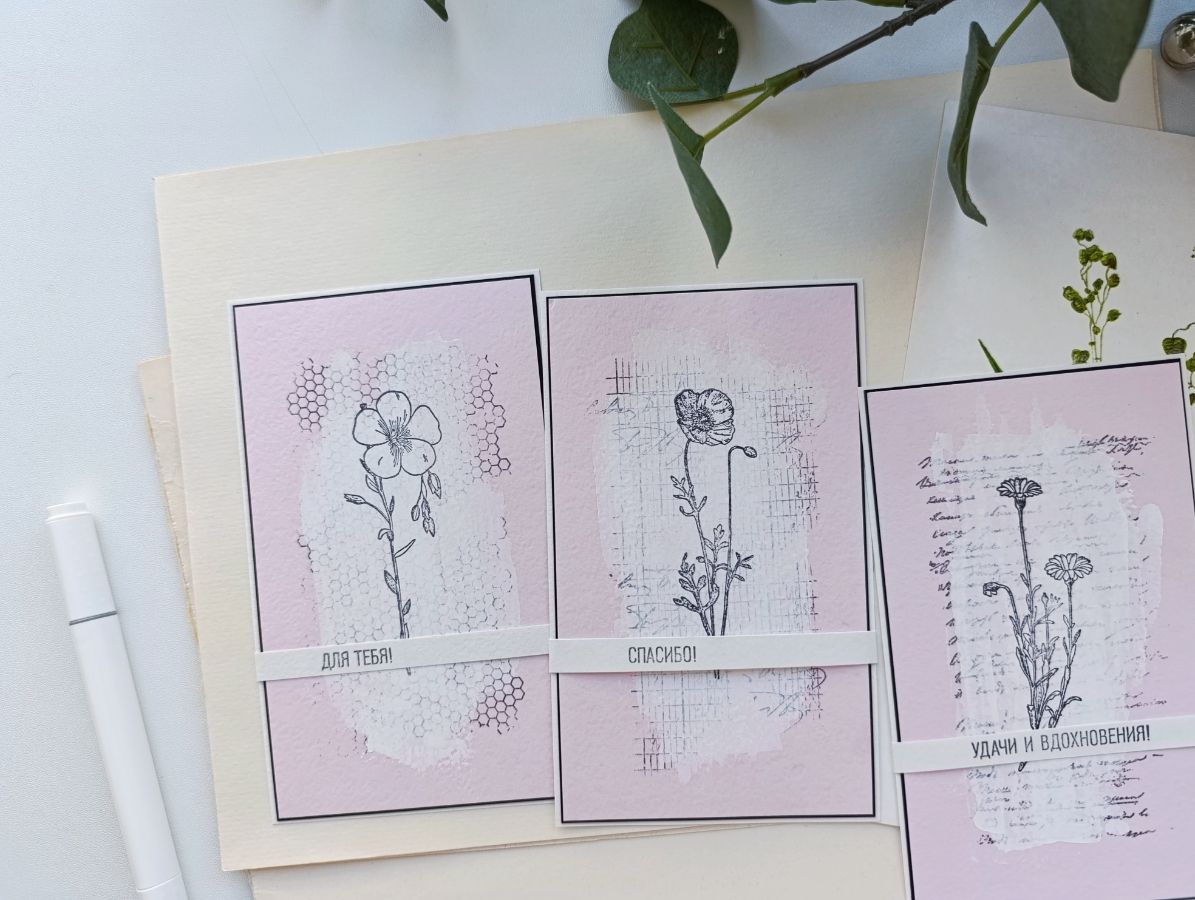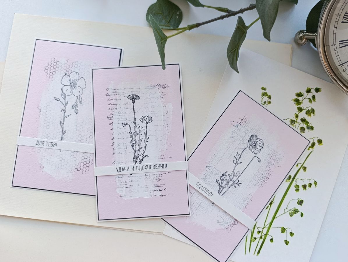 Чудесный "букет" на открытках у меня сложился из штампов Лен обыкновенный, Ветряной мак и Ноготки.