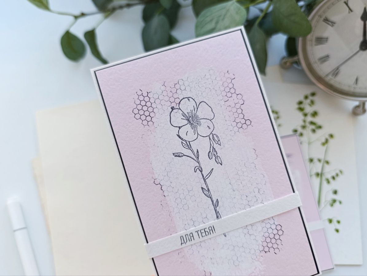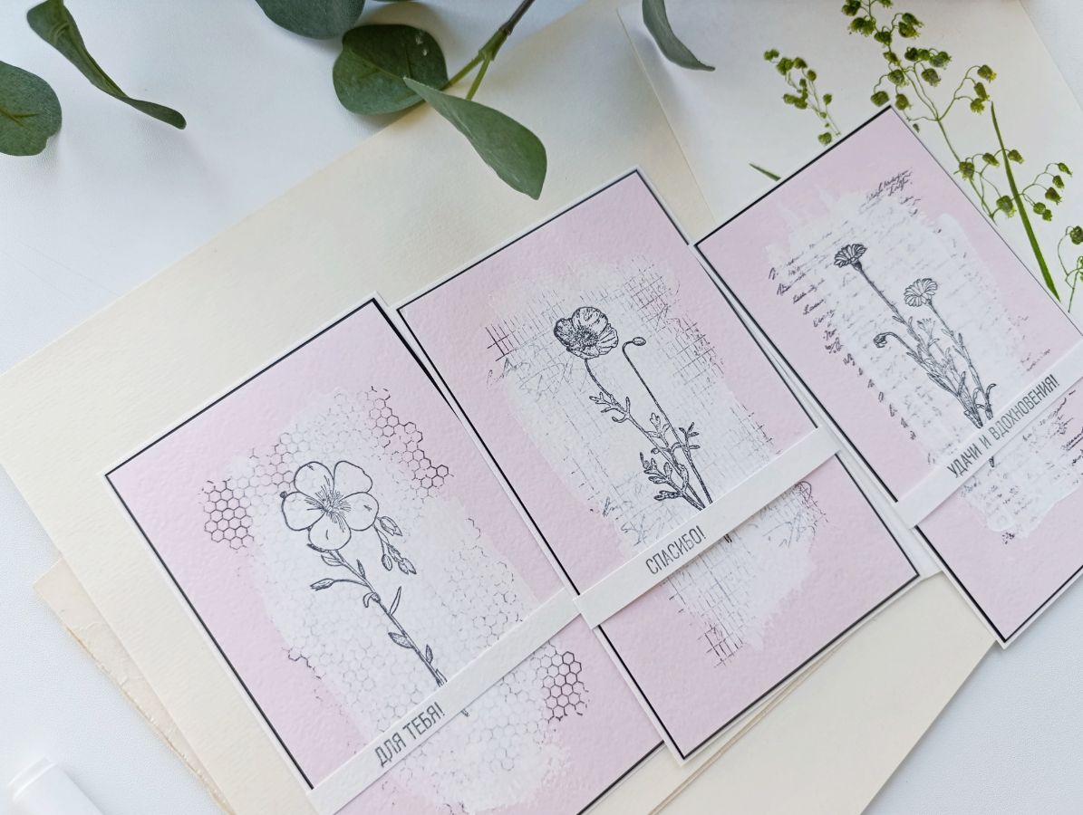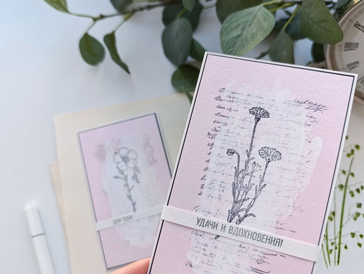 Чудесный "букет" на открытках у меня сложился из штампов Лен обыкновенный, Ветряной мак и Ноготки.
