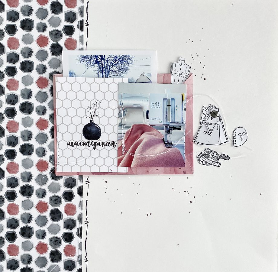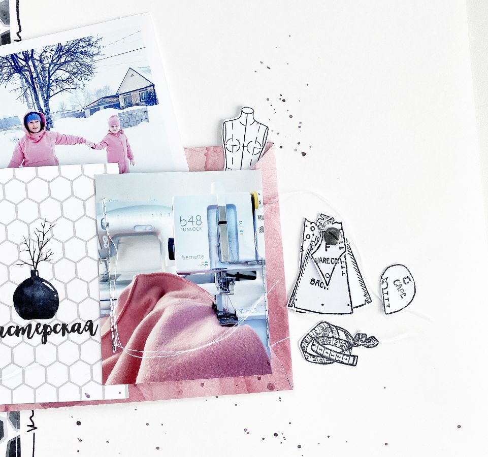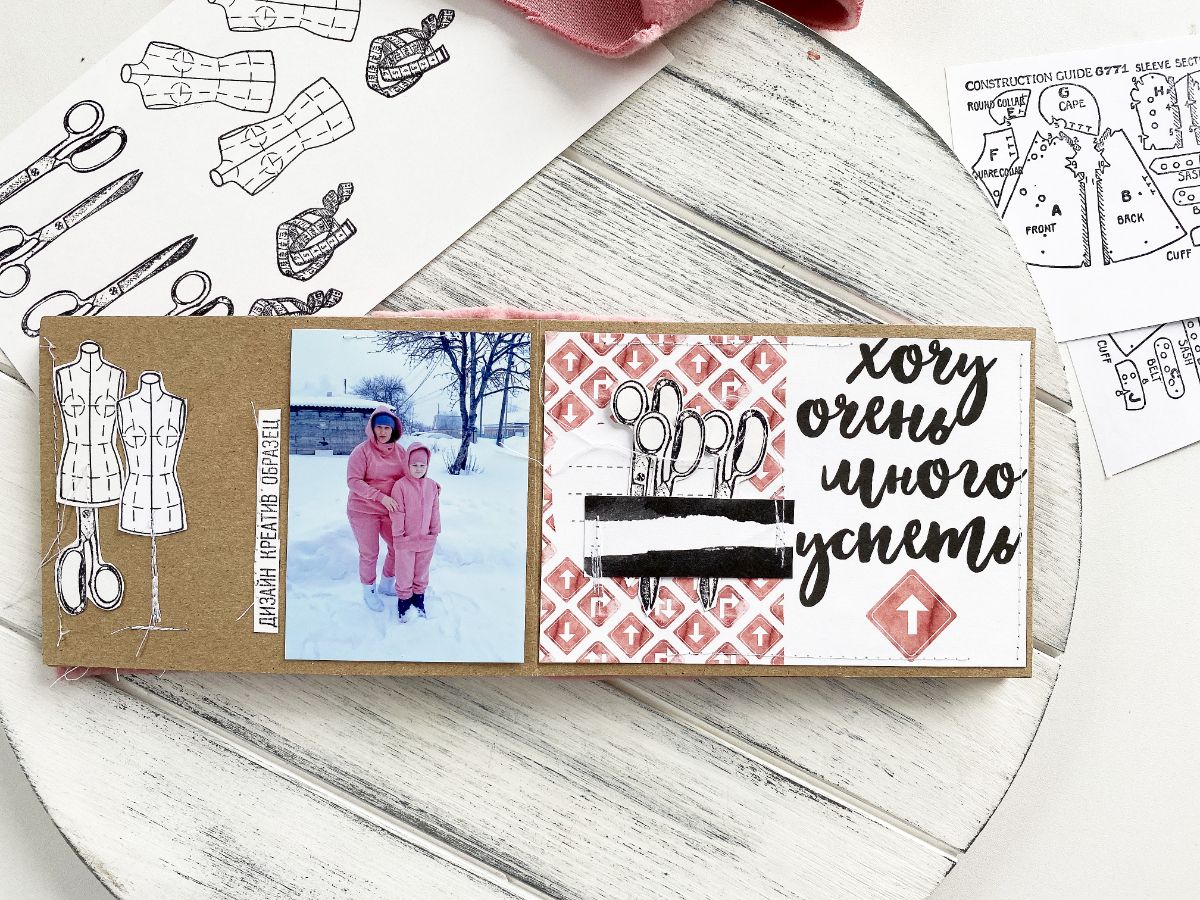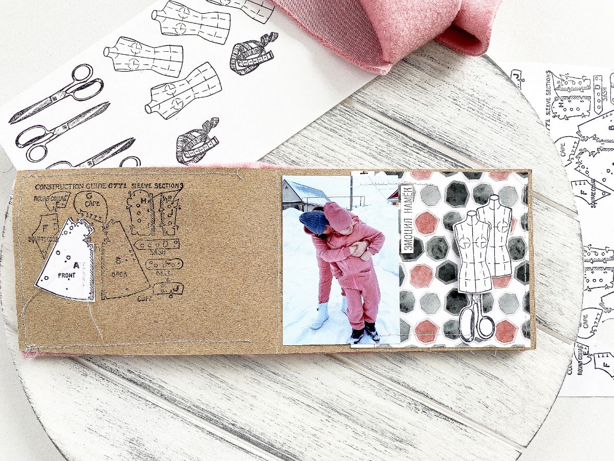 На разворотах использовала разные приемы со штампом Выкройка детского пальто, он использован в качестве фонового штампа и вырезанные элементы , как на страничках