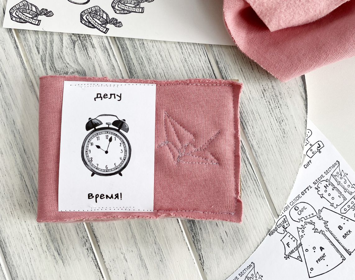 Миниальбом, обложку сделала из той же ткани, что костюмы на фото и раз уж альбом о шитье, то и прострочила для общей картинки птицу счастья, прямой строчкой на обложке