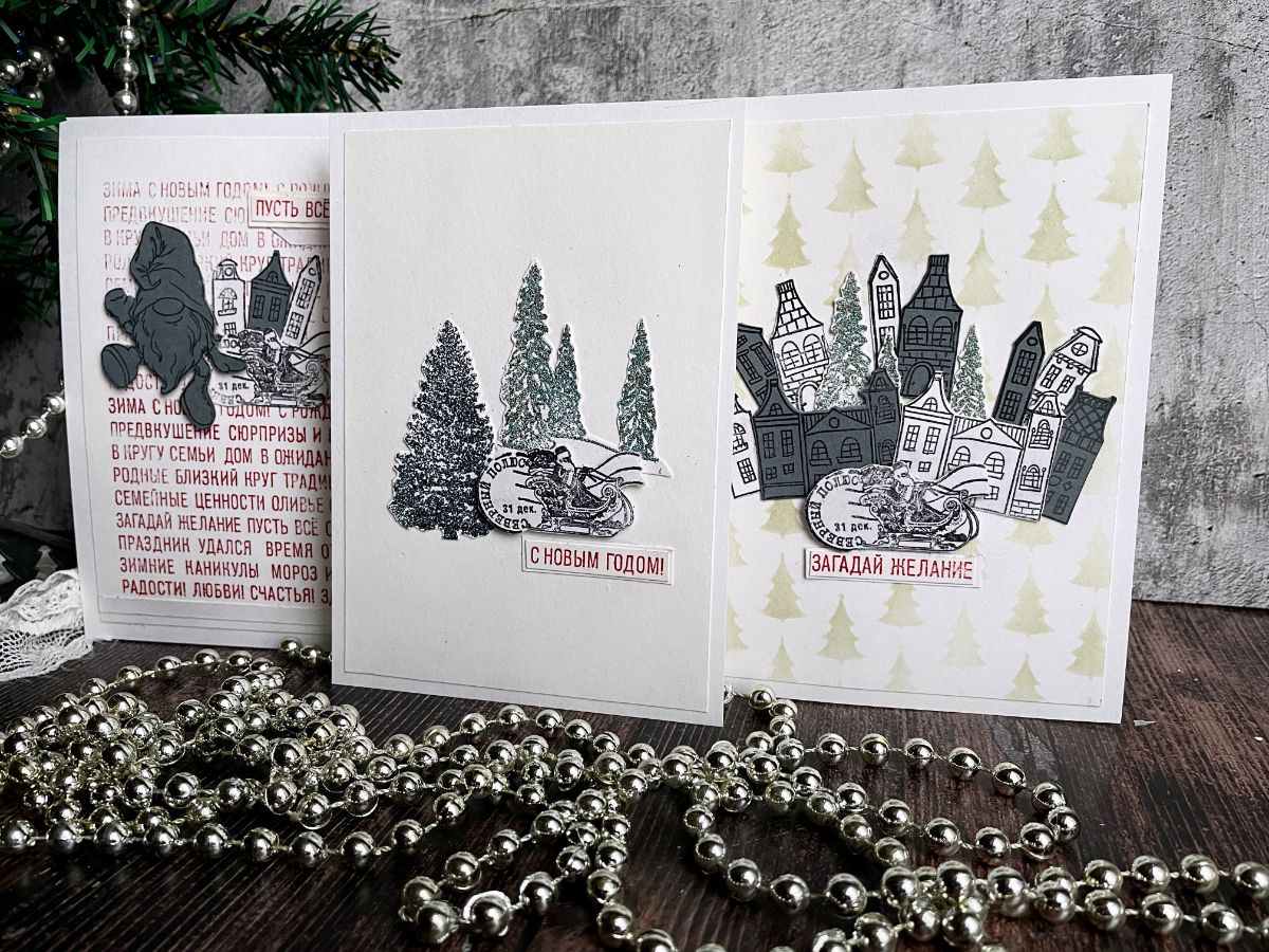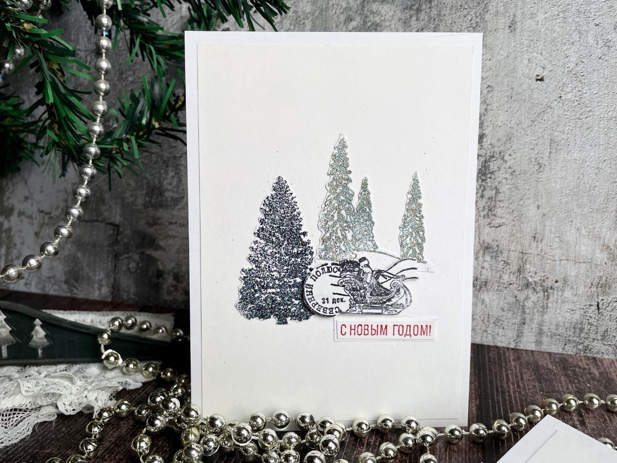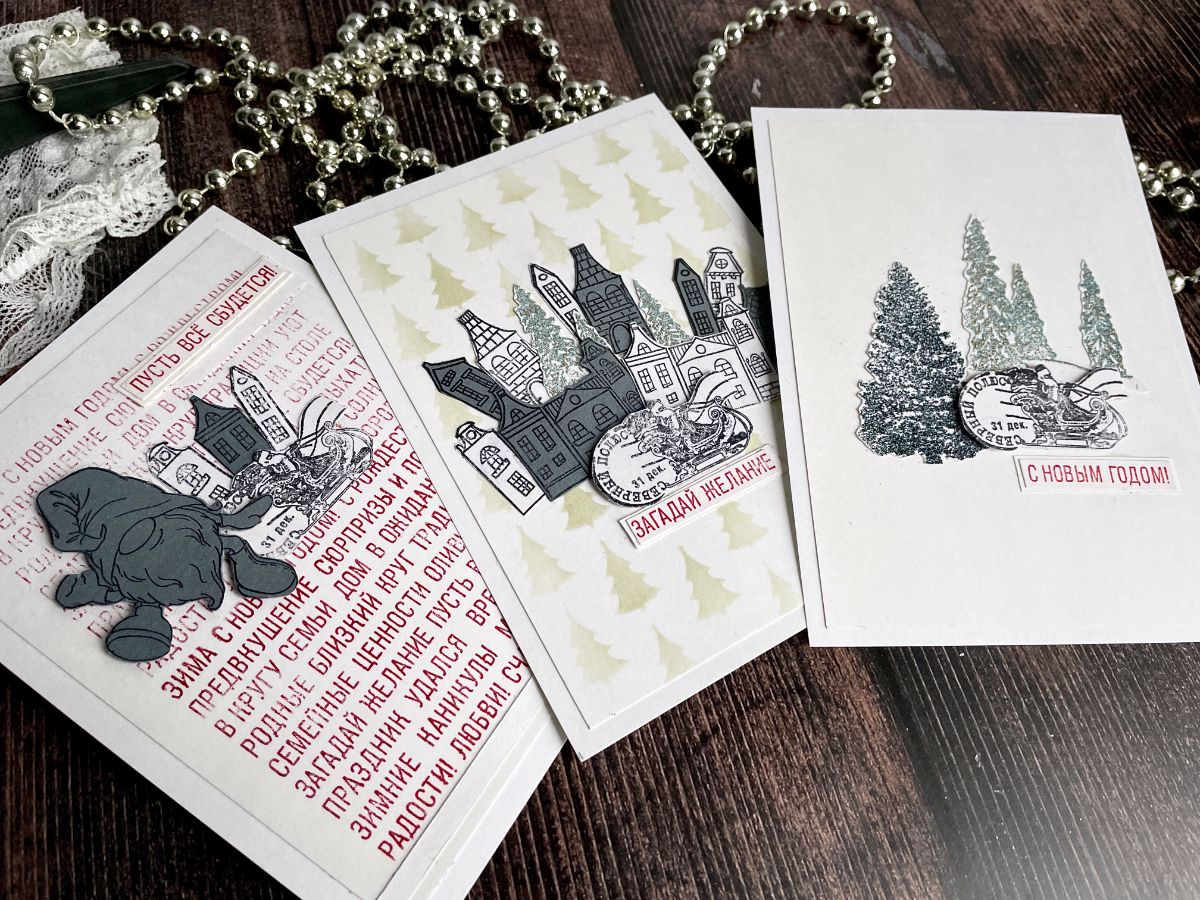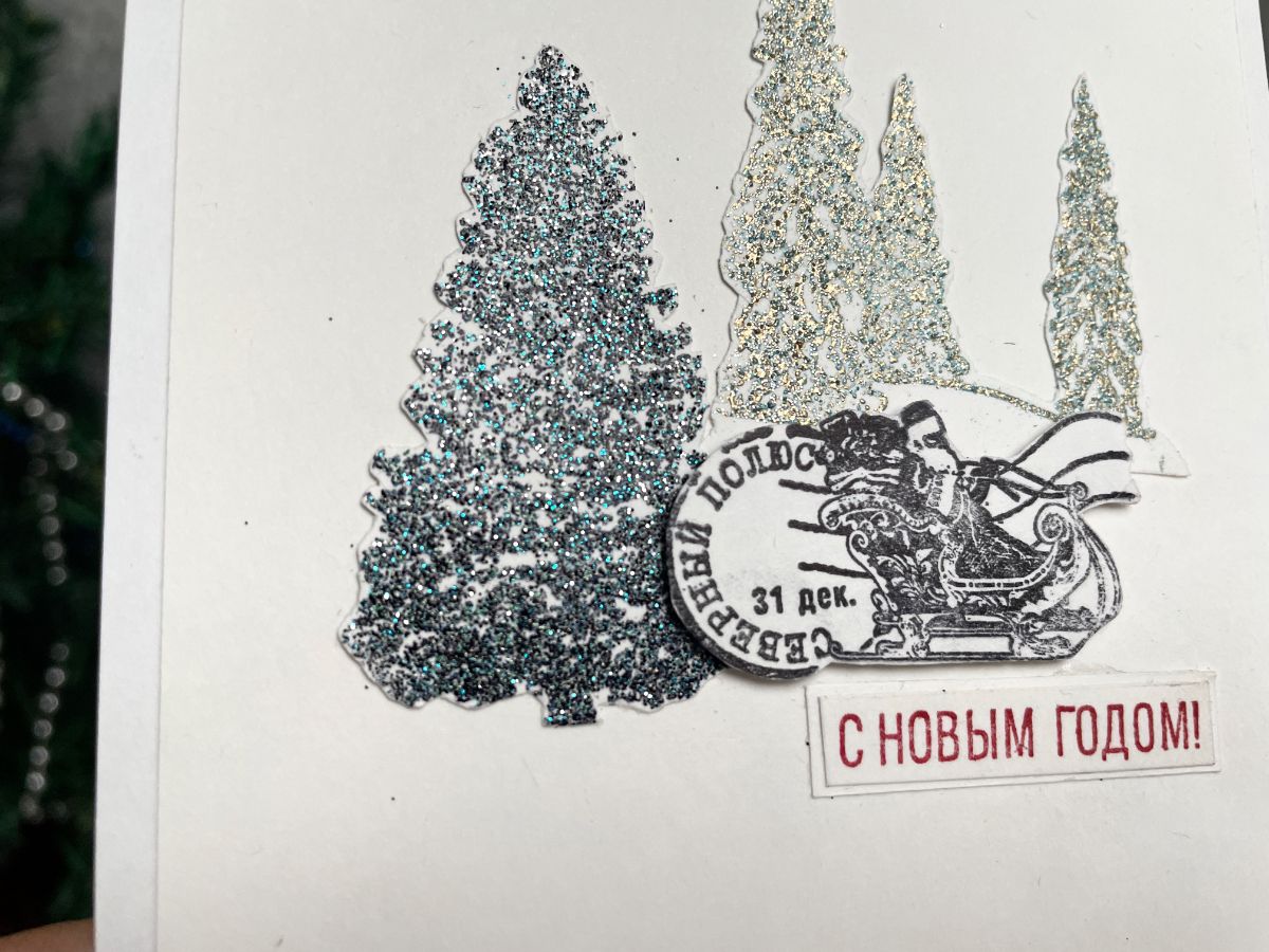 На первой открытке ёлочки сделала с эмбоссингом и оттиск штампа с Дед Морозом приподняла на картон