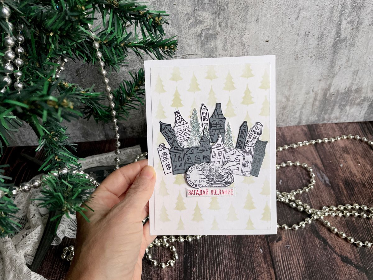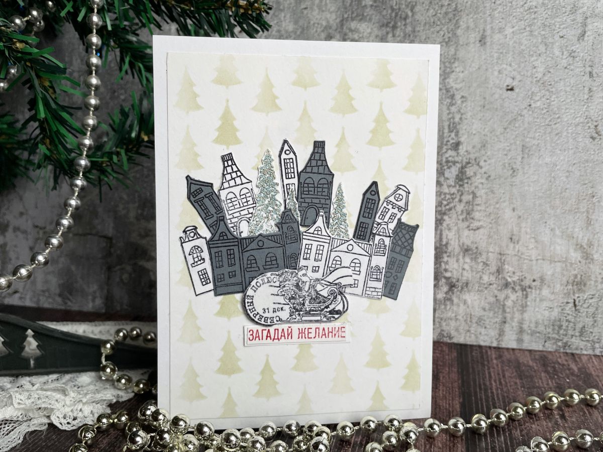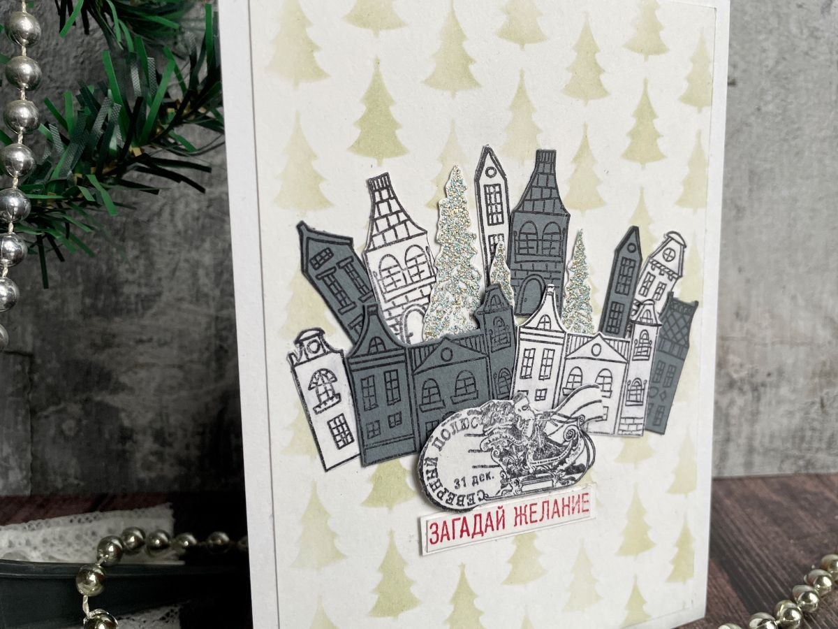 Вторую открытку украсила домиками, символизирующими город, в который спешит на санях Дед Мороз с Северного Полюса.