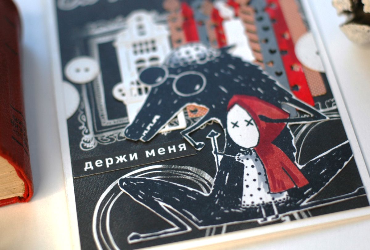 Есть штампы универсальные и удобные для любого случая, а есть штампы с характером, которые не всегда ко двору, так как могут быть взбалмошными, опасными, неоднозначными и даже норовить укусить. Завелись такие и в Питерском скрапклубе. Это волк, у которого неизвестно, что на уме, он, хоть и умеет вязать, но зубы имеет острые. И Красная Шапочка, девочка крези и без тормозов. Но ведь и им хочется на открытки. Пришлось пустить.