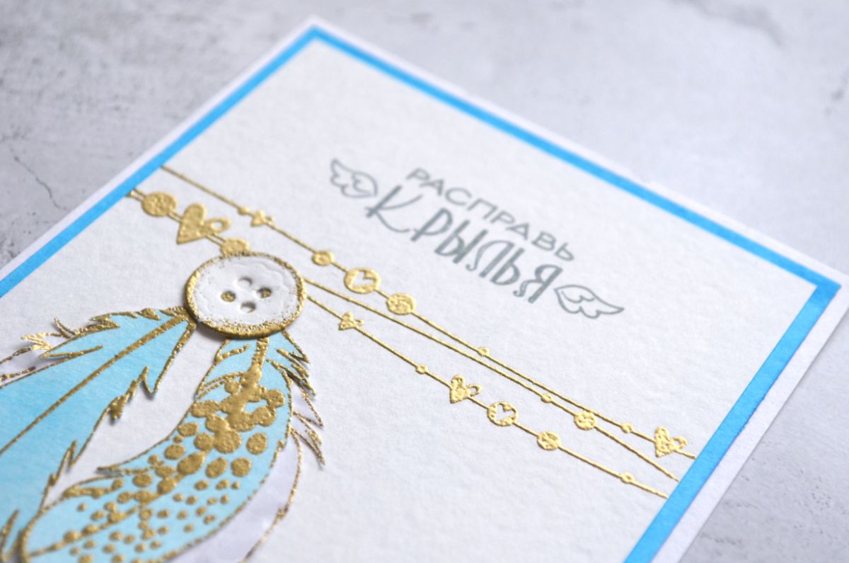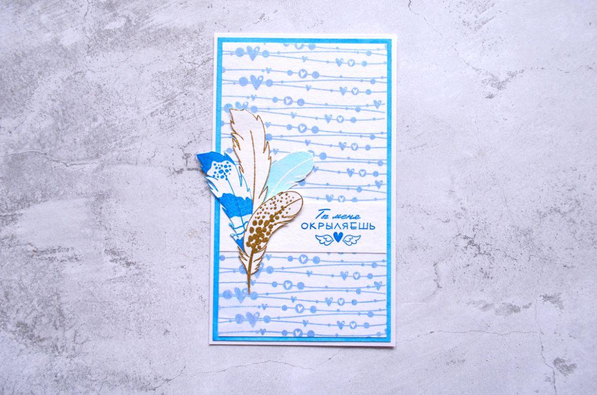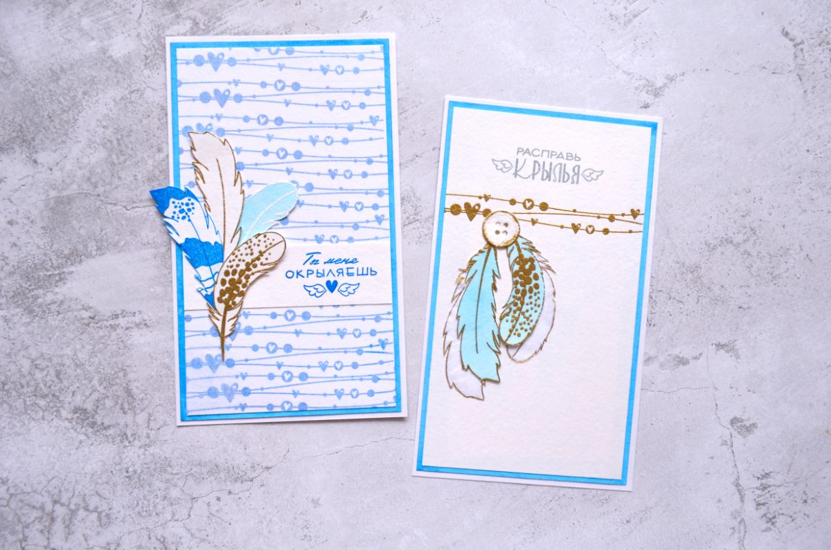 Чудесные надписи Ты меня окрыляешь и Расправь крылья стали оригинальными заголовками моих работ. А замечательные Перышко 1 и Перышко 2 оказались очень вариативными для применения в качестве декора, потому что каждое перышко можно не только сделать контурным, но и добавить штамповый рисунок внутри.